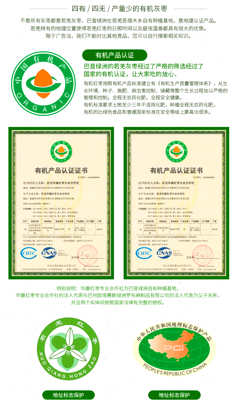 每一颗巴音绿洲若羌有机灰枣,都要经过6重的清洗,2重的灭菌,3重的筛选,以确保有机枣的坏果率≤2%,沙尘可见杂质≈0,层层把关,安全卫生!