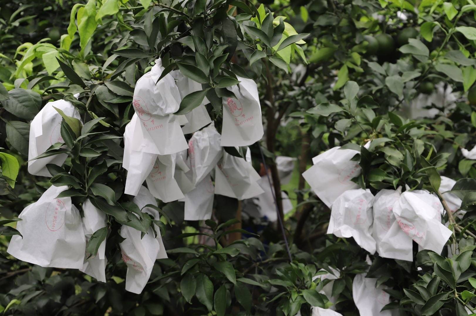 后期的爱媛我们都发套带果,套袋果品质更好。套袋技术,防虫害,防冻伤,提高果子品质 (果袋纯木浆纸袋绝对安全健康)
