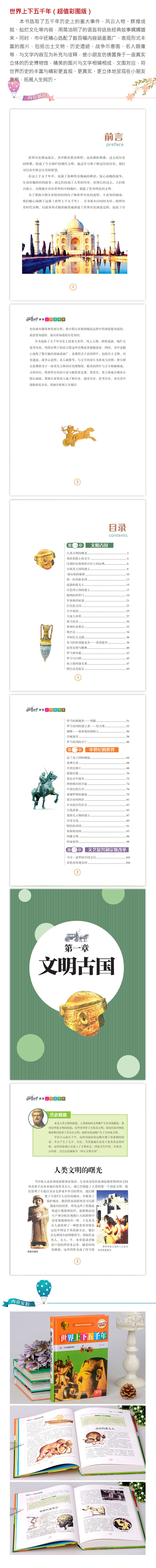 世界历史源远流长,其中既有繁荣辉煌,也有曲折艰难,过去的历史的积累,铸成了今天灿烂的现代文明。通过学习和了解过往的历史,我们可以从中体会生存的智慧。在这上下五千年中,充满了各种传奇瑰丽的神话,惊心动魄的战争,生动有趣的民间故事,而它们组成了人类的历史。在漫长的过去,人们各自独立、分散地生活在世界的不同地区,创造了各具特色的文明。为了帮助小朋友在较短时间内了解世界历史的进程,丰富知识储备,我们精心编撰了这部《世界上下五千年》。全书基本以时间为序,按照历史时代分期,以故事形式精彩扼要地讲述了世界历史演进过程,包括了历史的基本脉络和发展历程,使小朋友在愉快阅读过程中得到最想知道的、最需要知道的、最应该知道的历史知识。