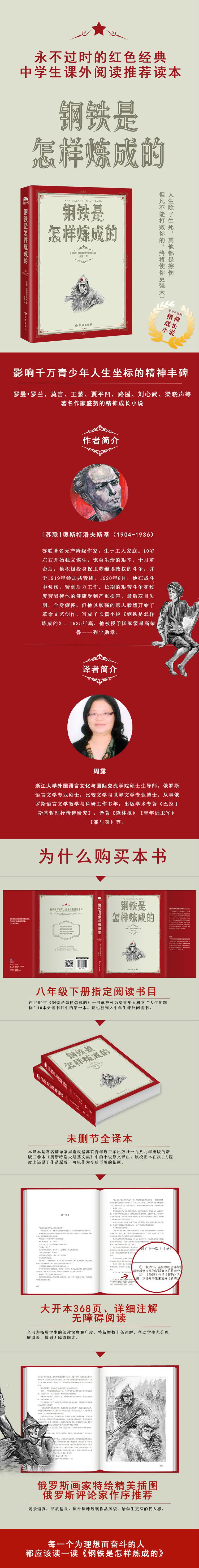 《钢铁是怎样炼成的》是一部关于“成长”的励志小说。小说成功塑造了保尔·柯察金共产主义战士的形象,刻画了保尔从一个自发的抗争者成长为自觉的革命战士的成长历程。保尔出生于战火硝烟的年代,社会的黑暗、生活的艰辛考验并磨炼着这个少年的意志。在老布尔什维克朱赫来的影响下,保尔的革命意志开始觉醒,走上了革命的道路。驰骋疆场、前线战斗、修筑铁路……经历了身体和精神的重重炙烤后,一名英勇顽强、自强不息的钢铁战士至此诞生。至今,保尔关于人生的思索仍是几代中国人的价值坐标,鼓舞了一代又一代青年人的成长。
