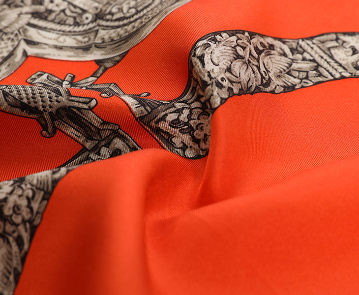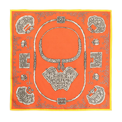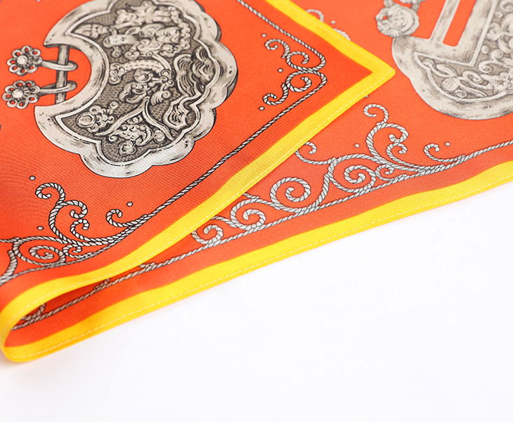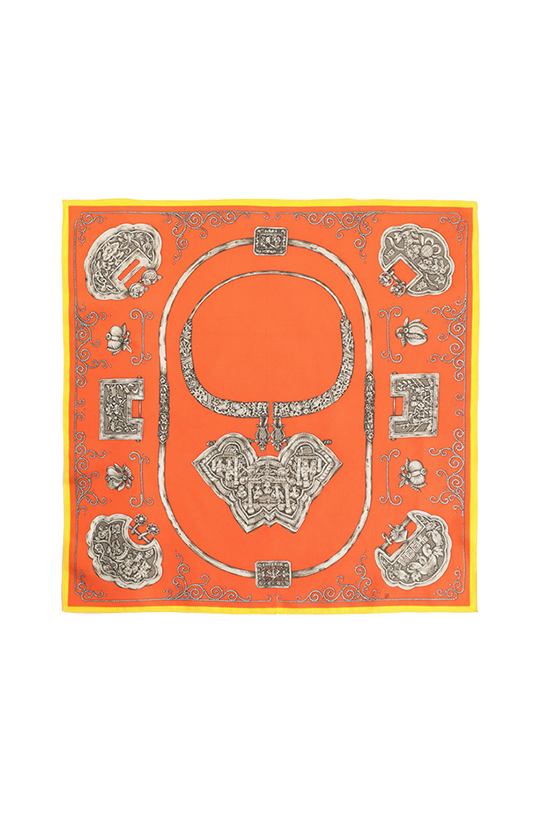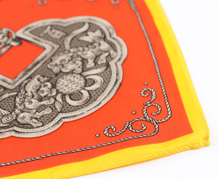 这款方巾由八个清代的银锁图案组成,图案或出自花鸟人物、或出自吉祥图案及民间传说,这些精美的银锁寄托着人们对于子女的美好愿望,祈求天上仙家护佑孩子健康成长。因此这款方巾设计就是将银锁的造型及图案用于绘画的手段展现出来,将传统的图案和繁复的造型配以简单艳丽的高纯度底色,对比强烈,现代感极强。