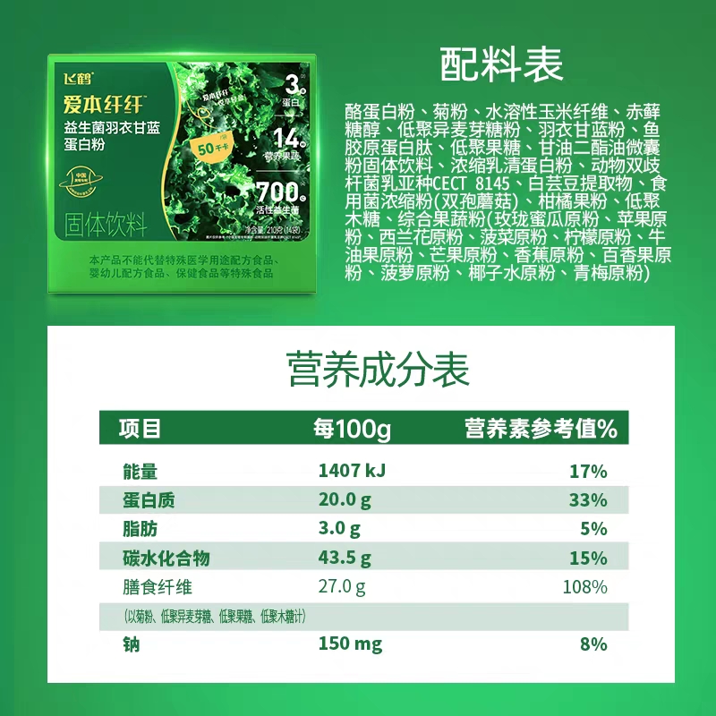 【盼盼专属】飞鹤爱本纤纤益生菌羽衣甘蓝蛋白粉果蔬膳食纤维低脂冲泡营养代餐