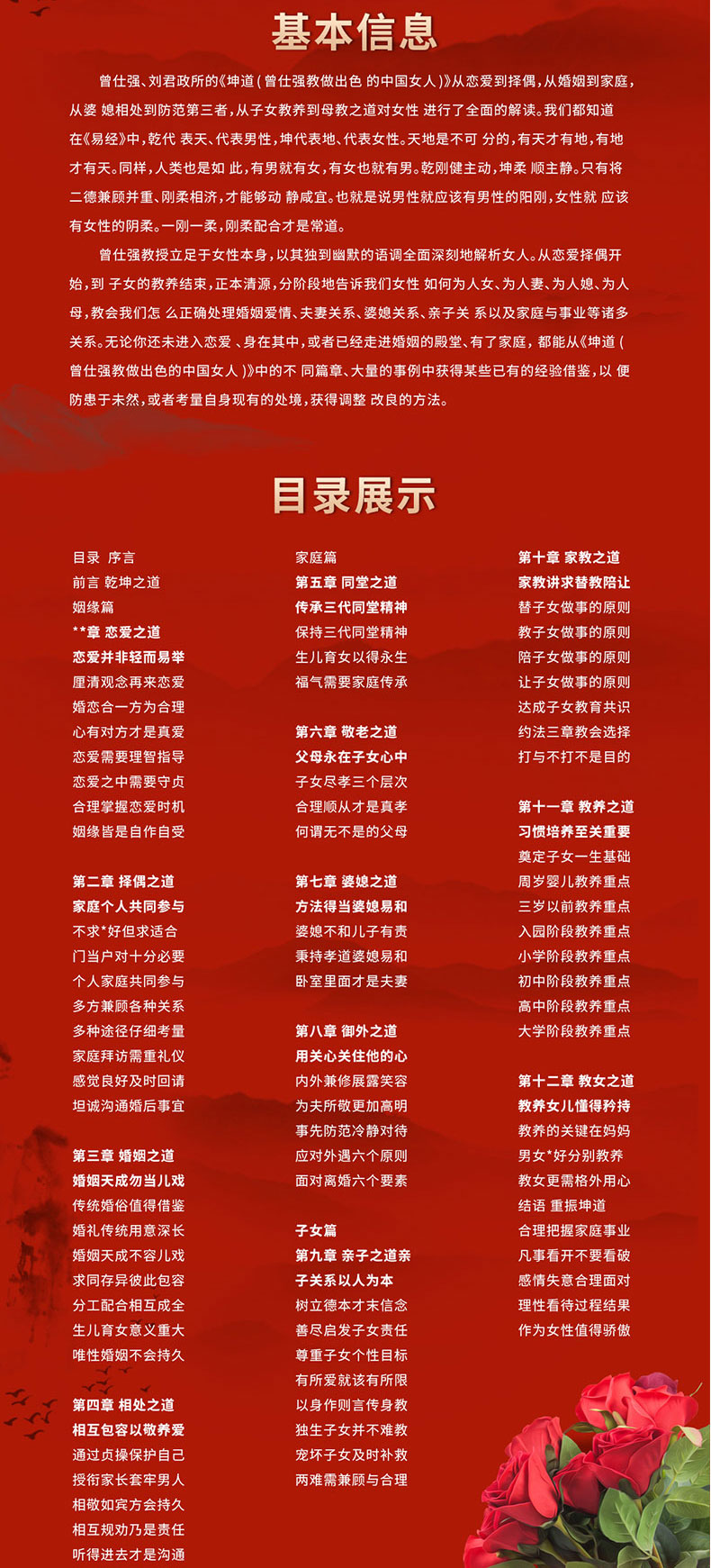 《坤道 曾仕强教做出色的中国女人》从恋爱到择偶,从婚姻到家庭,从婆媳相处到防范第三者,从子女教养到母教之道对女性进行了全面的解读。我们都知道在《易经》中,乾代表天、代表男性,坤代表地、代表女性。天地是不可分的,有天才有地,有地才有天。同样,人类也是如此,有男就有女,有女也就有男。乾刚健主动,坤柔顺主静。只有将二德兼顾并重、刚柔相济,才能够动静咸宜。也就是说男性就应该有男性的阳刚,女性就应该有女性的阴柔。一刚一柔,刚柔配合才是常道。曾仕强教授立足于女性本身,以其独到幽默的语调全面深刻地解析女人。从恋爱择偶开始,到子女的教养结束,正本清源,分阶段地告诉我们女性如何为人女、为人妻、为人媳、为人母,教会我们怎么正确处理婚姻爱情、夫妻关系、婆媳关系、亲子关系以及家庭与事业等诸多关系。无论你还未进入恋爱、身在其中,或者已经走进婚姻的殿堂、有了家庭,都能从《坤道 曾仕强教做出色的中国女人》中的不同篇章、......