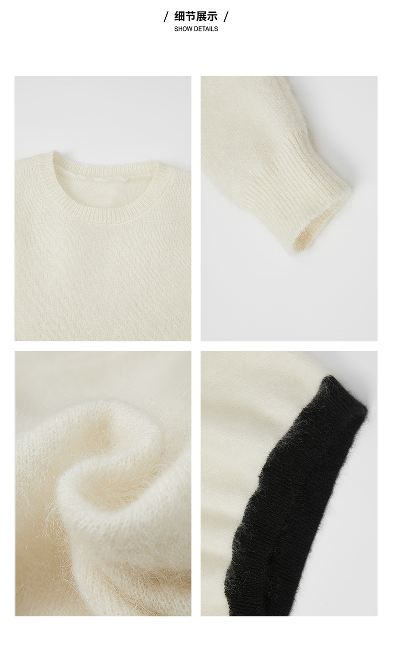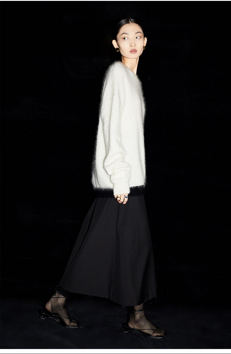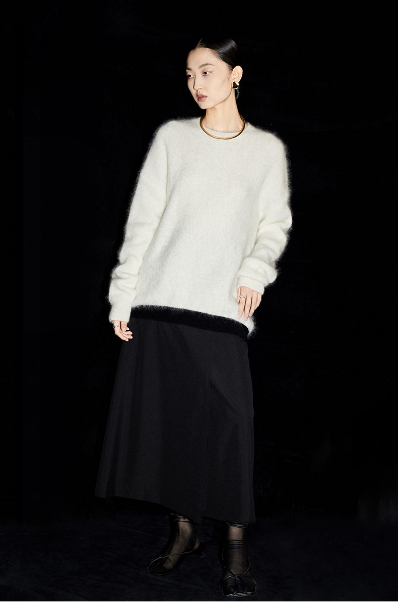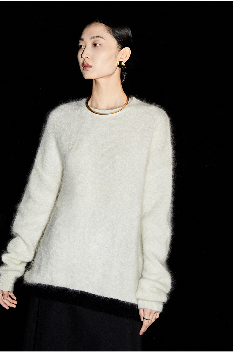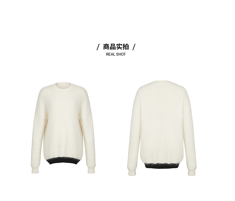 HIDEMI 马海毛白色拼接黑边圆领毛衣
