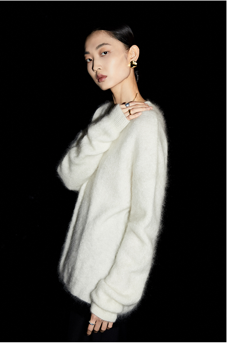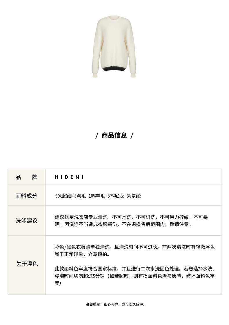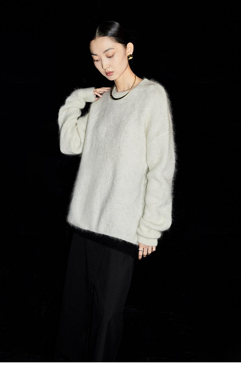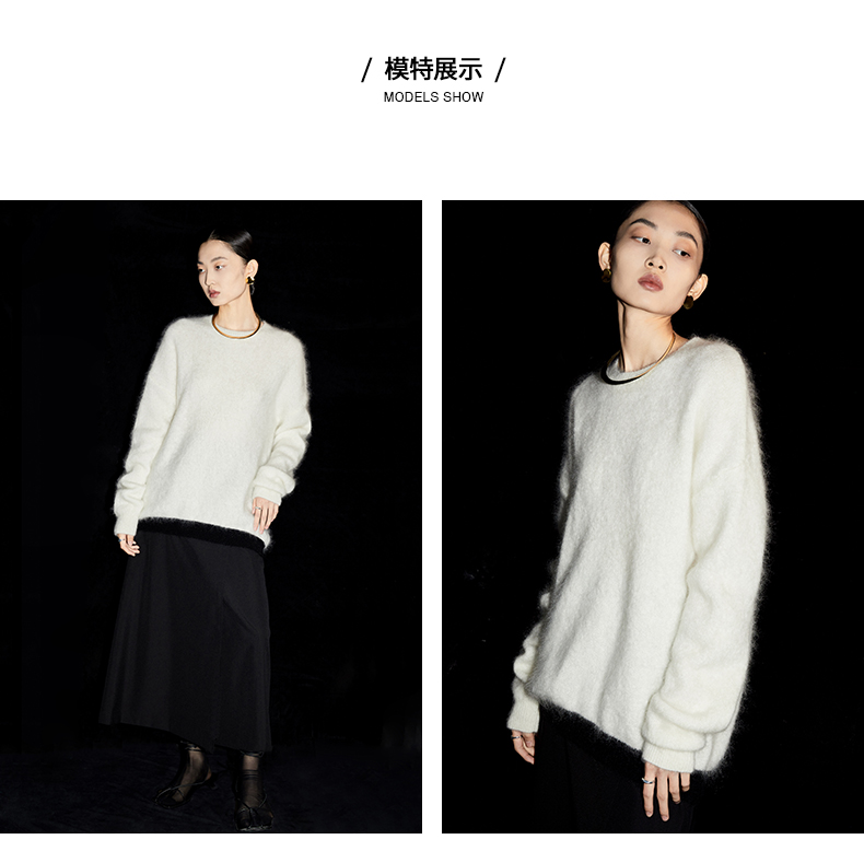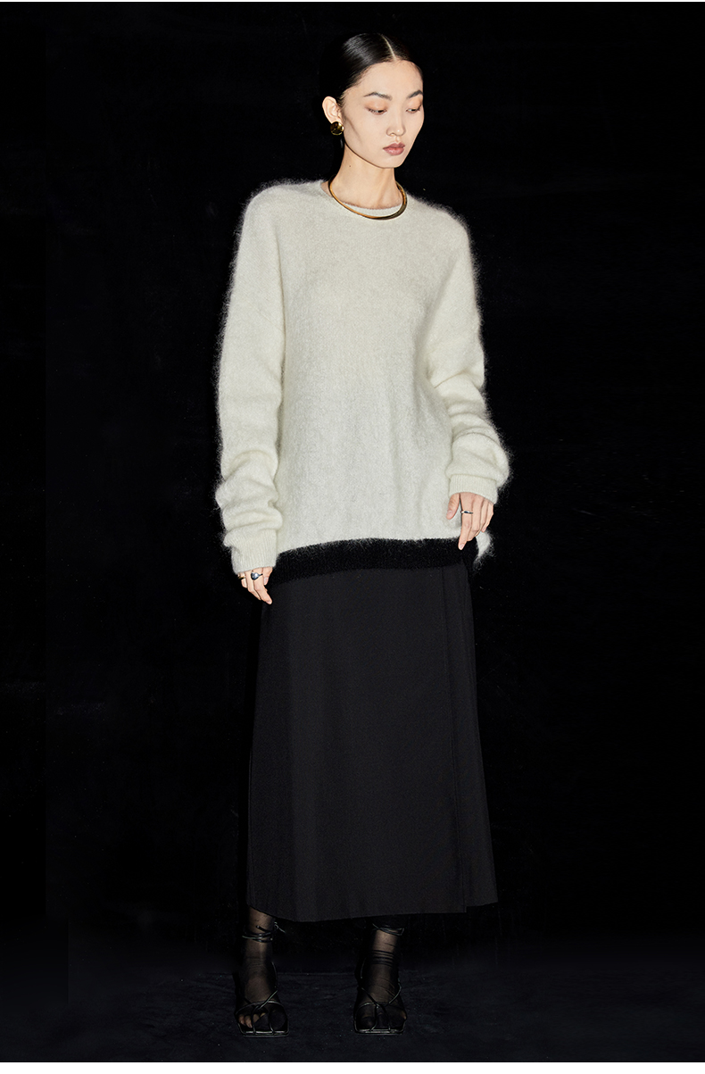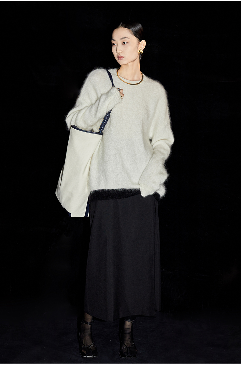 HIDEMI 马海毛白色拼接黑边圆领毛衣