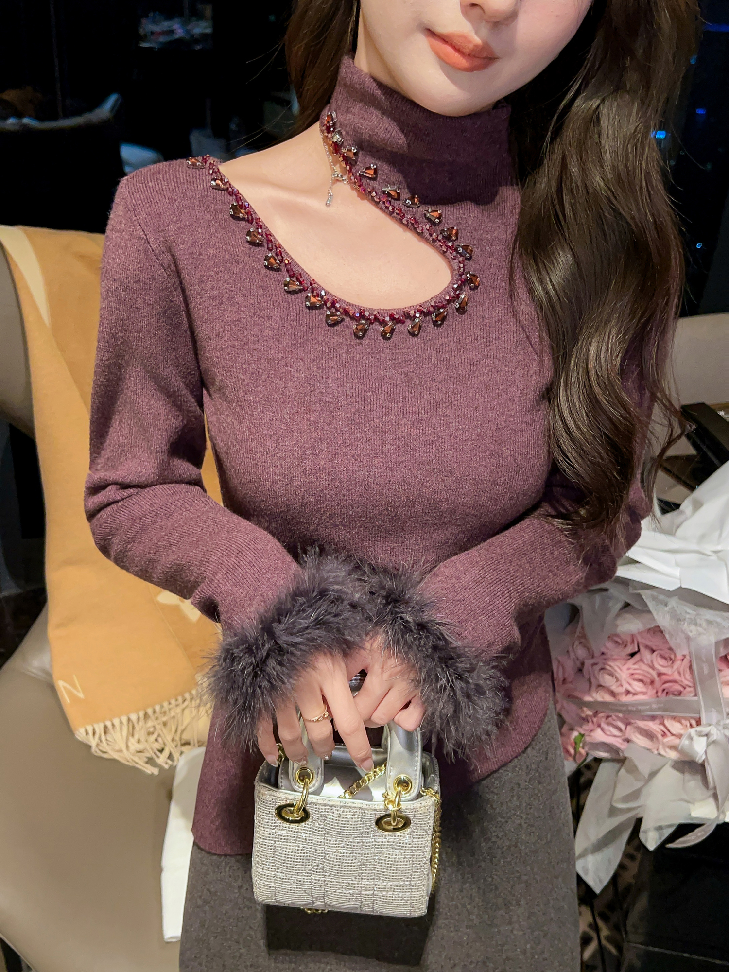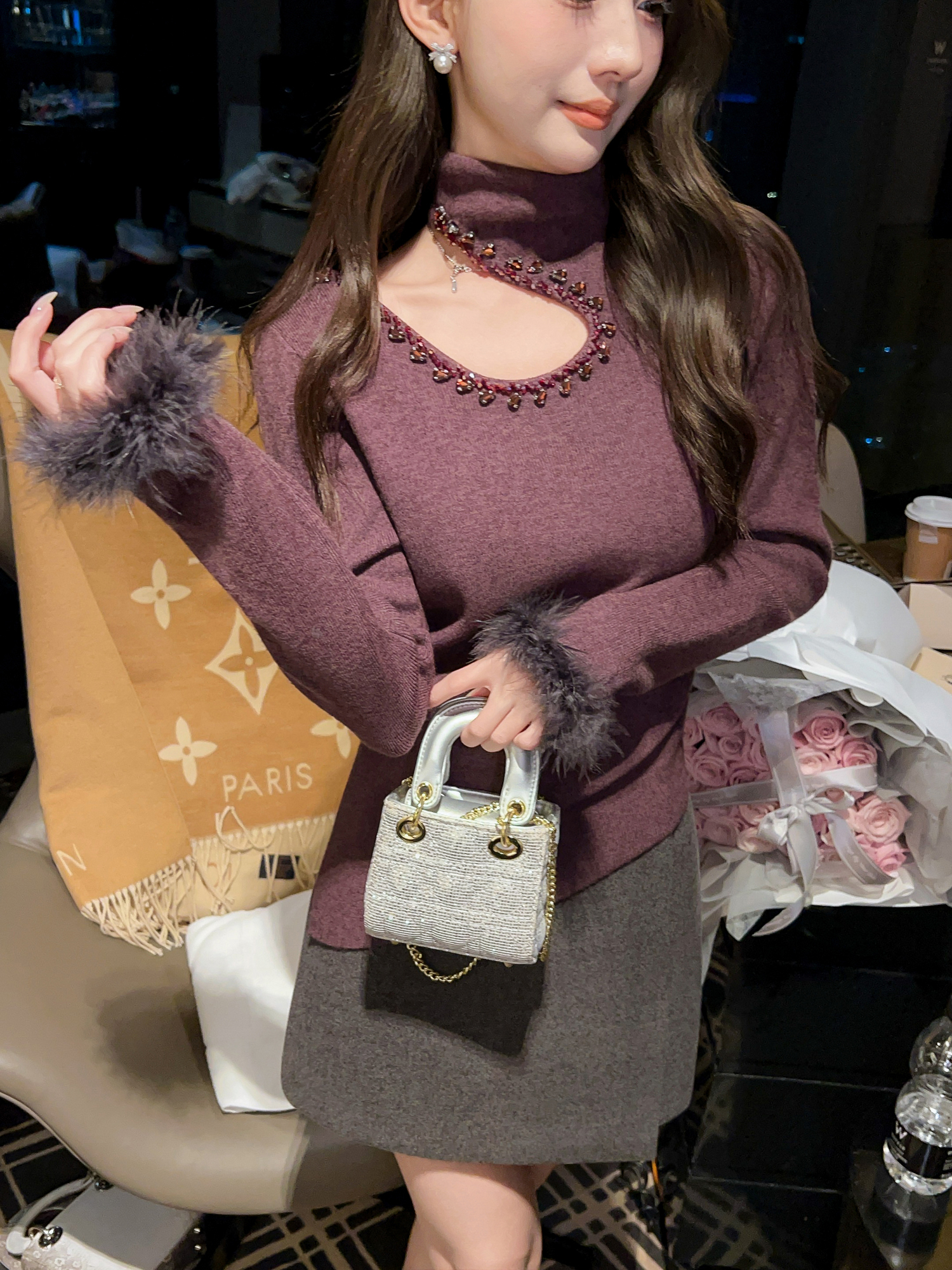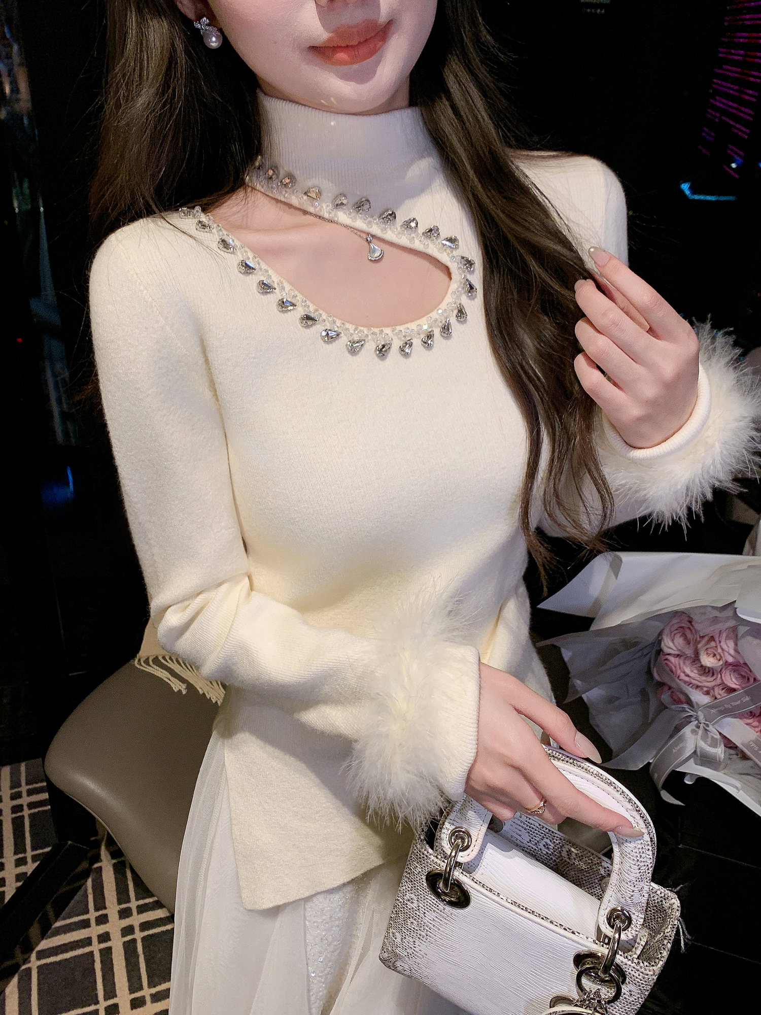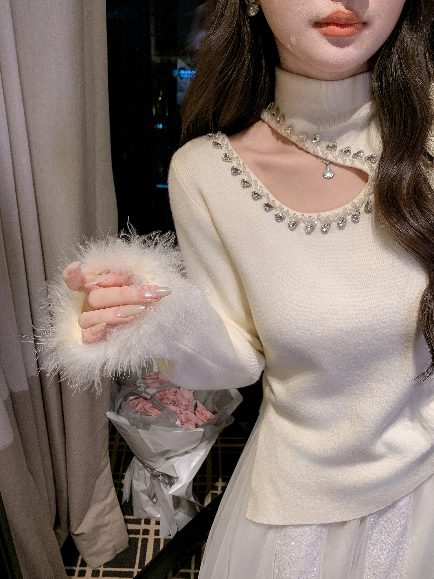 张心子【温暖壁炉】半高领手袖羽毛挖空镶钻上衣 U2601003