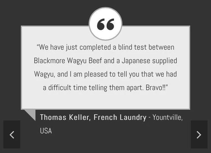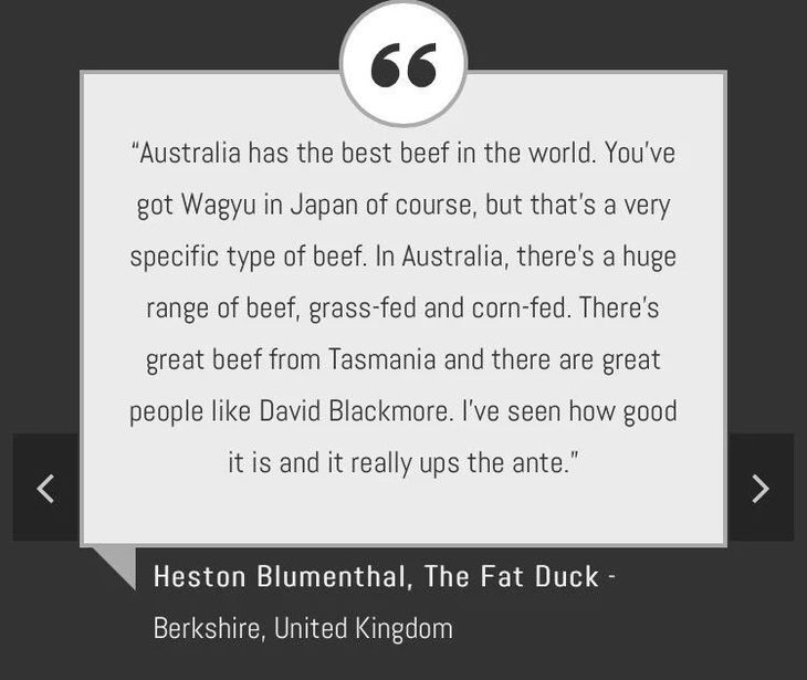 英国米其林三星Fat Duck主厨Heston Blumenthal形容Blackmore牛肉是世界最好的牛肉。澳洲有各种各样的牛肉,草饲和谷饲等等,但是Blackmore牛肉是其中最顶级的存在。
