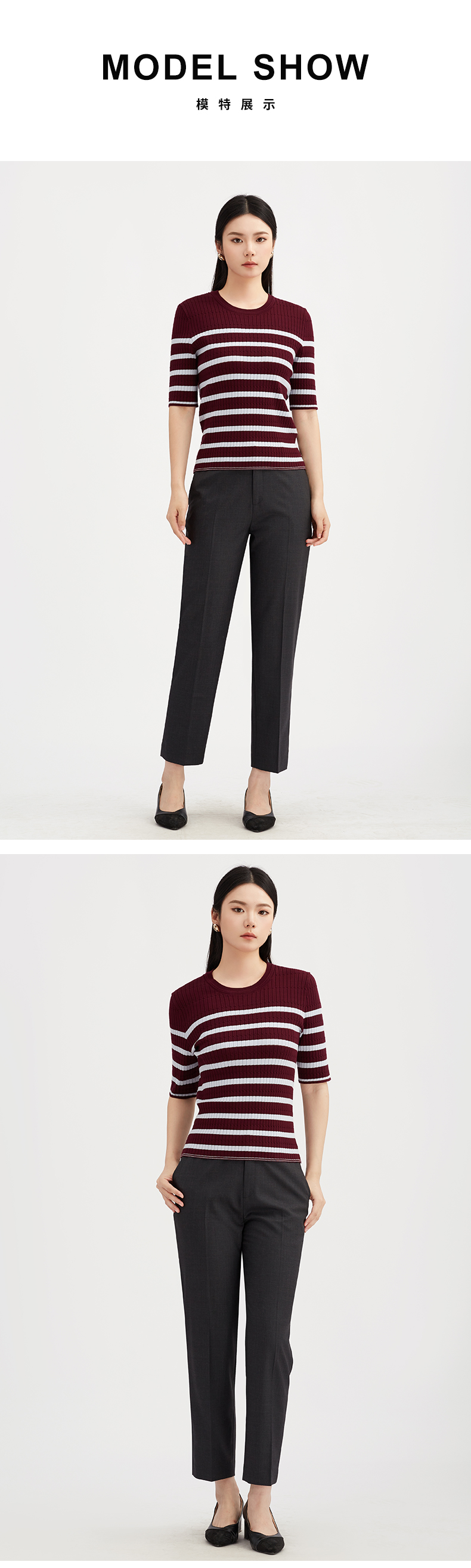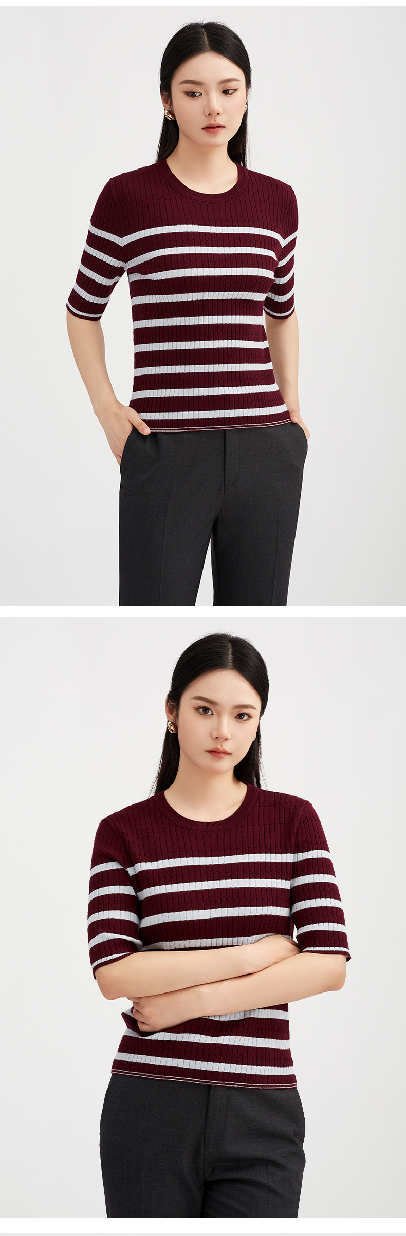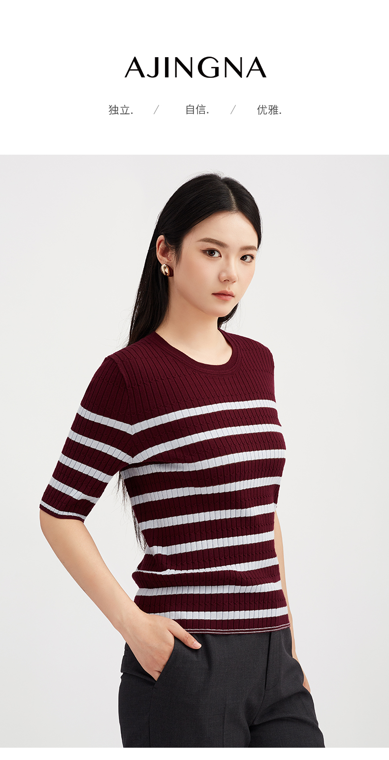 【商场同款】阿菁娜秋季新款复古条纹针织衫女坑条显瘦上衣 五分袖圆领宽松套头毛衣A30Q301021