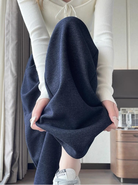 我们这款阔腿牛仔裤 是升级的牛仔布面料 柔软同时又有筋骨 垂感好,还有一定的抗皱性! 不易起皱、易于打理垂坠感强 即使是加绒款也一点不会显得臃肿。