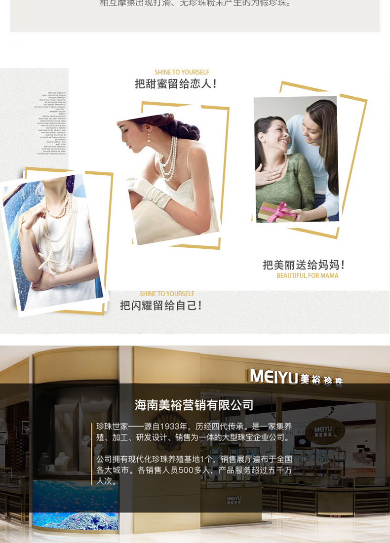 - 珍珠世家,代代相传。美裕珍珠,1933年起源于印尼,成长于海南岛。依托海南资源优势和自身专业优势,以经营南珠、南洋珠为主,专注于珍珠文化的挖掘和传播,把珍珠代表的爱意,永不间断地传承下去。