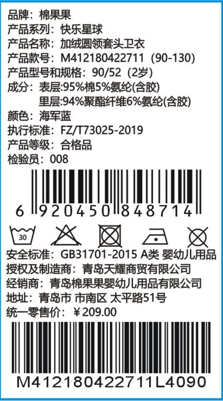商场同款棉果果冬季男童显白百搭耐脏保暖加绒圆领套头卫衣M412180422711