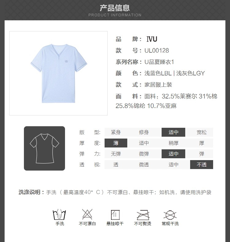 安莉芳旗下IVU男士v领短袖舒适家居上装夏季薄款冰丝睡衣UL00128