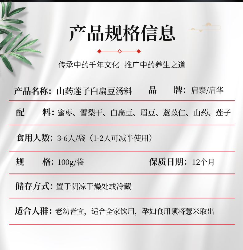 啟泰香港 山药莲子白扁豆料100g煲汤材料广式靓汤鸡汤料包 单袋装(3-6人食用)