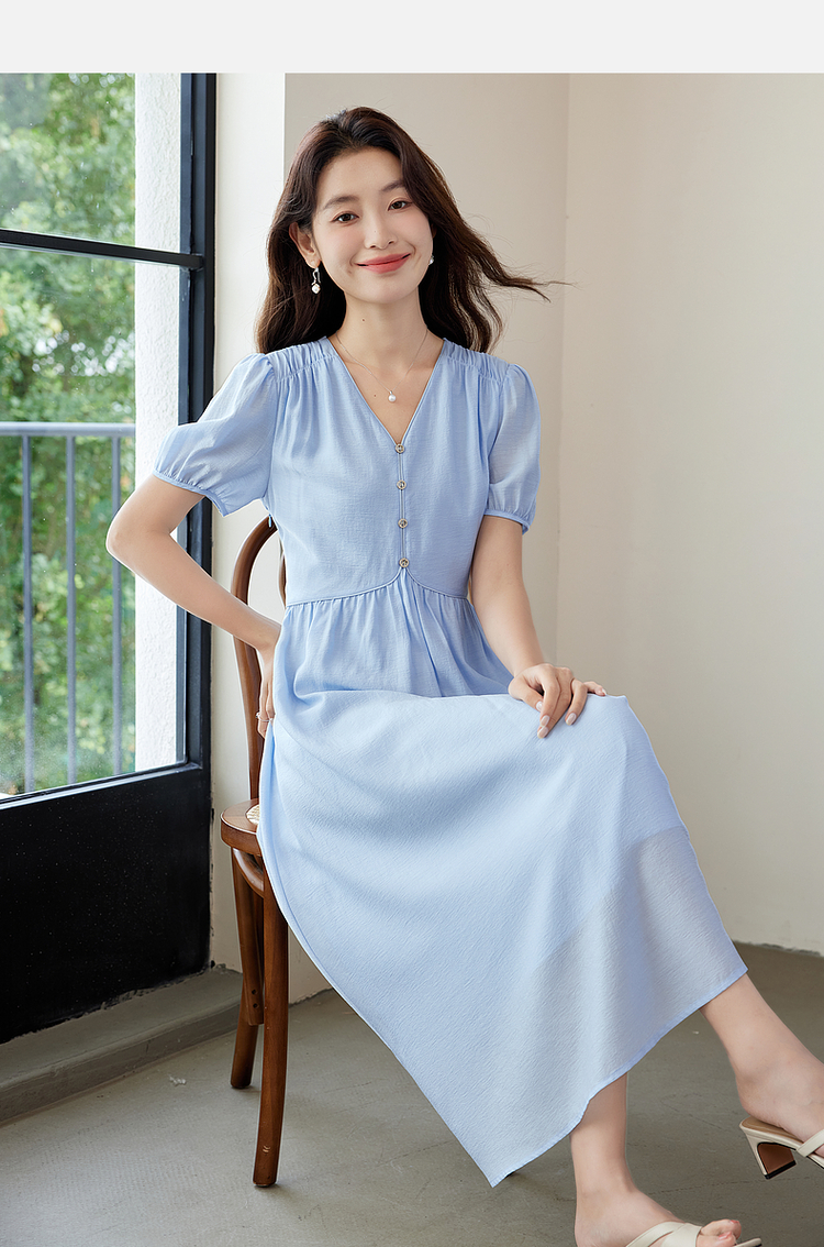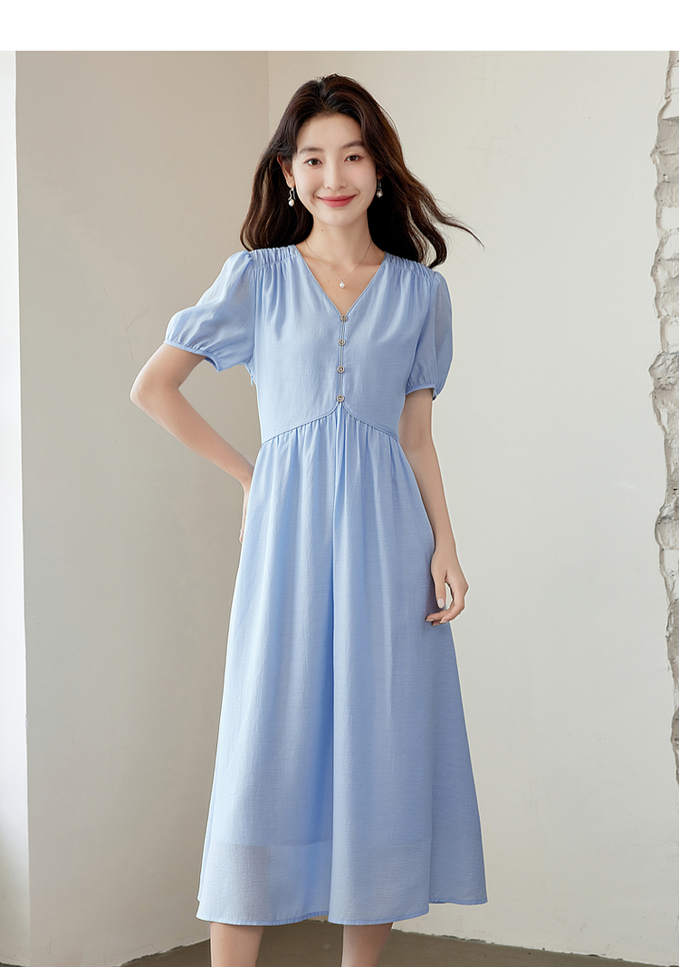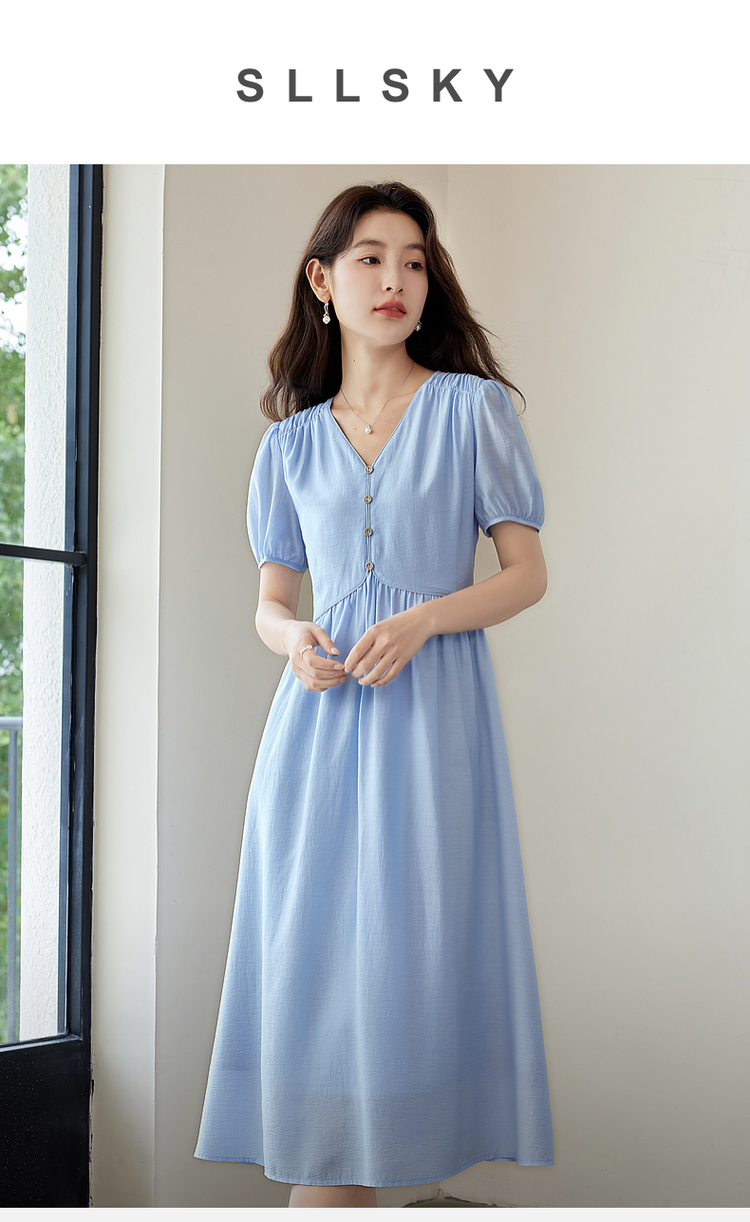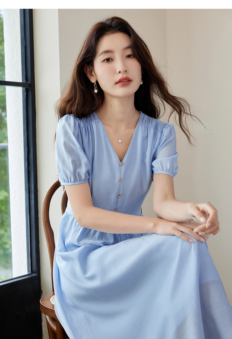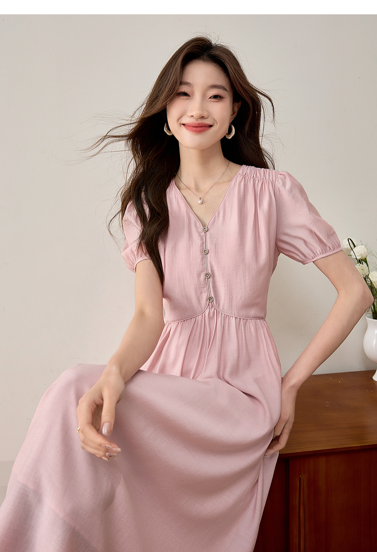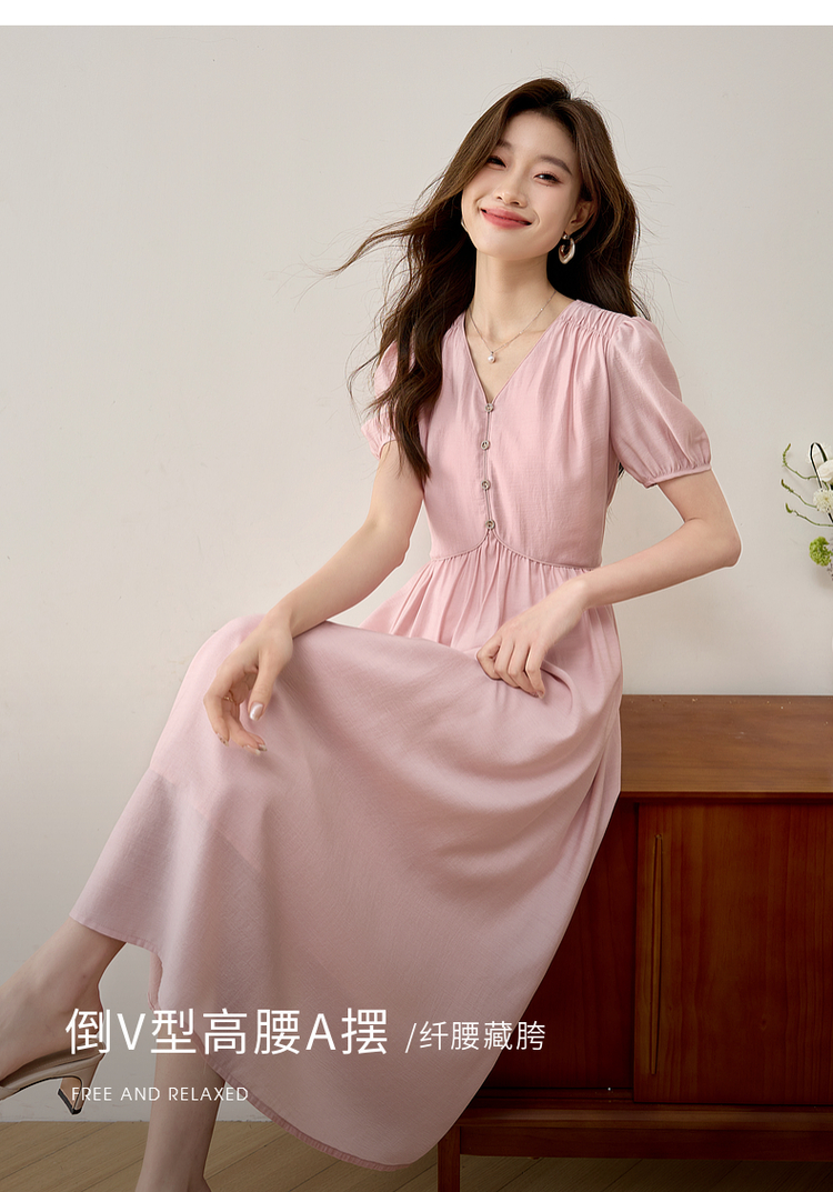 【专属特价】熙世界法式优雅泡泡袖V领连衣裙女2025新款夏季气质显瘦a字长裙