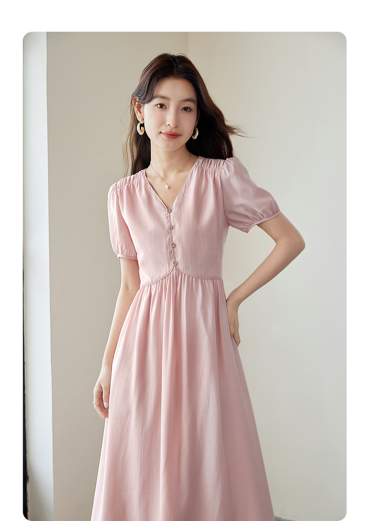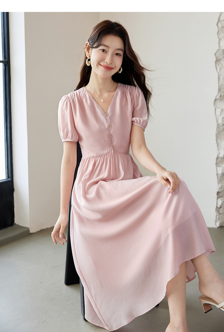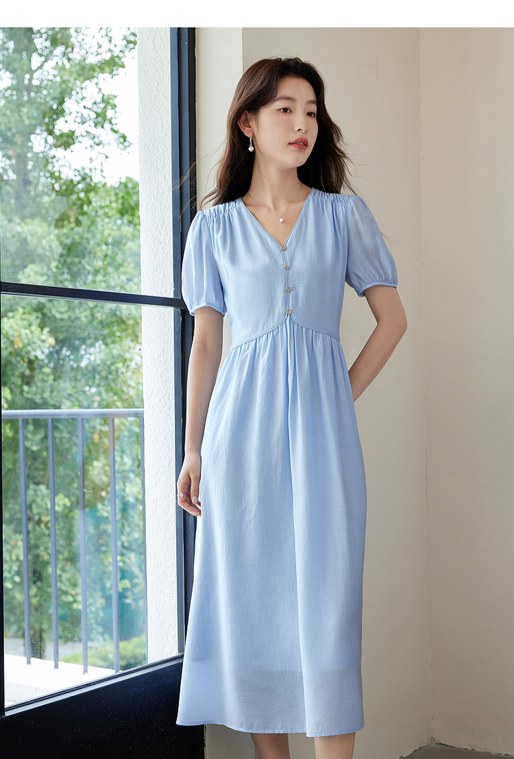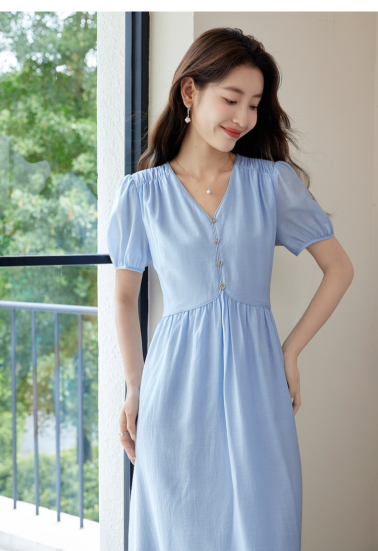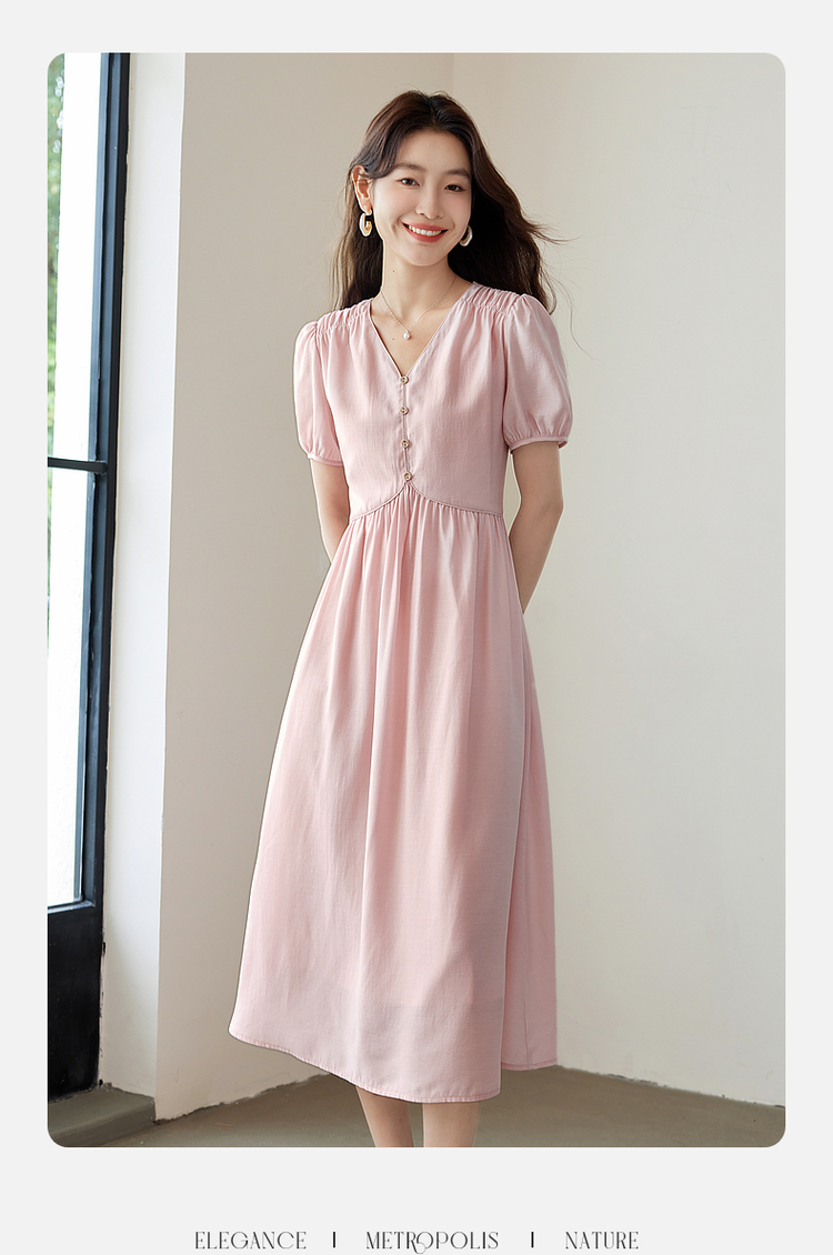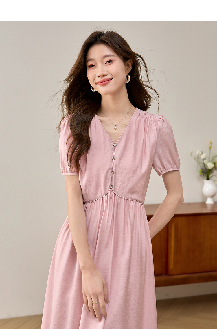 【专属特价】熙世界法式优雅泡泡袖V领连衣裙女2025新款夏季气质显瘦a字长裙
