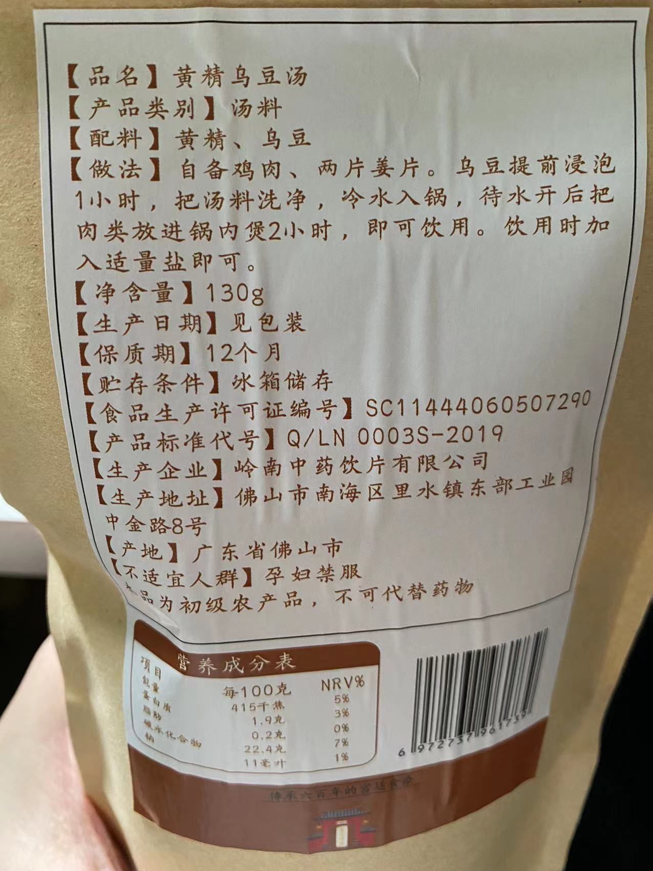 自备鸡肉、两片姜片;乌豆提前浸泡一小时,把汤料洗净,冷水入锅,待水开后把肉类放进锅内煲2小时即可。