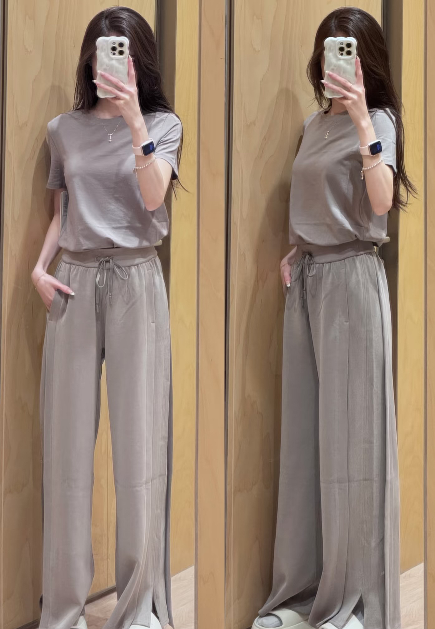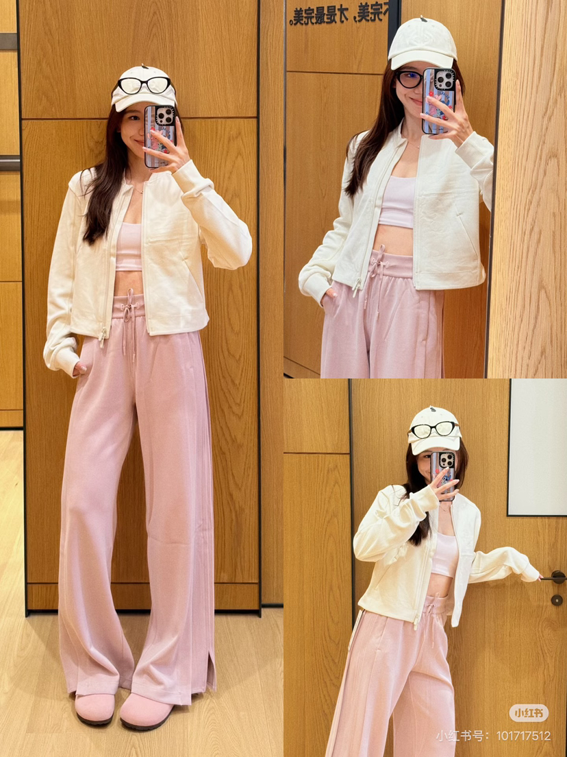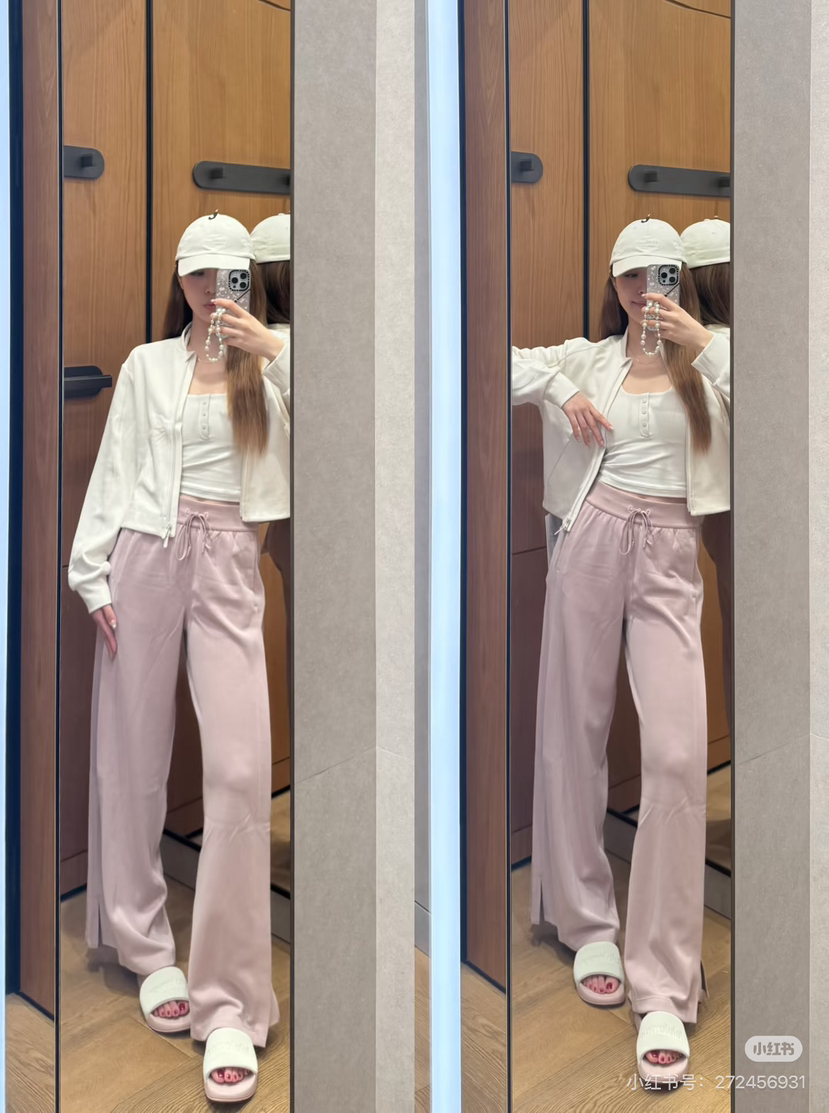 真的很好穿,拼接设计,比往年更好穿,飒爽大气飘逸垂坠,还欸外的软糯。长裤采用柔软的微微磨绒面料,磨砂手感,内里是相当顺滑亲肤的材质,打湿了会有水痕,脏了也会有,整体洗一下就好了。