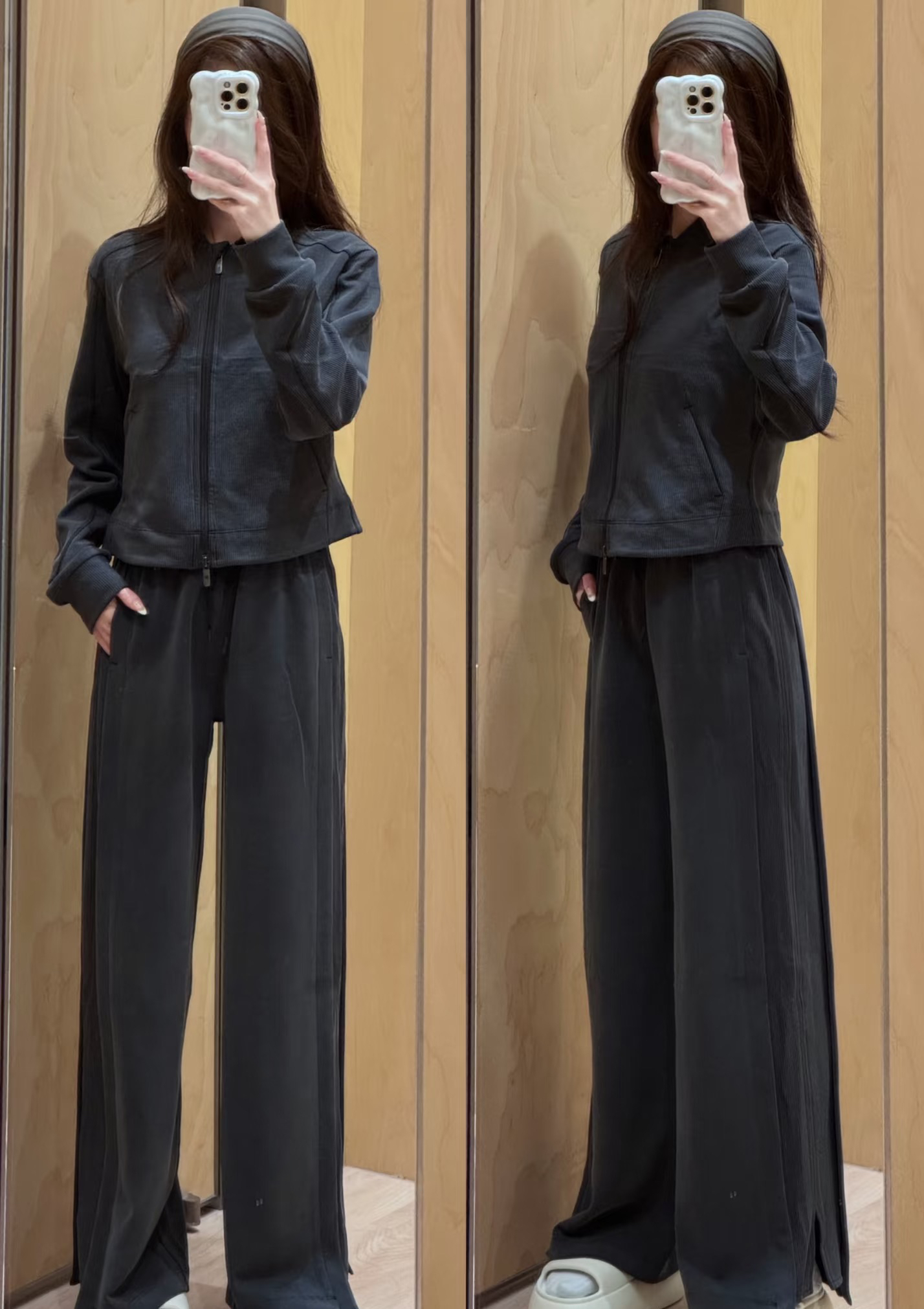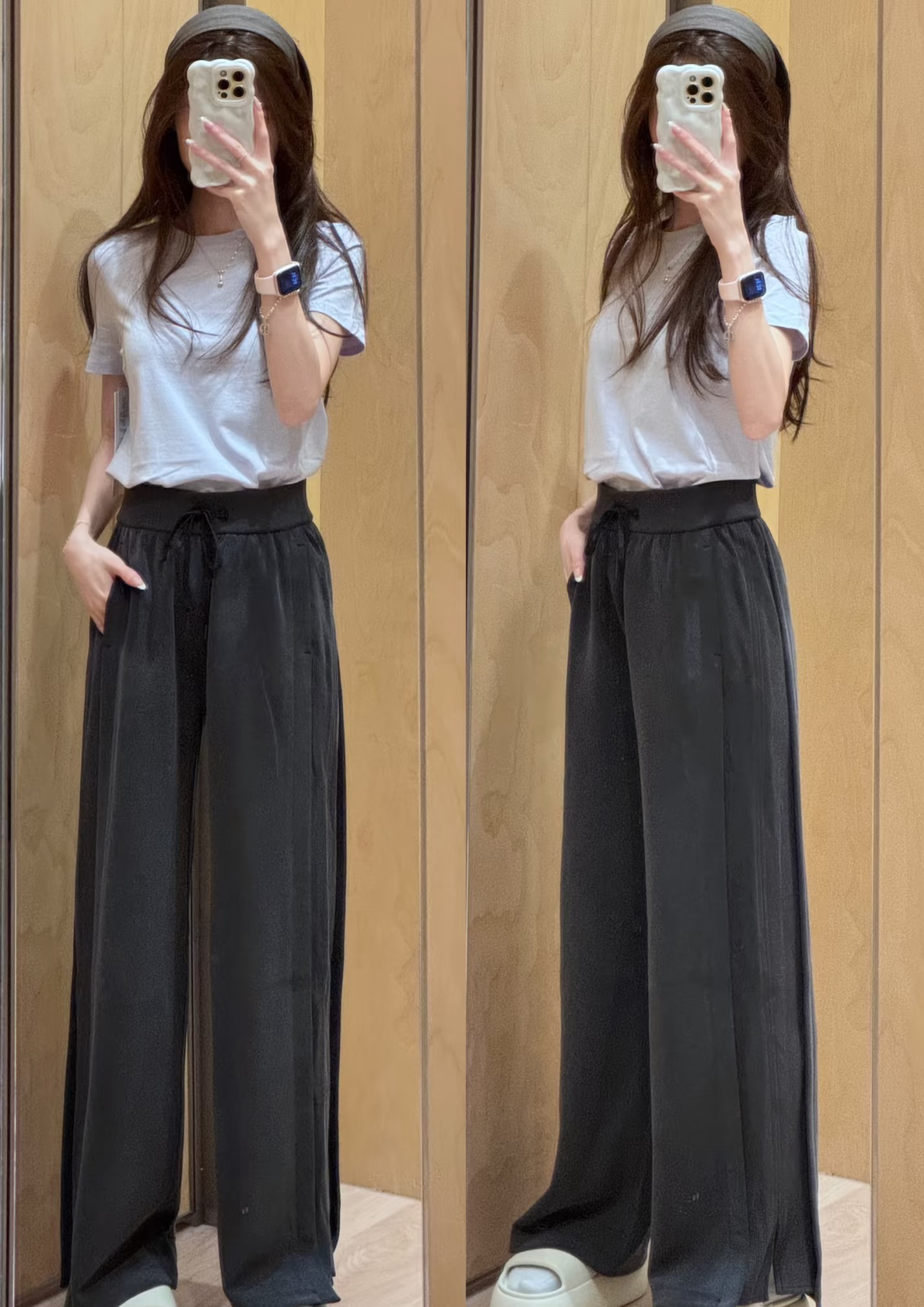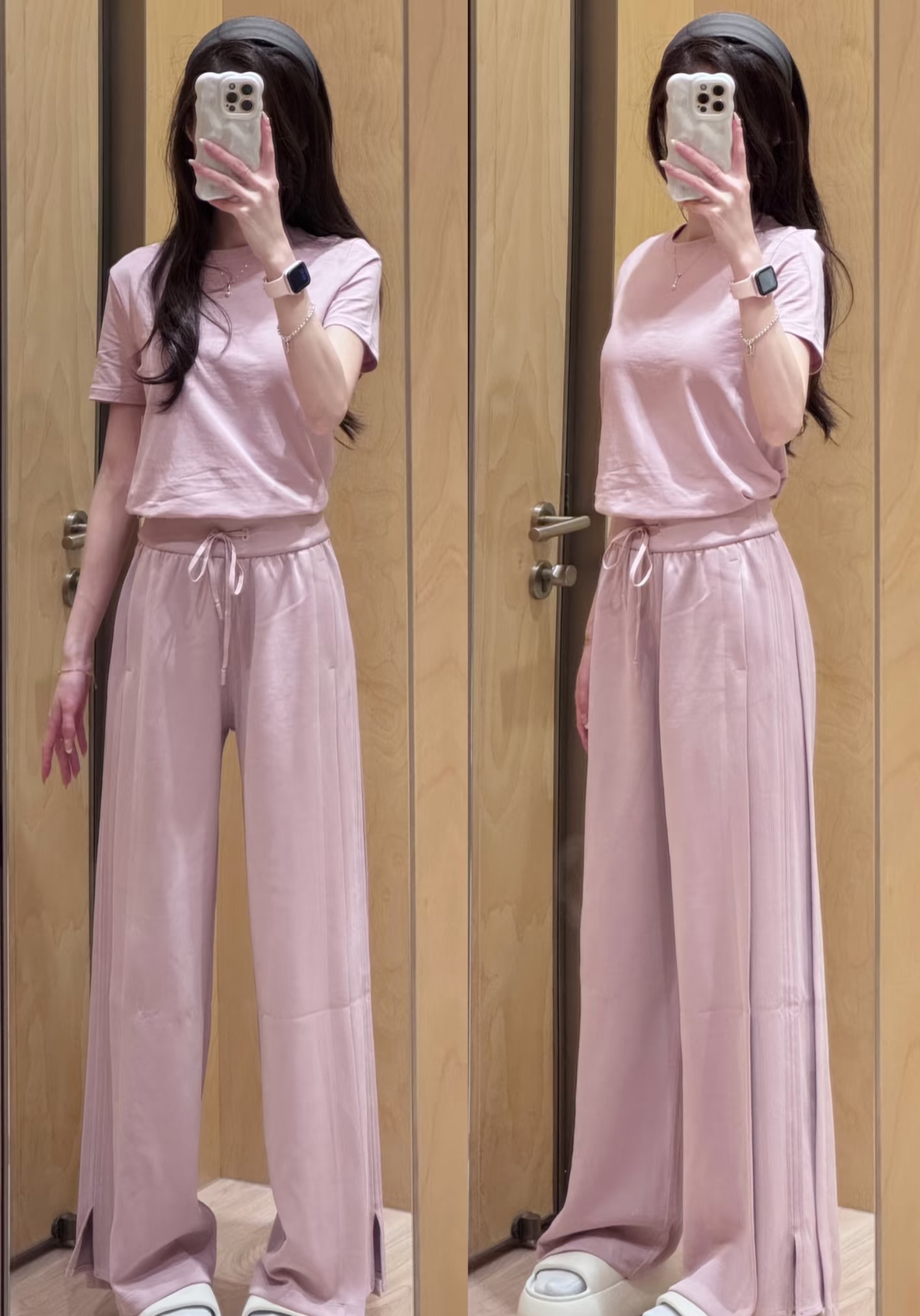真的很好穿,拼接设计,比往年更好穿,飒爽大气飘逸垂坠,还欸外的软糯。长裤采用柔软的微微磨绒面料,磨砂手感,内里是相当顺滑亲肤的材质,打湿了会有水痕,脏了也会有,整体洗一下就好了。