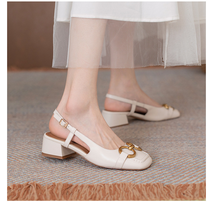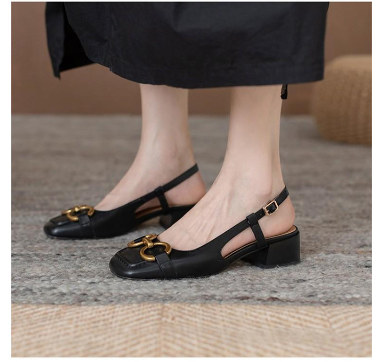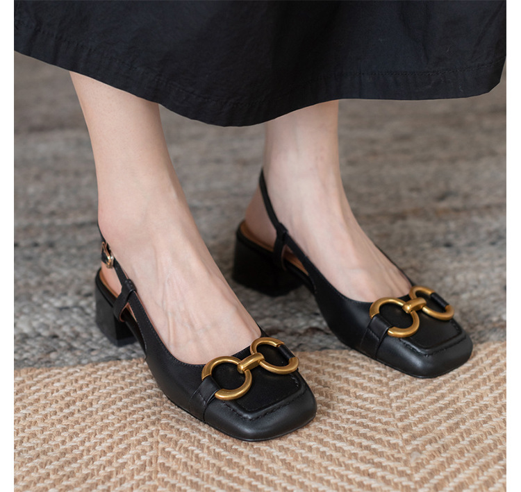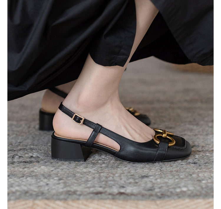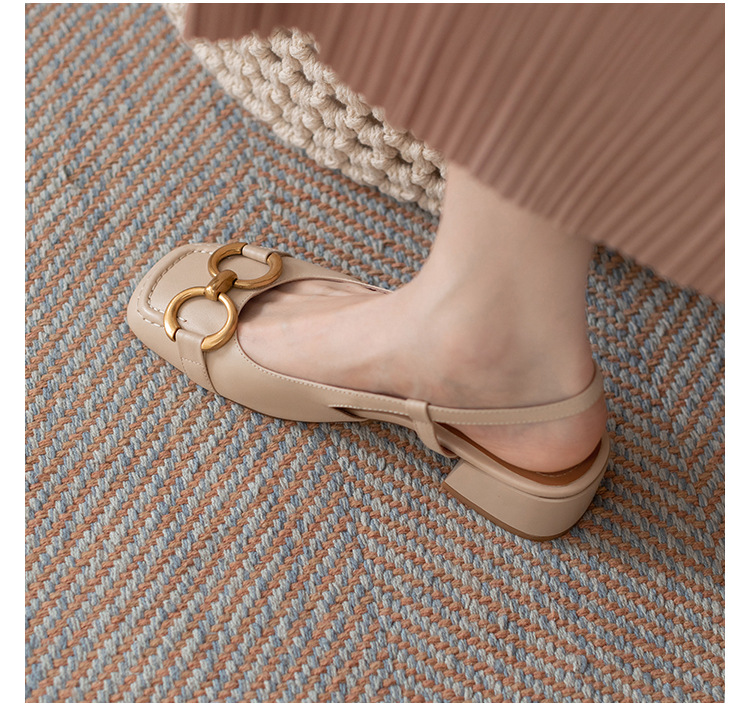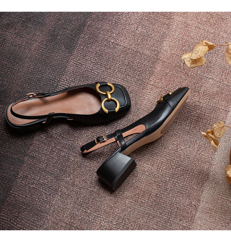【复古法式 马衔扣软皮包头凉鞋女】夏中跟软底舒适方头 后空粗跟单鞋