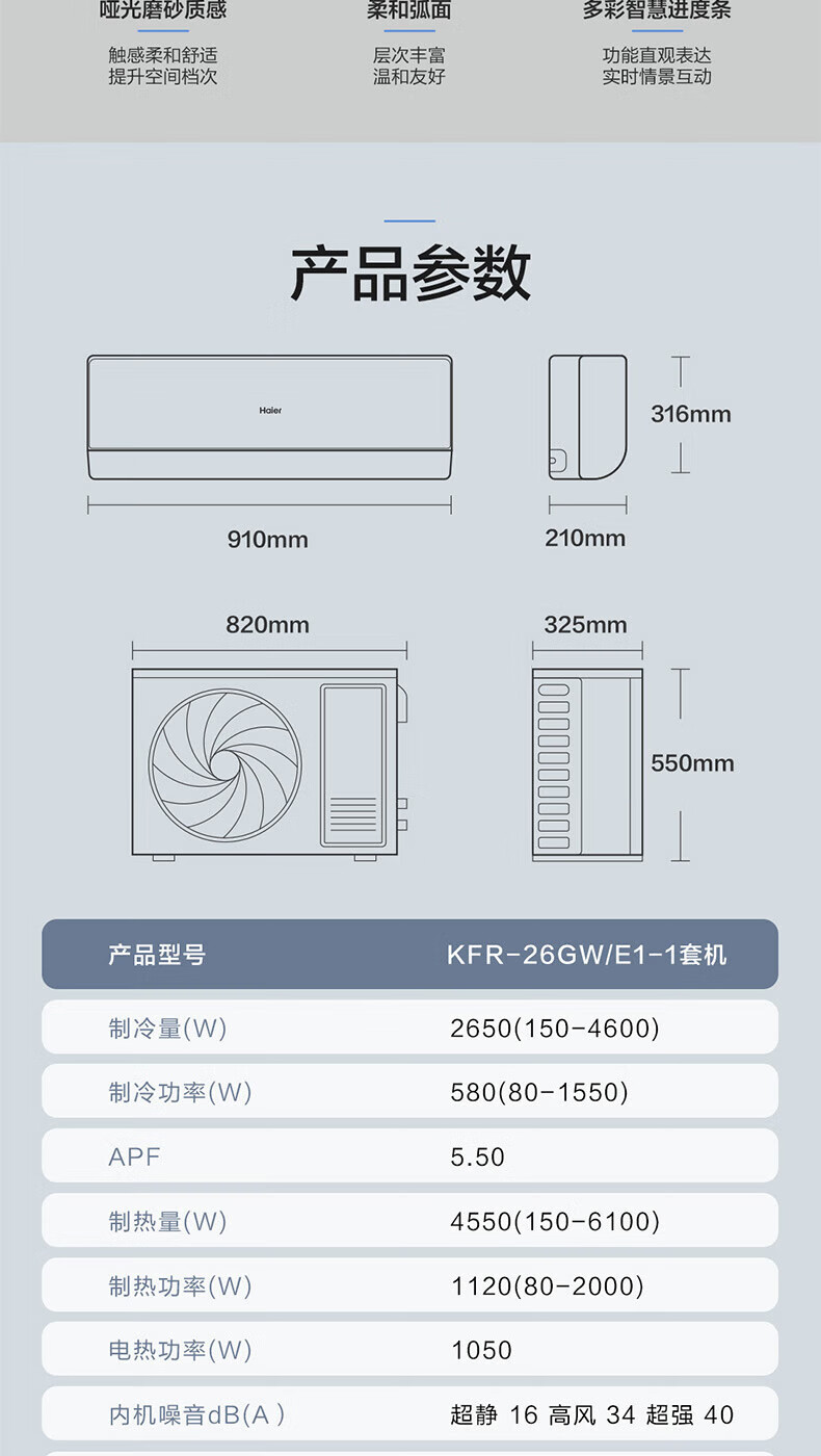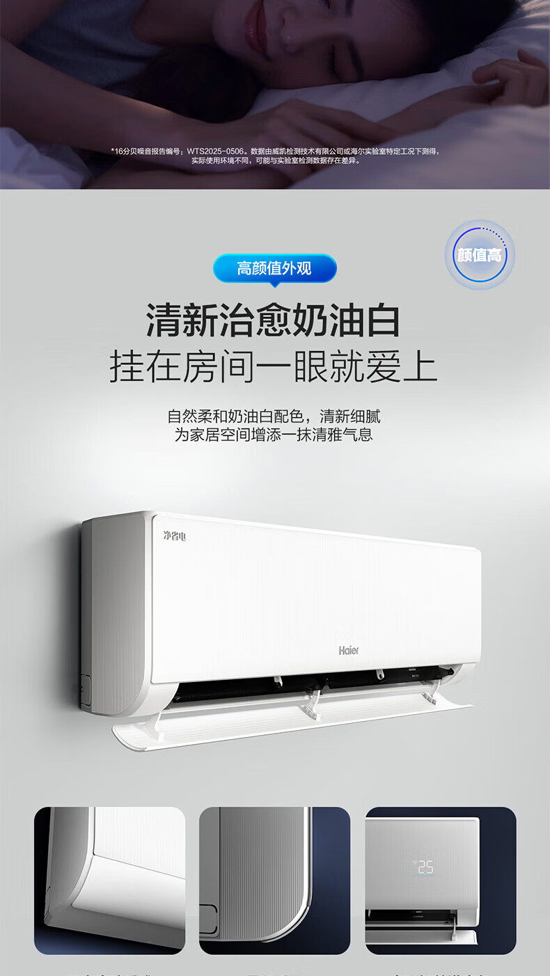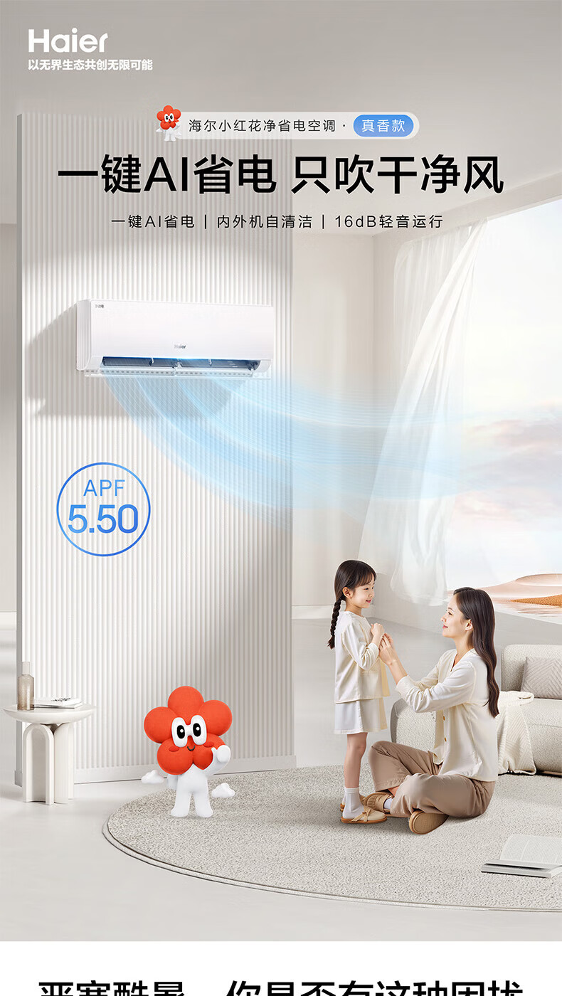 海尔(Haier)空调挂机1匹一级能效变频壁挂式卧室空调内外机自清洁一键AI省电冷暖不直吹KFR-26GW/E1-1净省电 1匹 一级能效 /冷暖不直吹/一键AI省电/自清洁