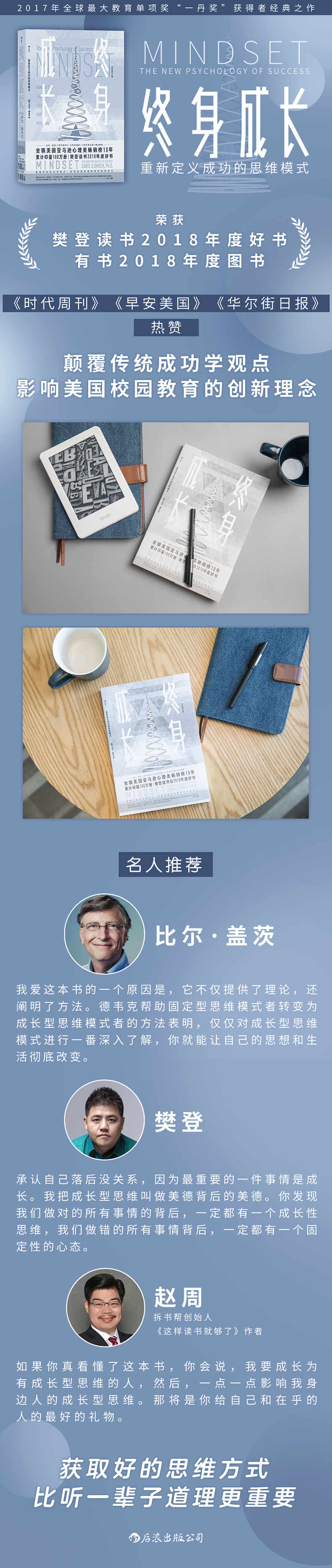 我爱这本书的一个原因是,它不仅提供了理论,还阐明了方法。德韦克帮助固定型思维模式者转变为成长型思维模式者的方法表明,仅仅对成长型思维模式进行一番深入了解,你就能让自己的思想和生活彻底改变。 ——比尔·盖茨