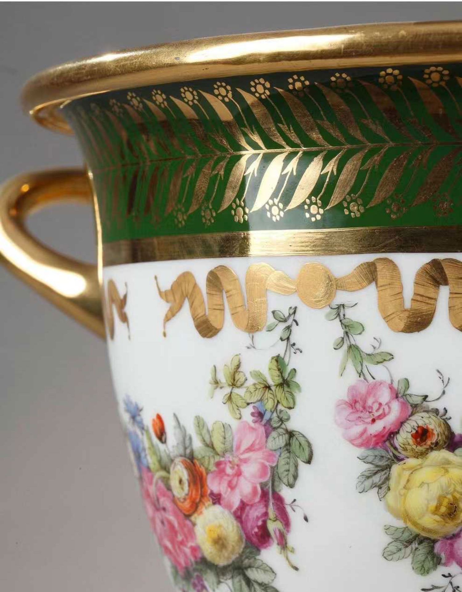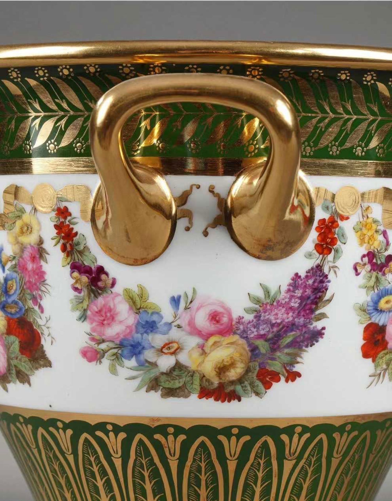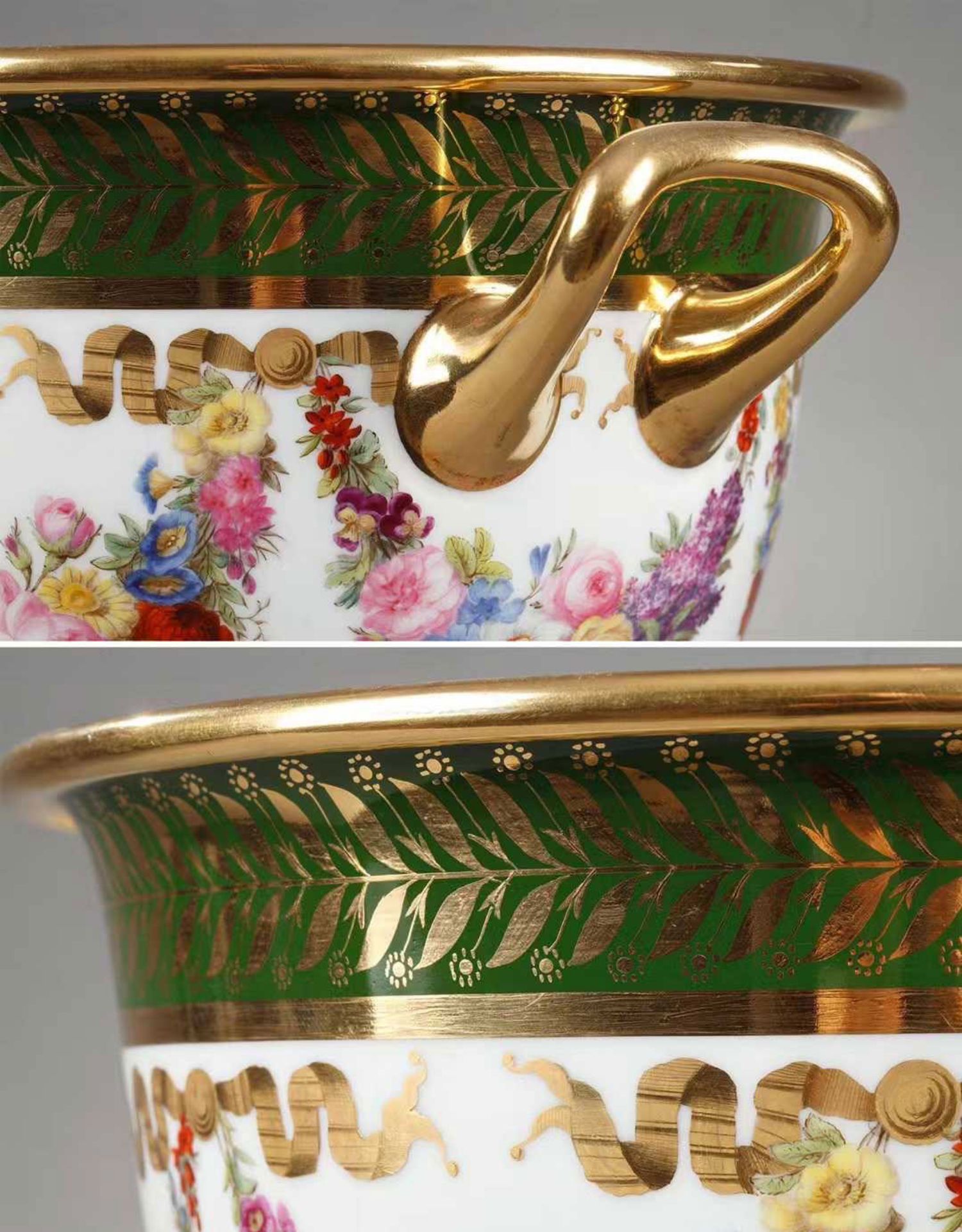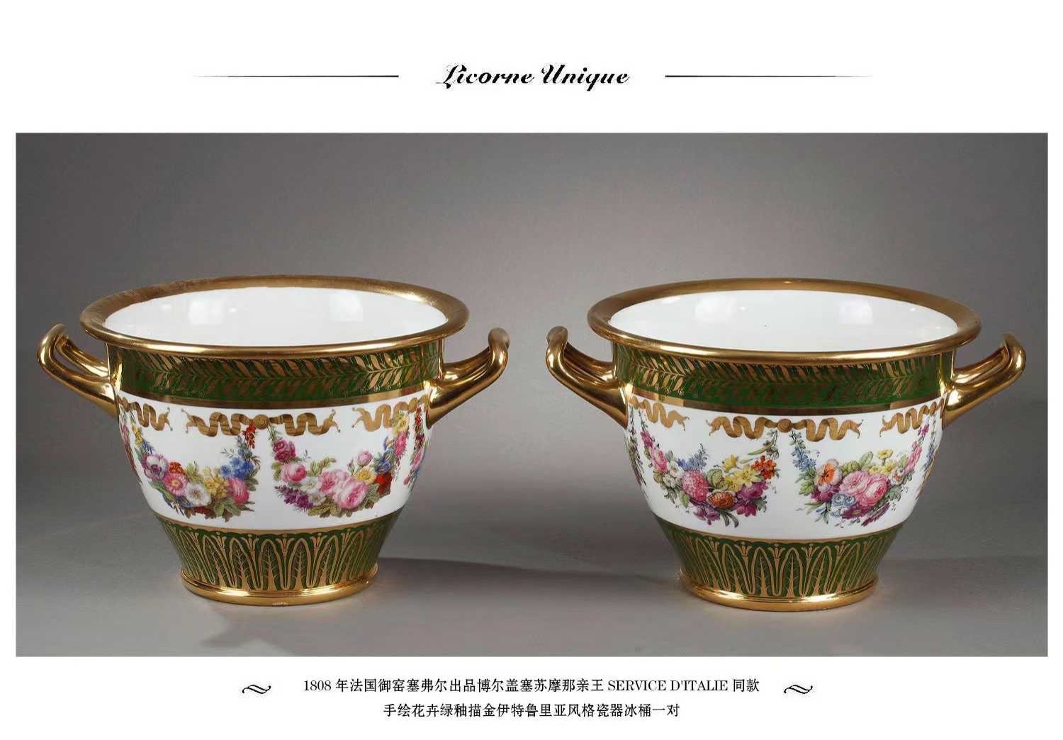 独角鹿西洋古董赛弗尔瓷器冰桶一对花卉绿釉描金伊特鲁里亚风格