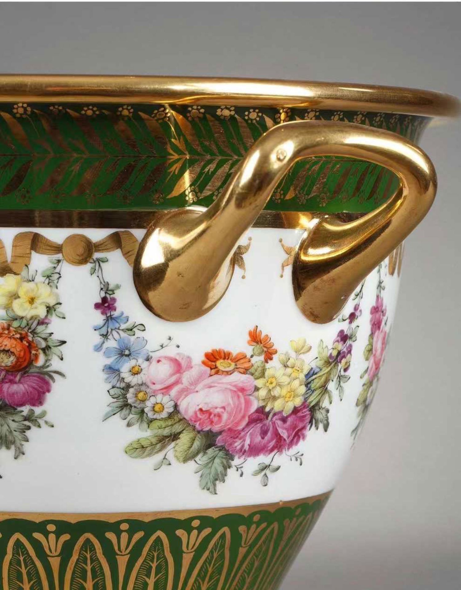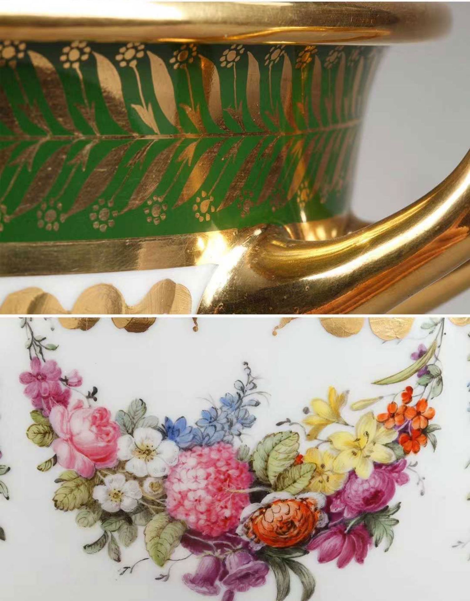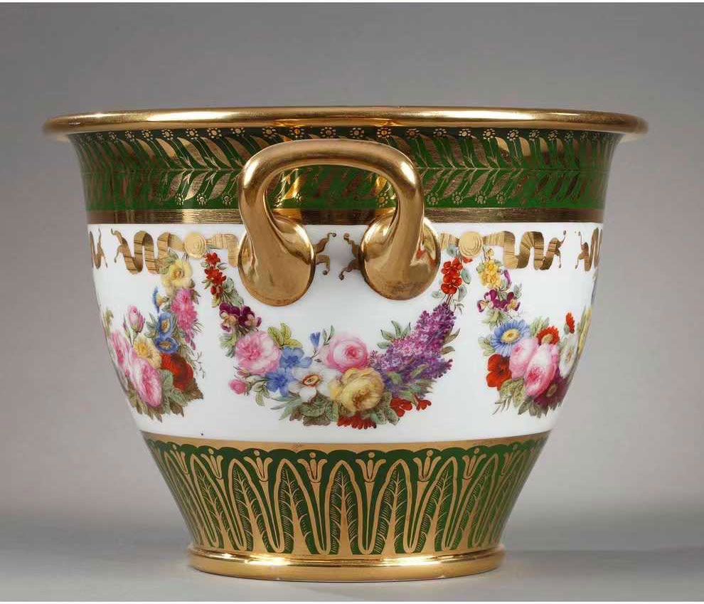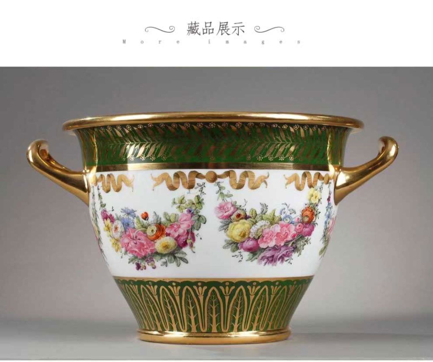 独角鹿西洋古董赛弗尔瓷器冰桶一对花卉绿釉描金伊特鲁里亚风格