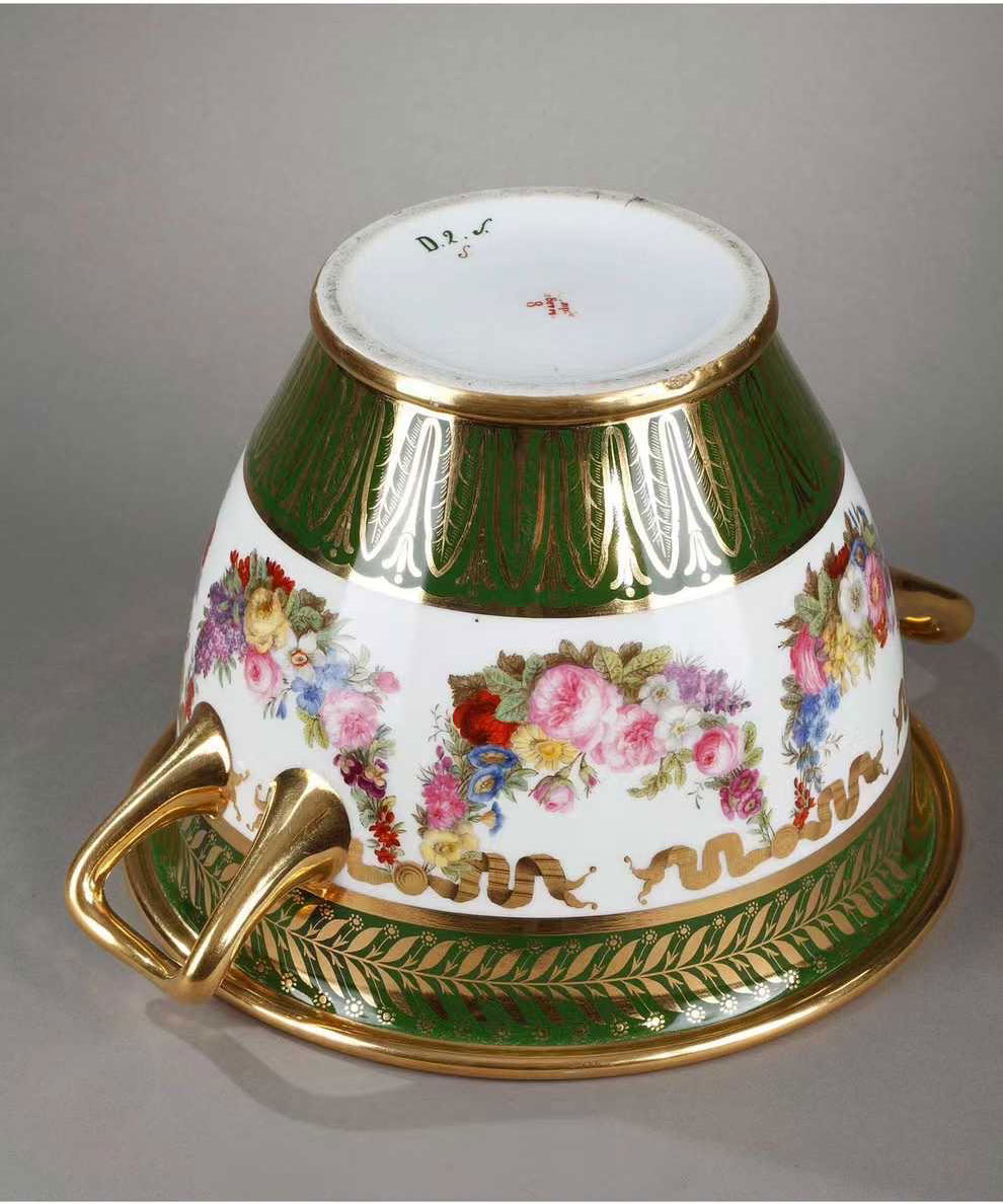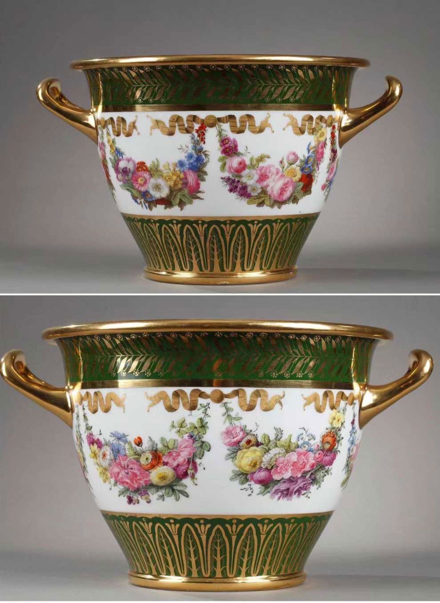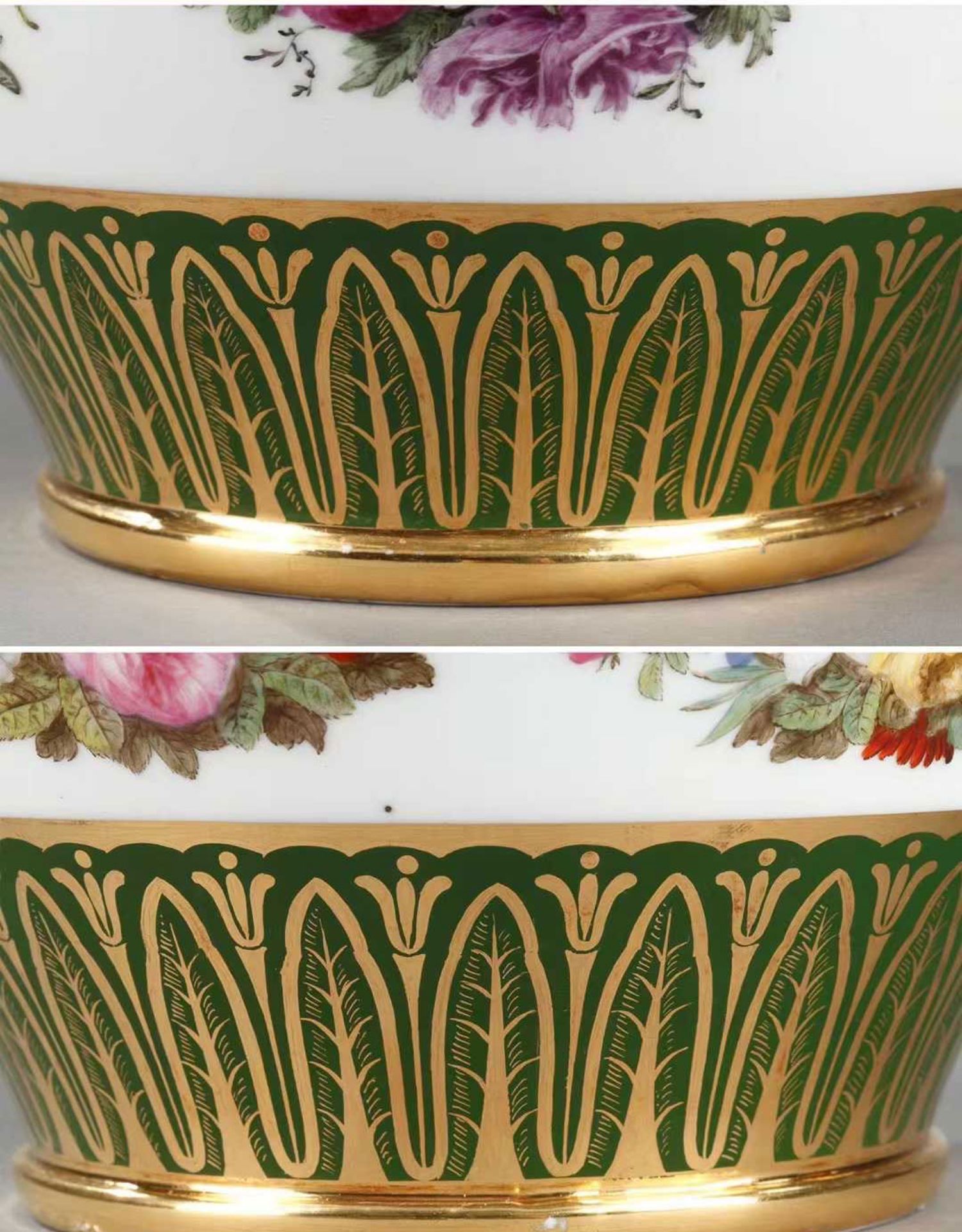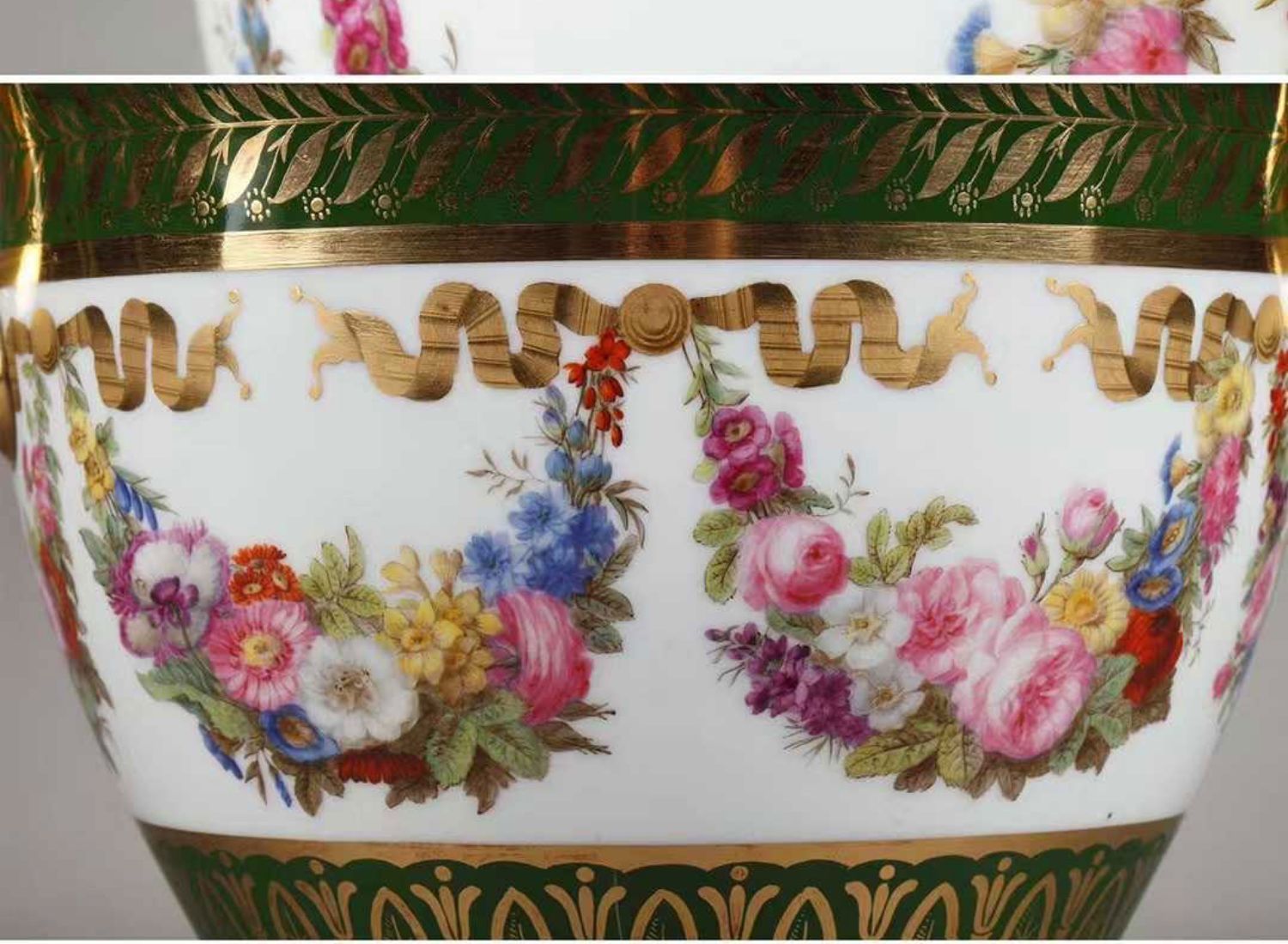独角鹿西洋古董赛弗尔瓷器冰桶一对花卉绿釉描金伊特鲁里亚风格