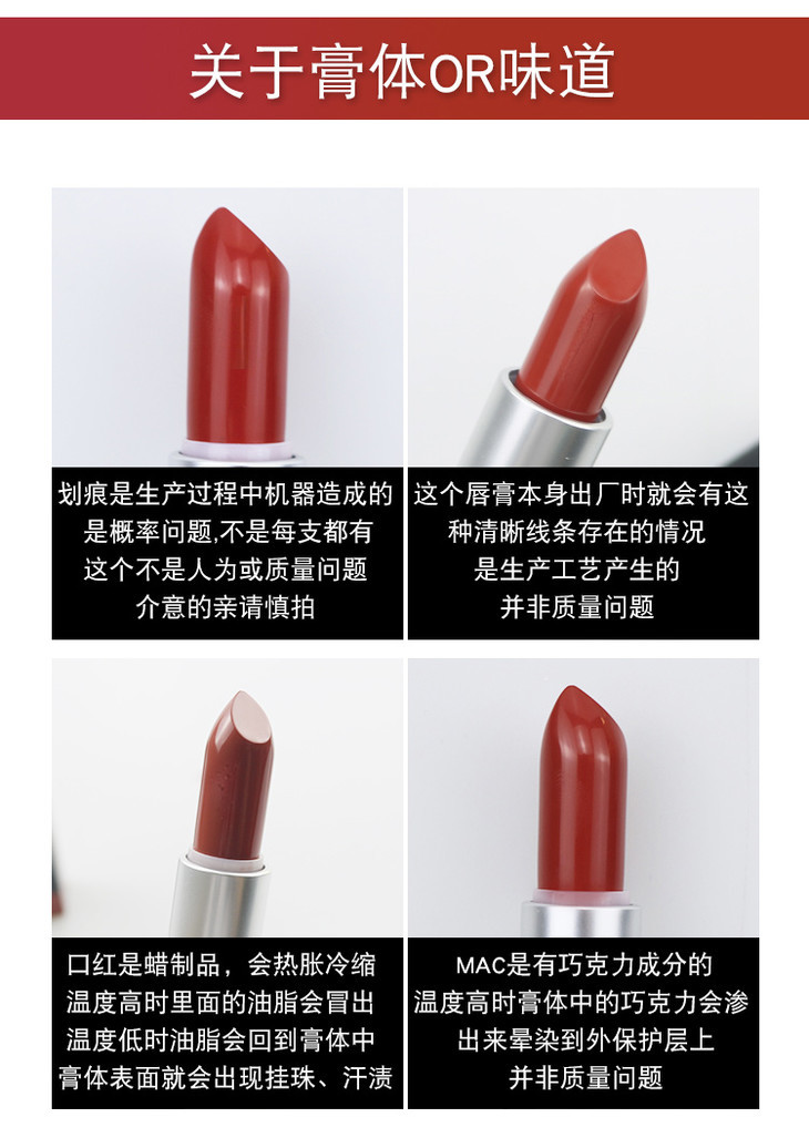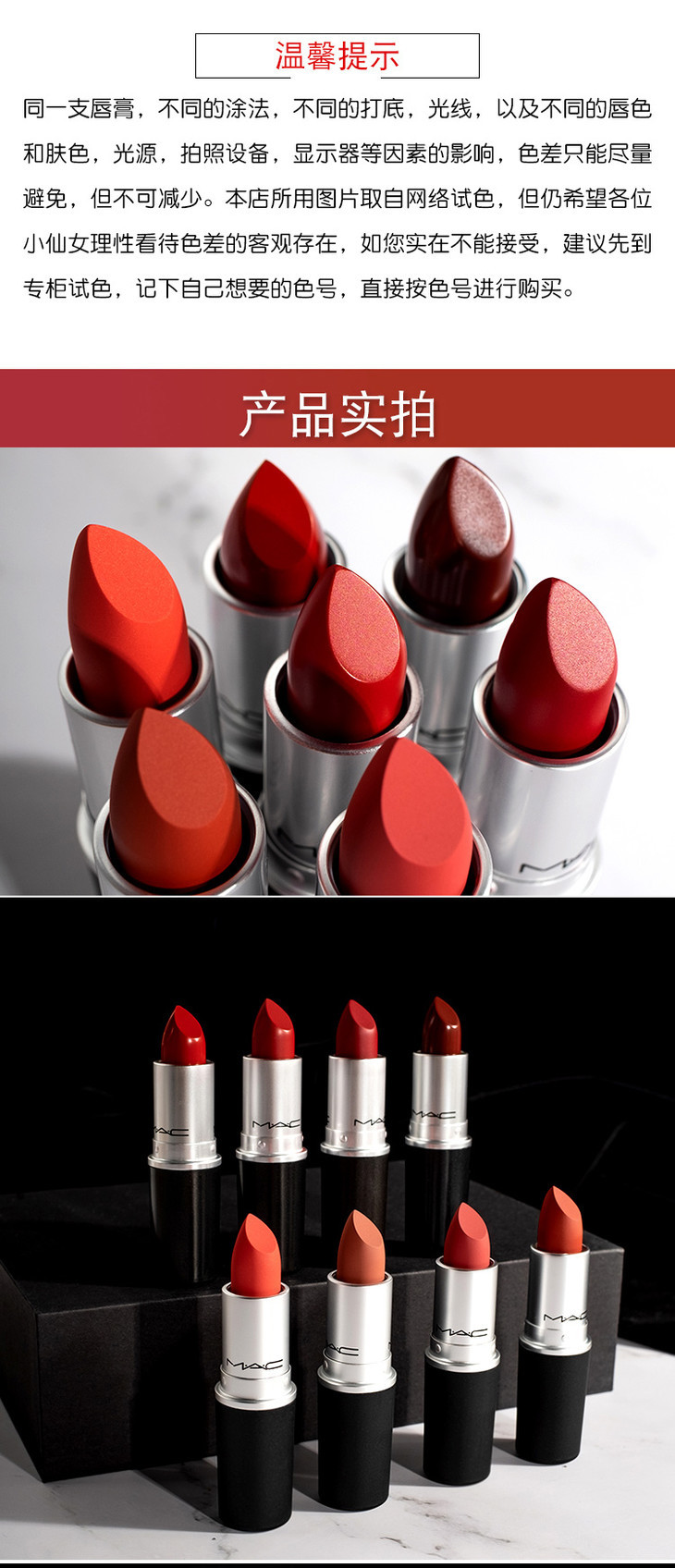 品牌:MAC/魅可 品名:经典黑管子弹头 色号: 602小辣椒砖红色 612俄罗斯红 646脏橘色 108牛血红色 916泫雅色(原316) 规格:正装唇膏3g 发货地:河南郑州/安阳保质期:3年物流信息:邮政/中通发货时效:现货排单发出,会在下单后48小时发出非质量问题不支持拒收和七天无理由退货 |