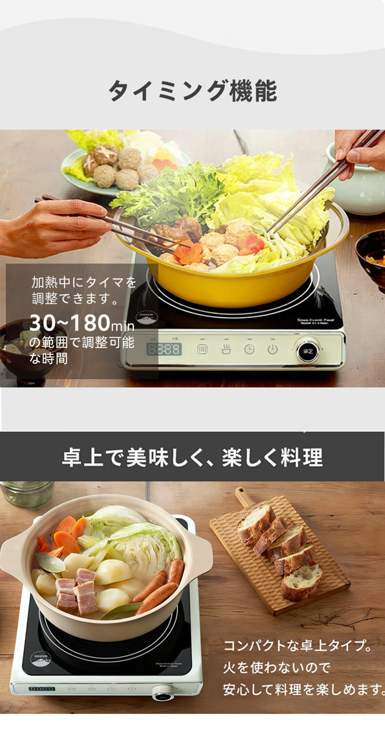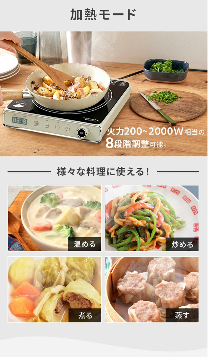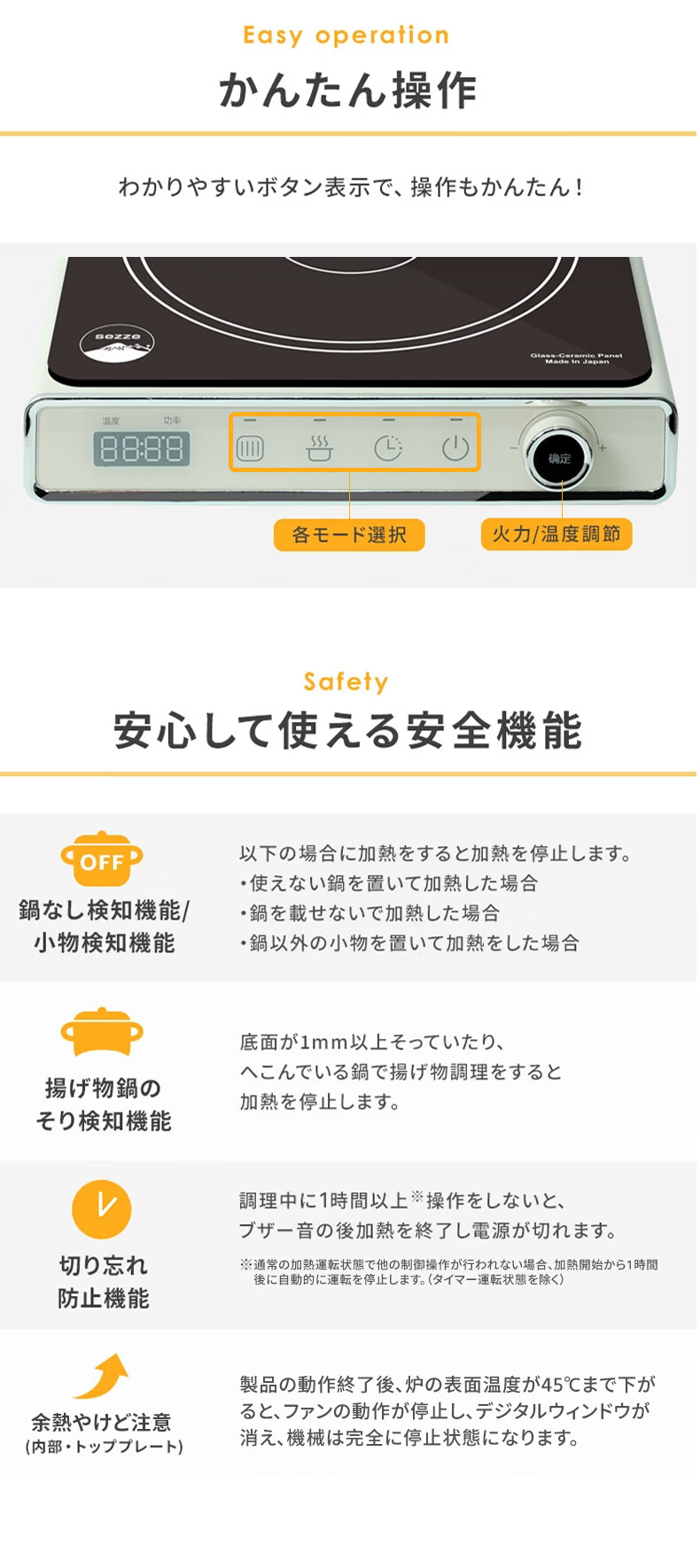 | 1.不挑锅具,家里锅都能用 2.无高频辐射,孕妇宝宝放心用 3.恒温慢炖,煲汤炖肉超入味 4.微晶面板,油污一擦就干净 5. 防干烧+自动断电,安全省心 6.无锅检测+油温检测,异常自动停热,防遗忘功能,超时未操作自动提醒,微晶玻璃面板,油污轻擦即净 |