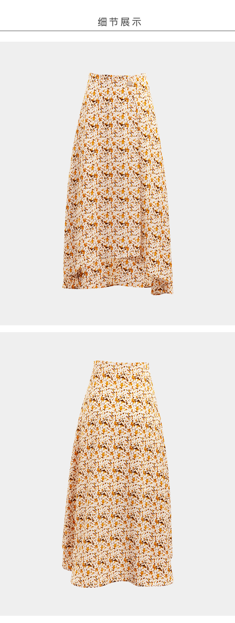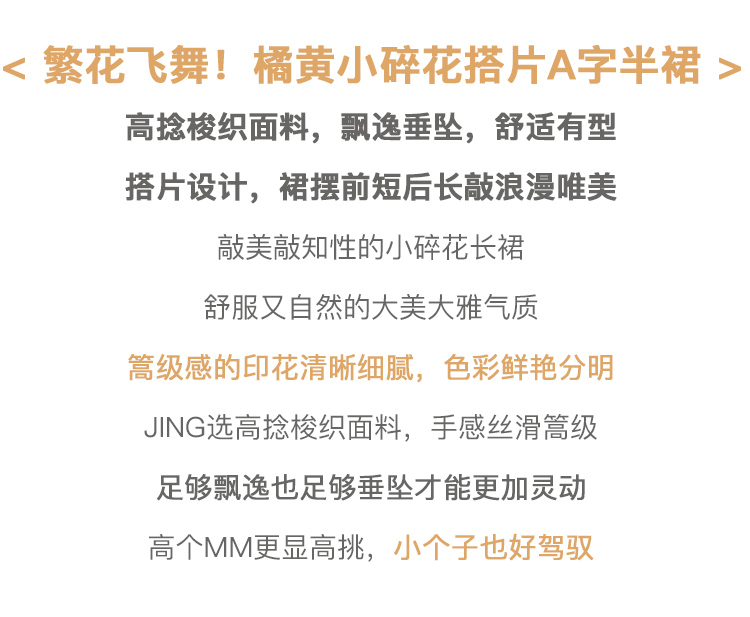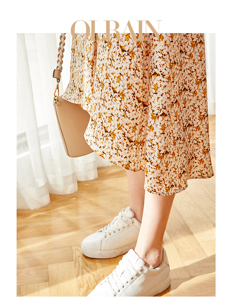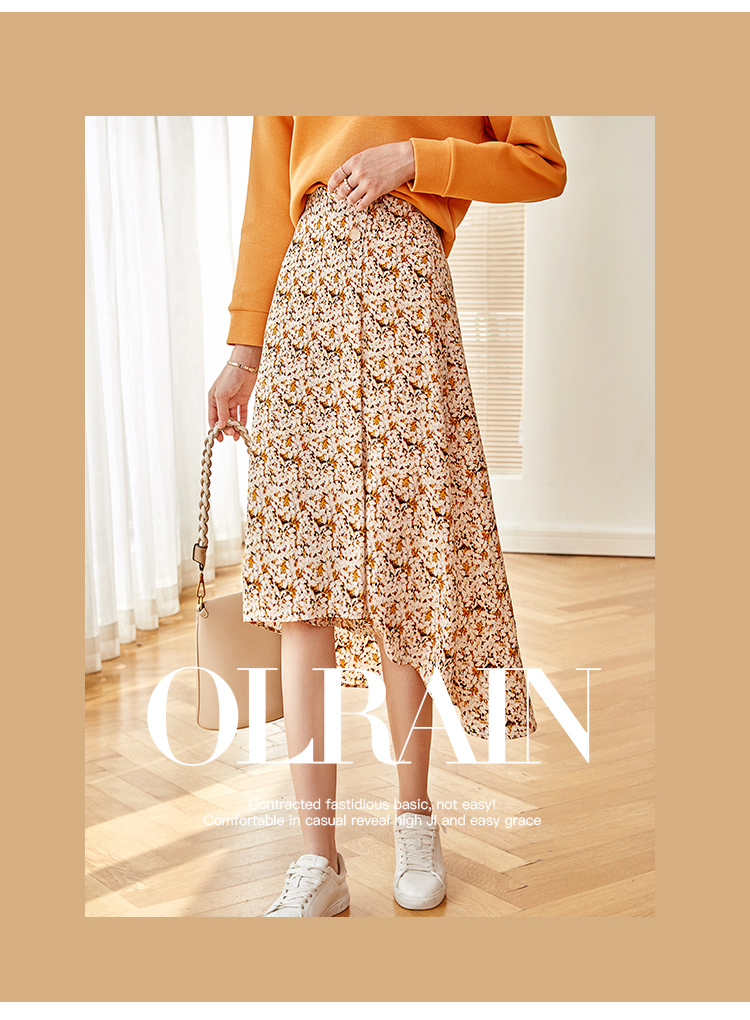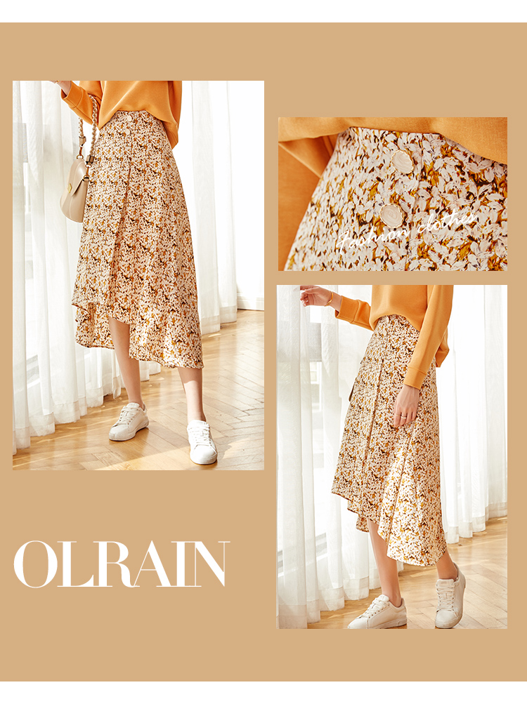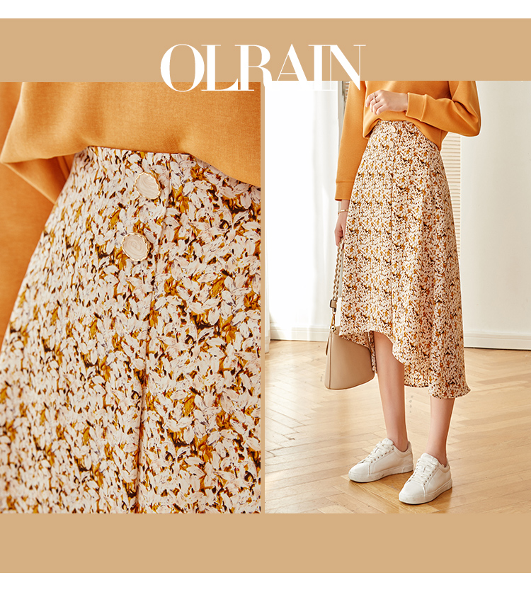 欧芮儿橘黄碎花半身裙女春季新款搭片不规则气质优雅垂坠感A字裙