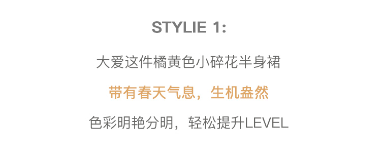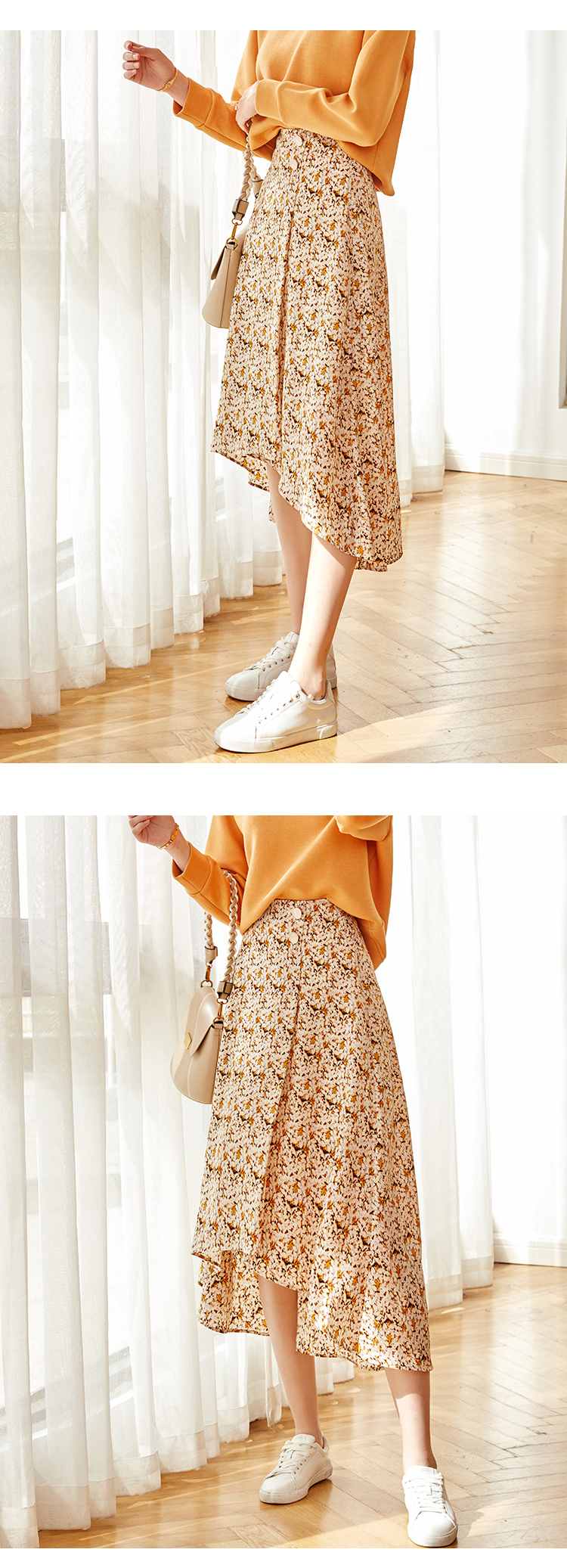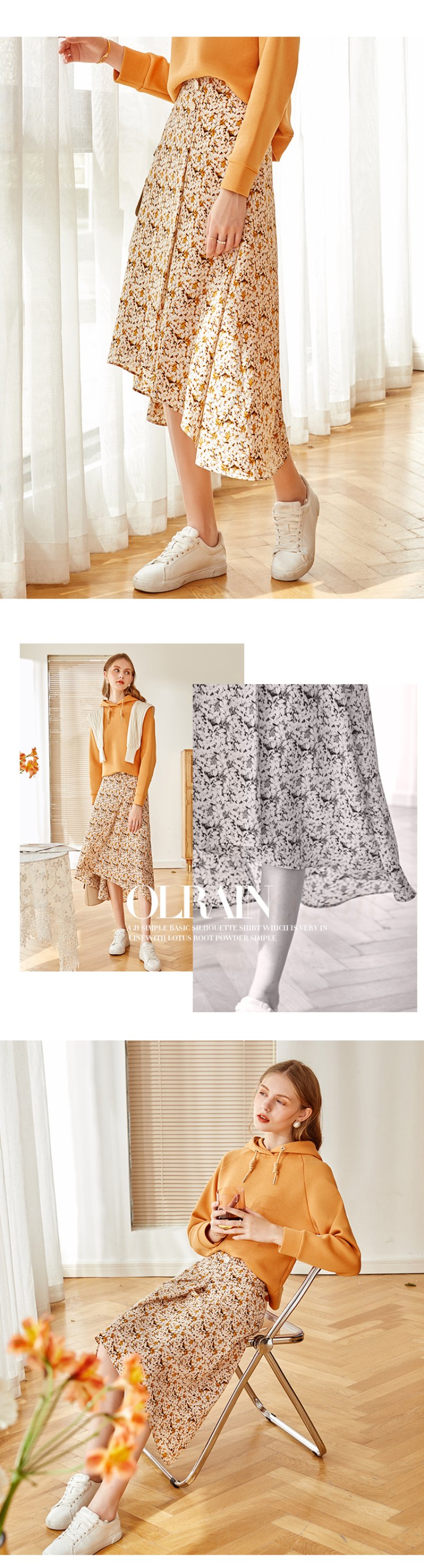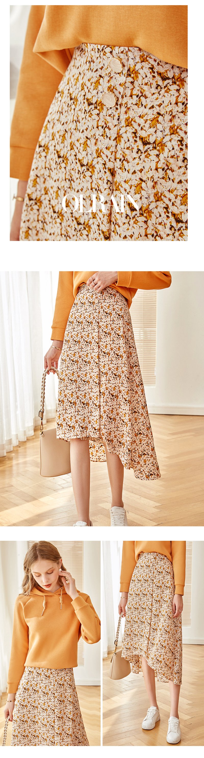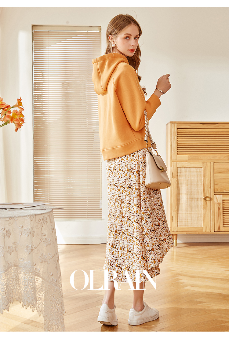 欧芮儿橘黄碎花半身裙女春季新款搭片不规则气质优雅垂坠感A字裙