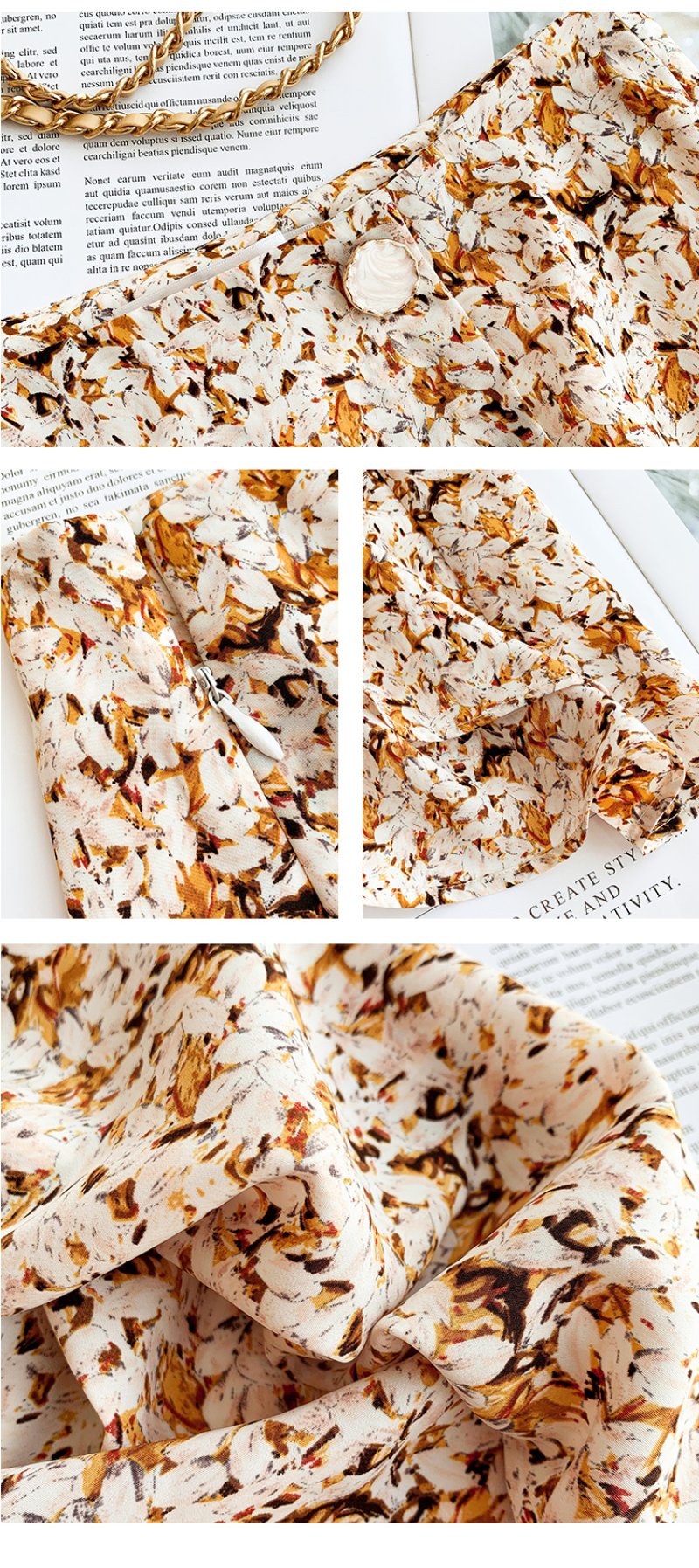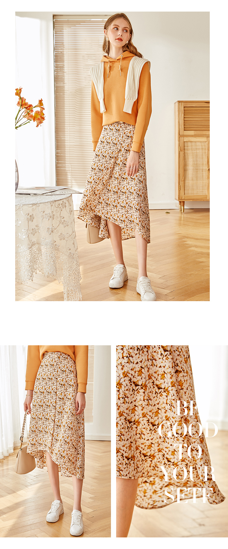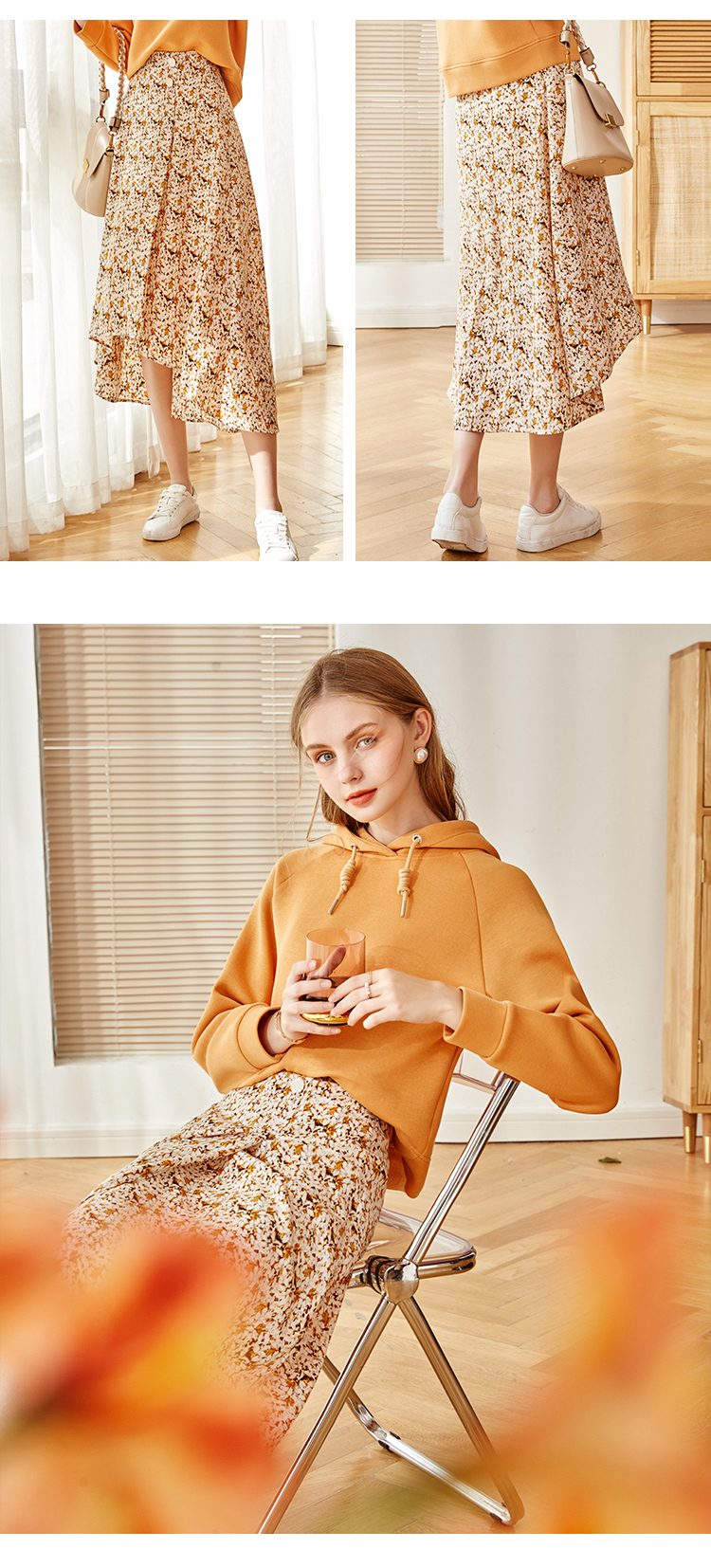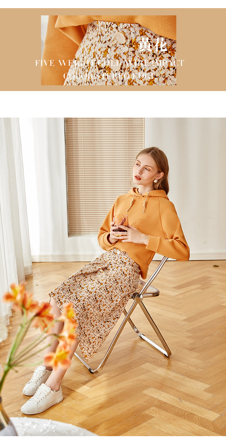 欧芮儿橘黄碎花半身裙女春季新款搭片不规则气质优雅垂坠感A字裙