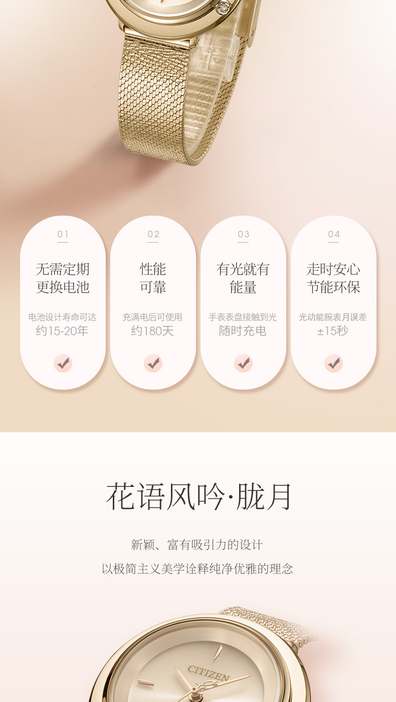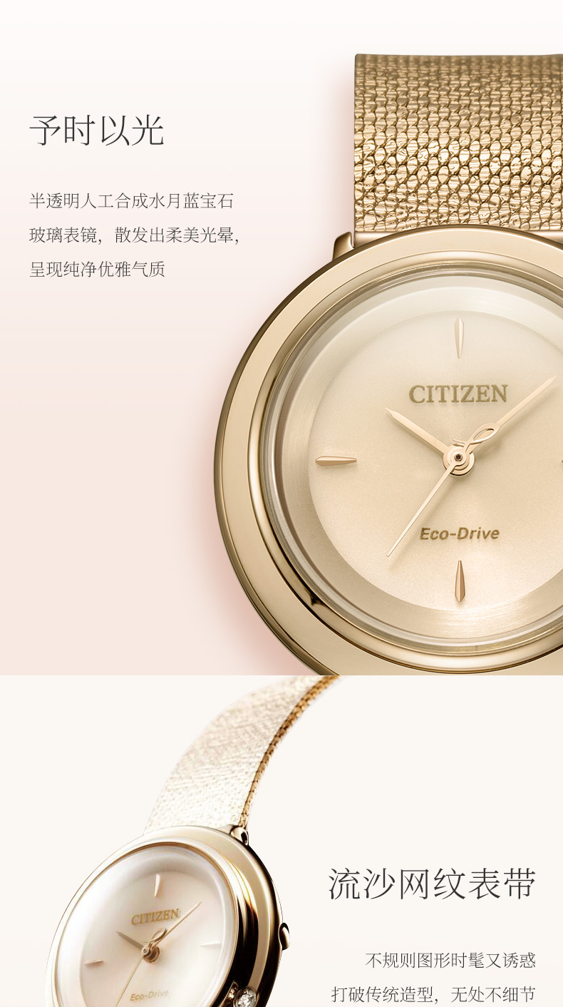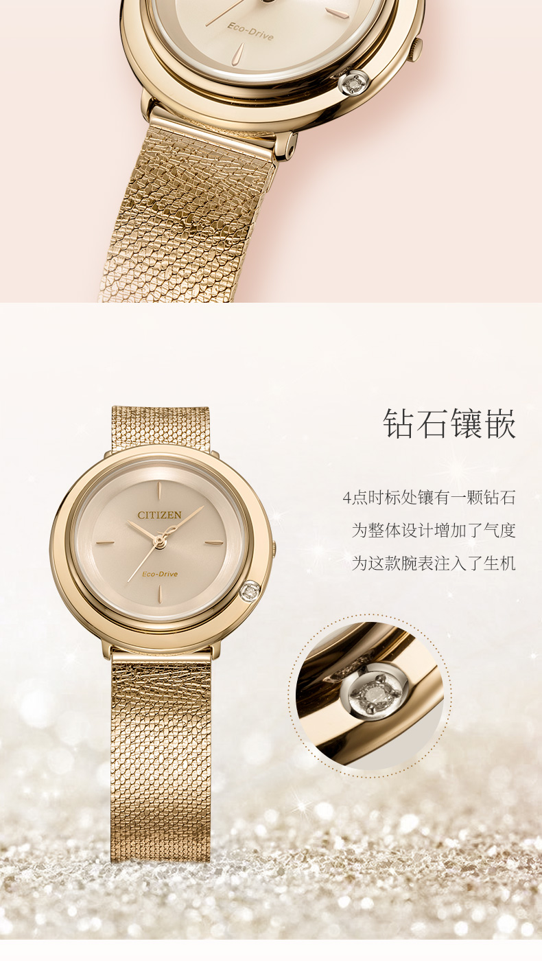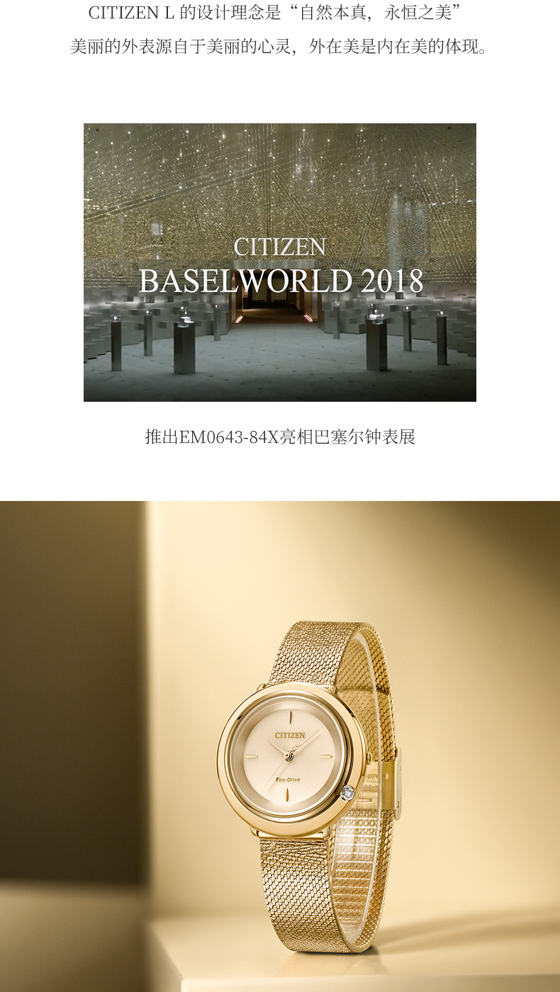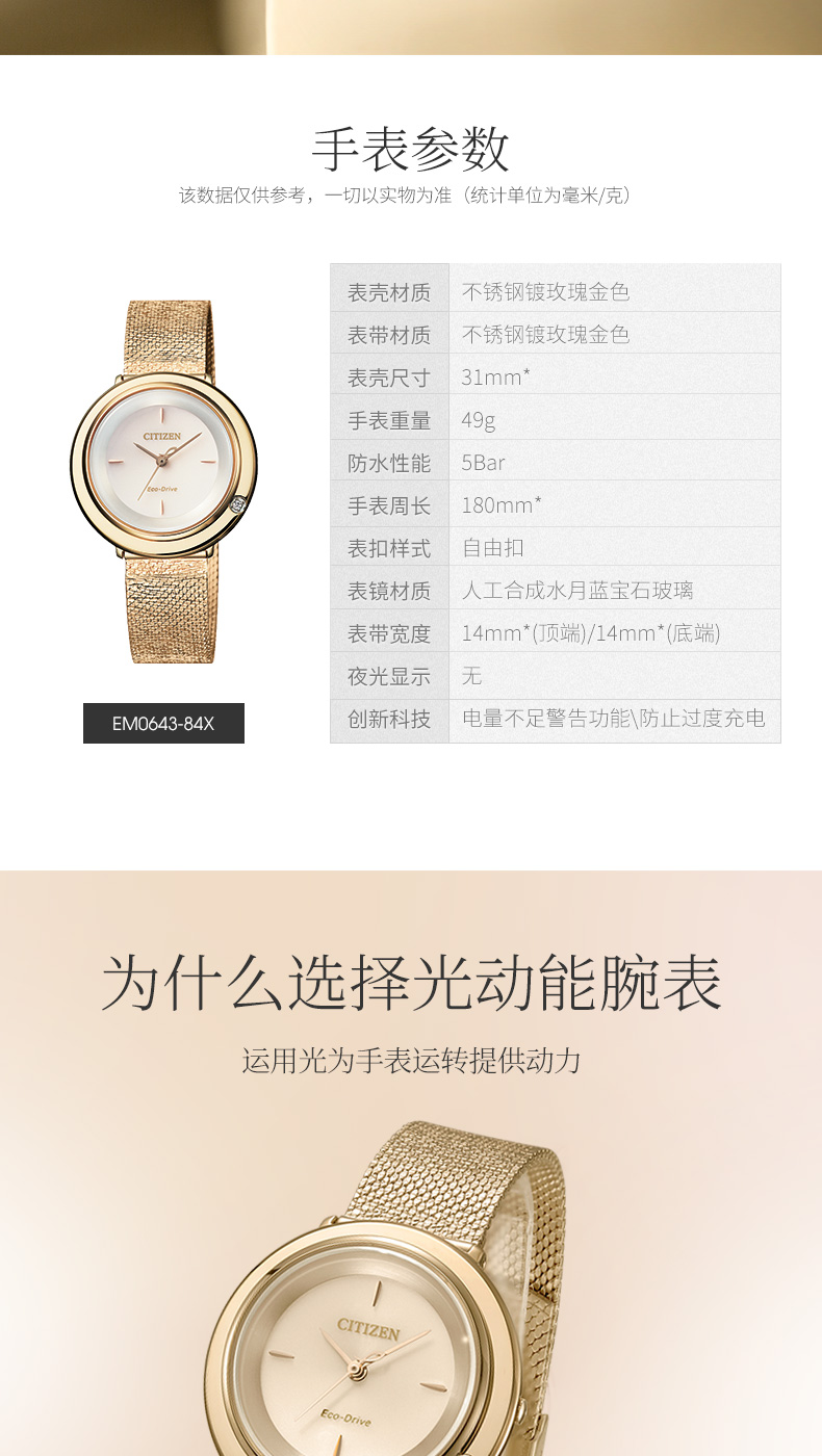 西铁城日本官方正品巴塞尔展出款光动能女表玫瑰金简约时尚EM0643-84X