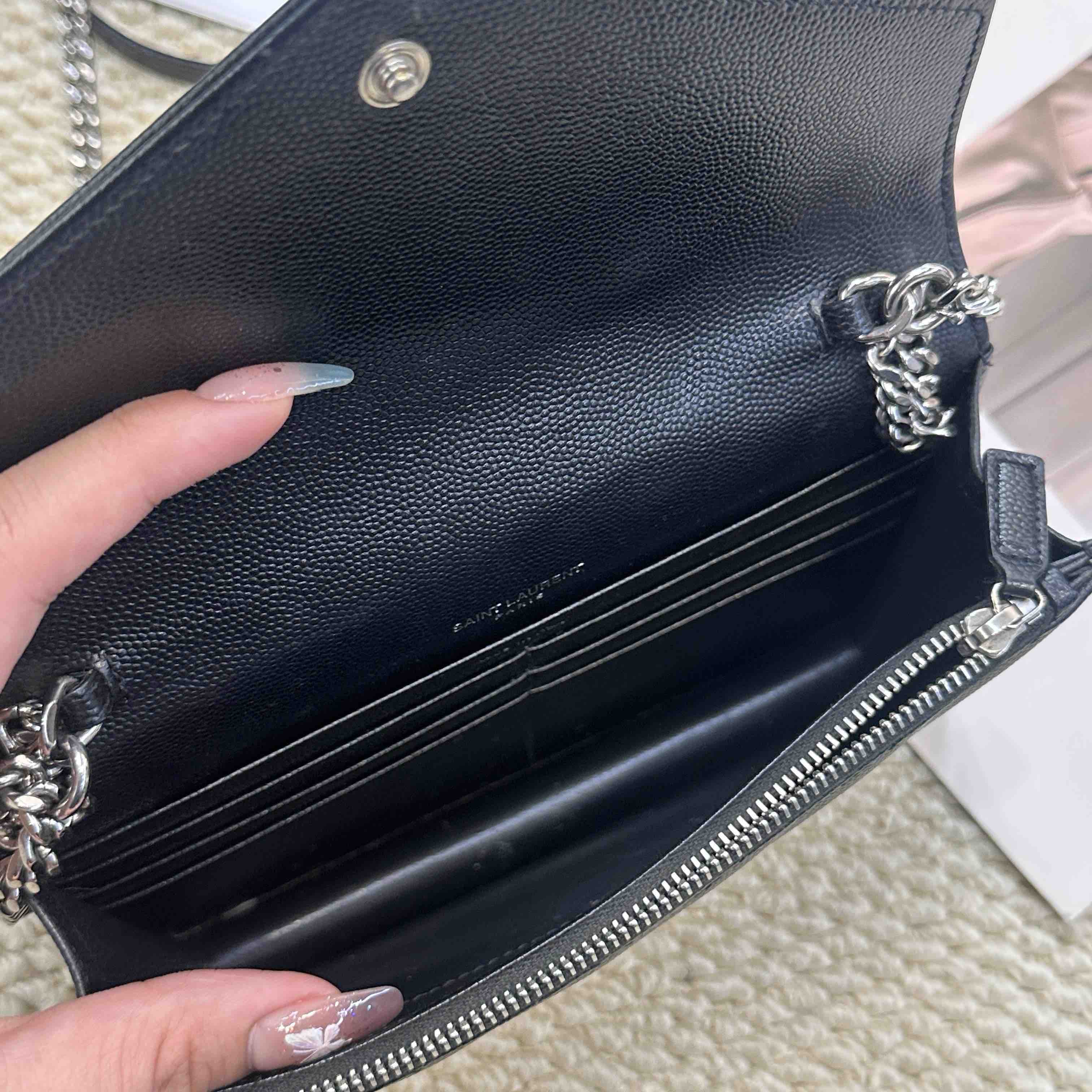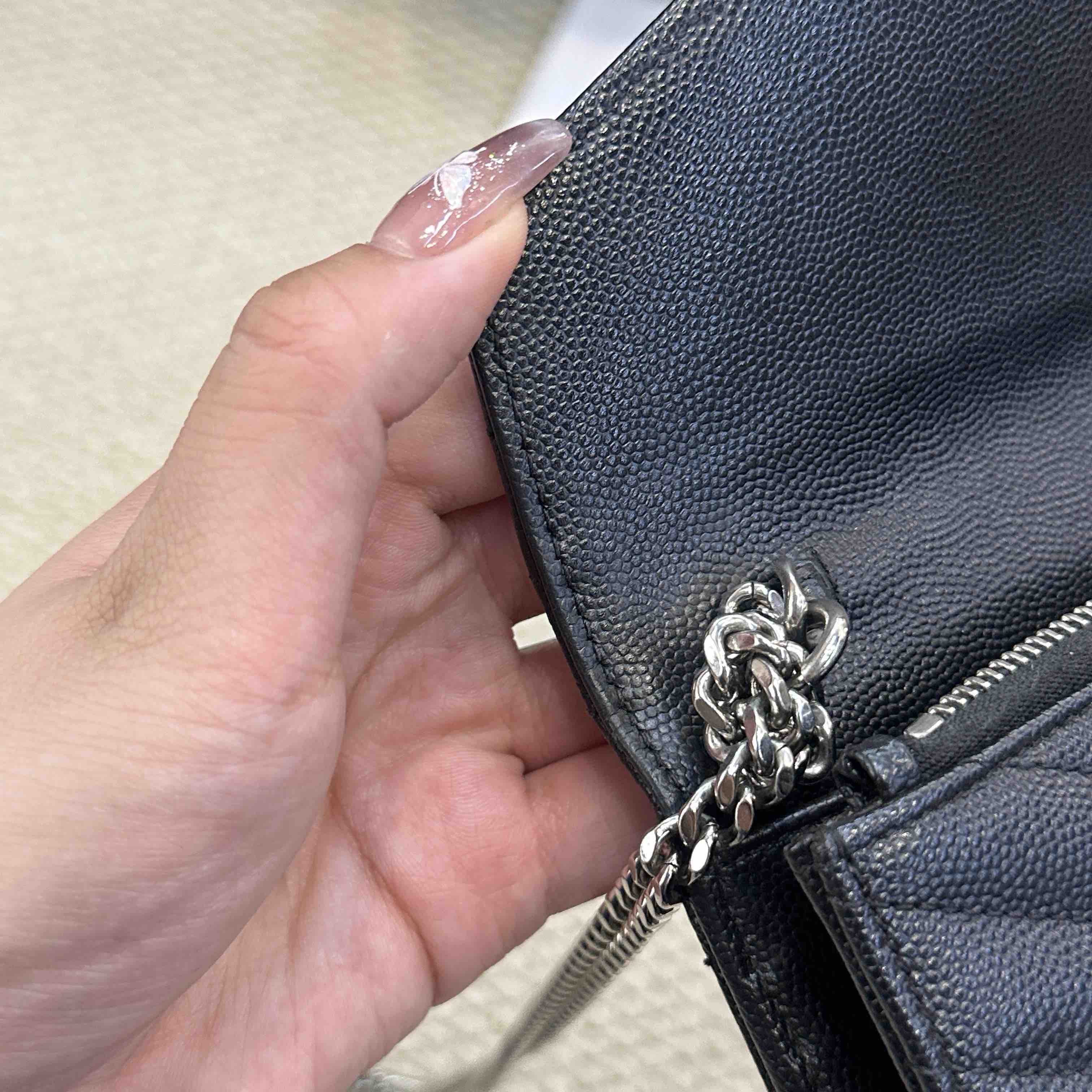 【商品详情】正品二手 YSL 黑银 鱼子酱牛皮 woc 信封包🗼95新 20x13 配件:链条。底部边角有正常使用磨损 内里正常使用脏 五金logo有正常使用划痕 气质拉满