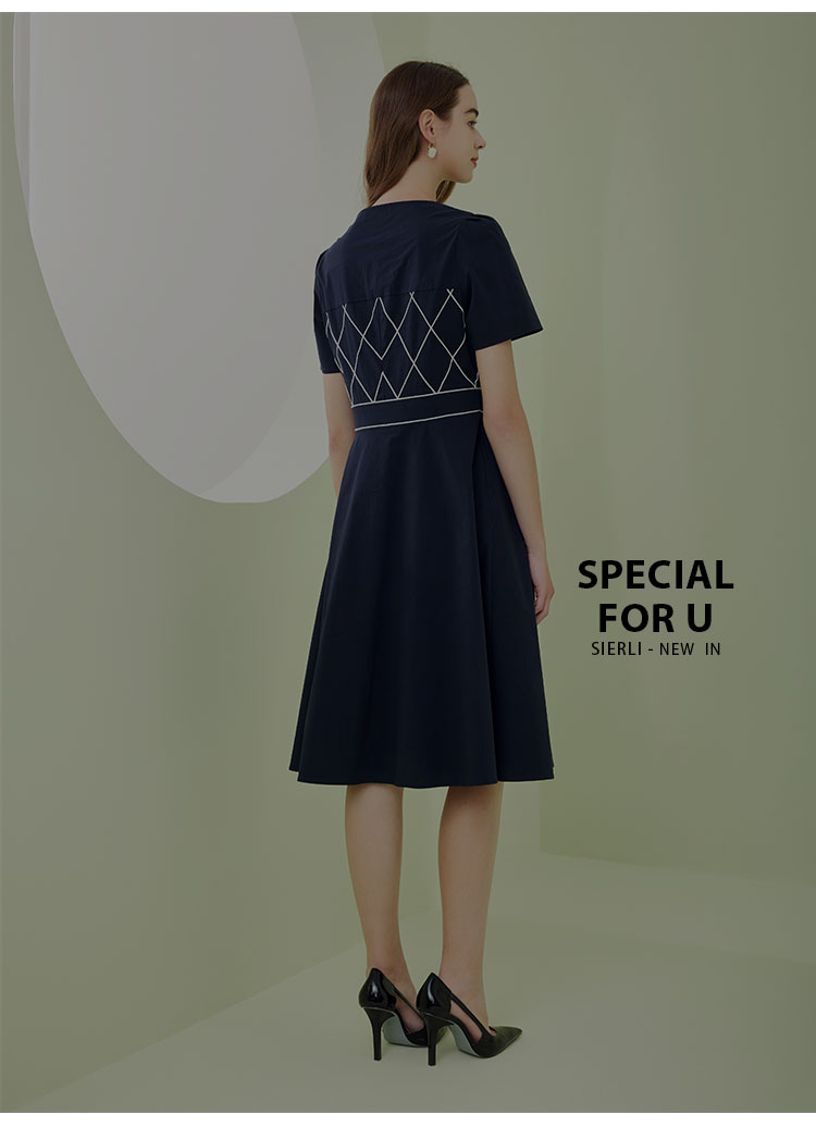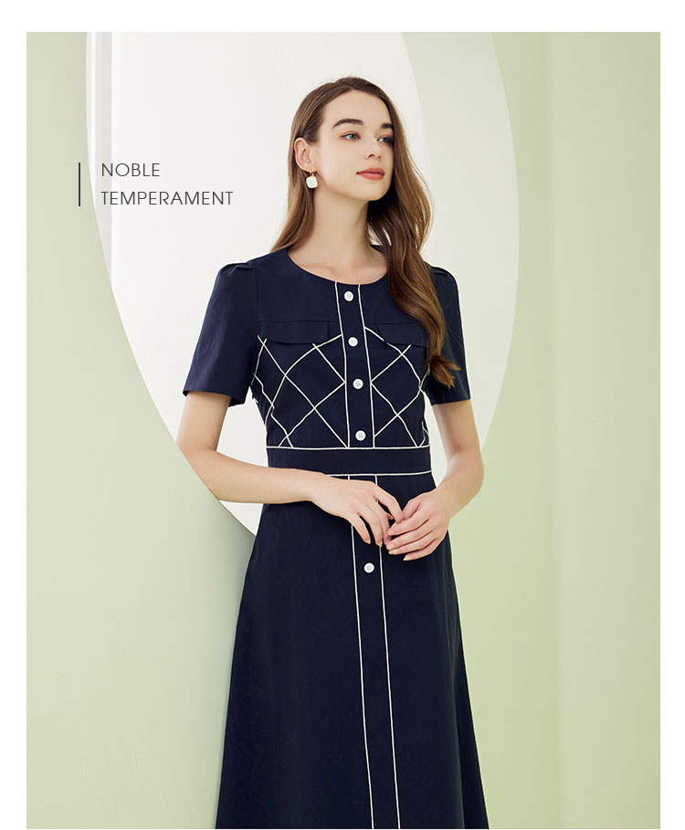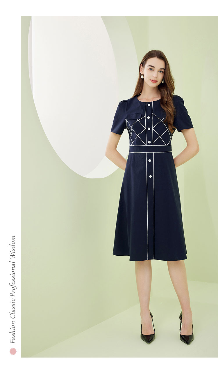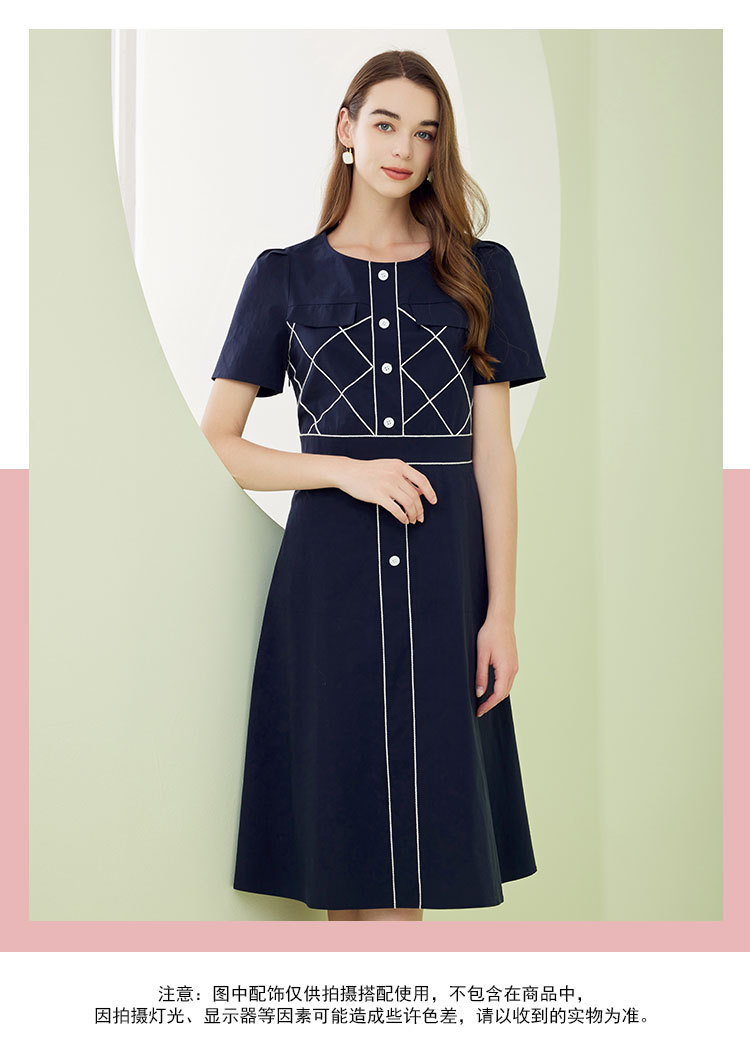 QF87D斯尔丽瑟俪2023夏季新款圆领门襟撞色绣花单排装饰扣收腰连衣裙