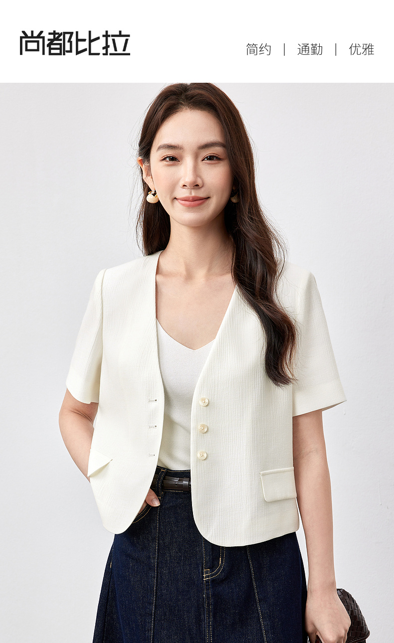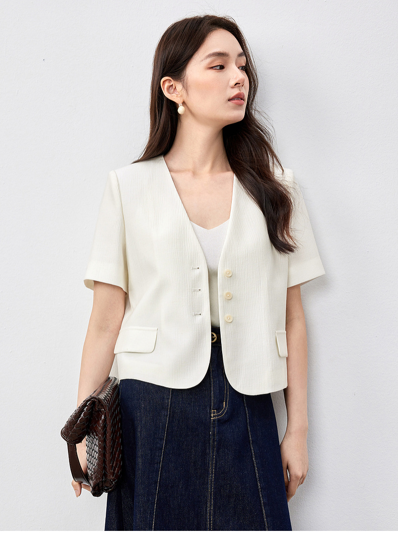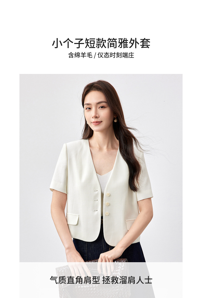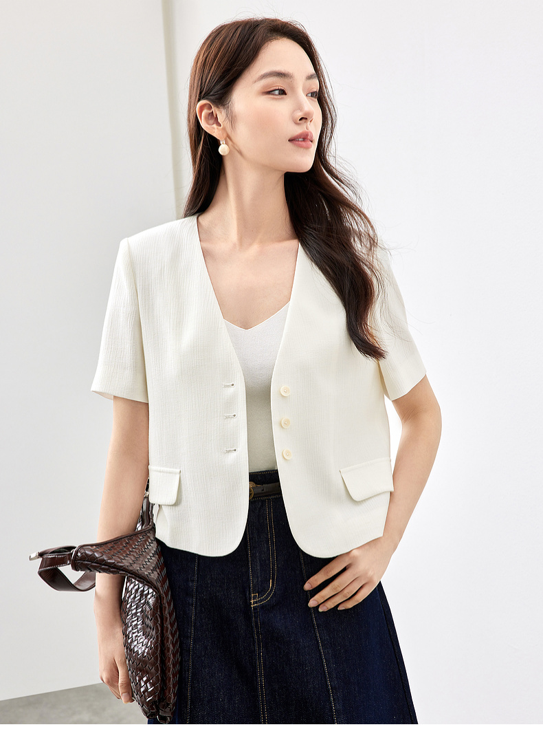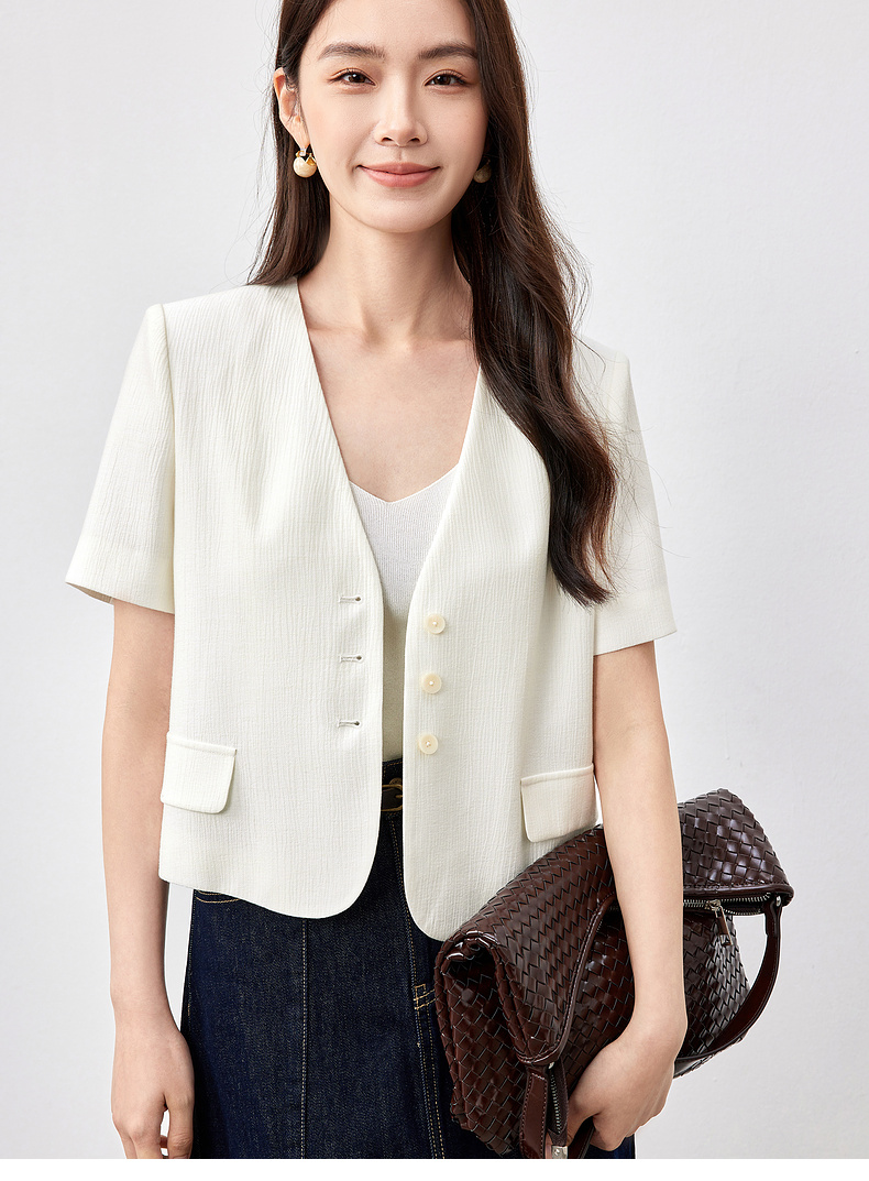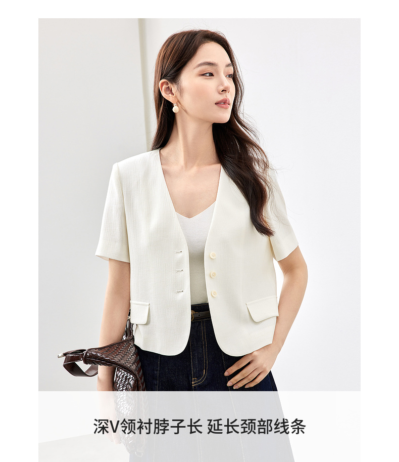 【内购】小个子简约通勤深V领单排扣垫肩微褶短款短袖外套-151W58307