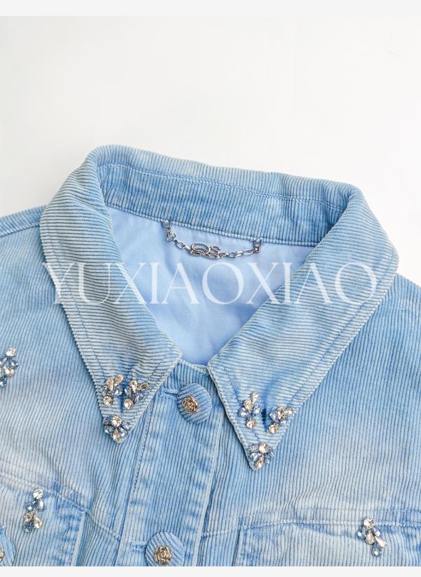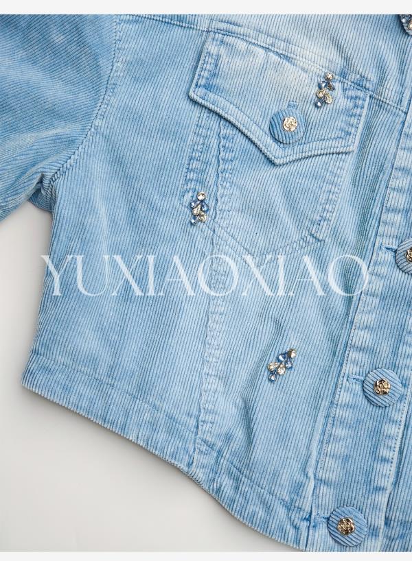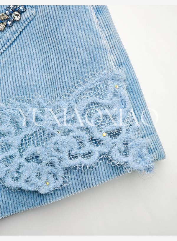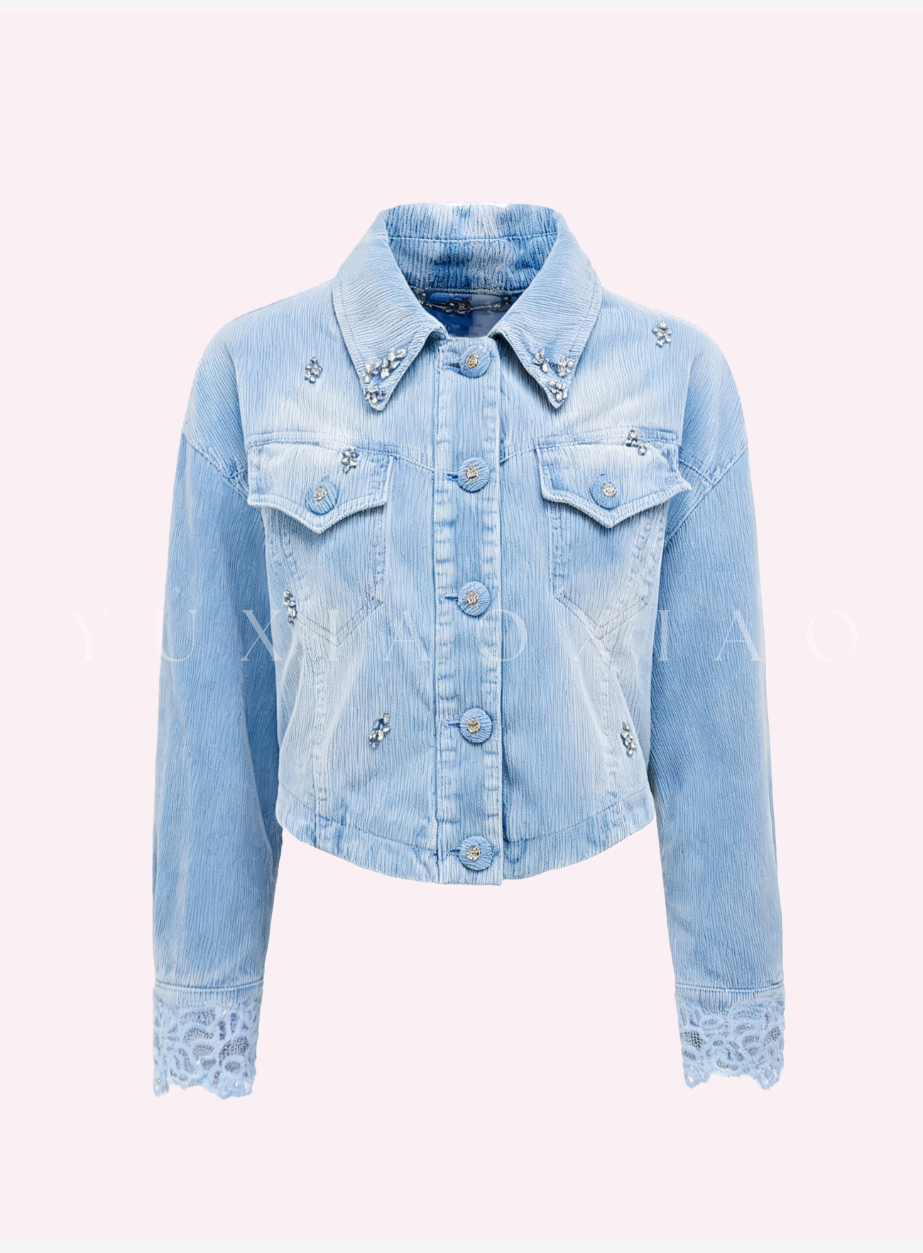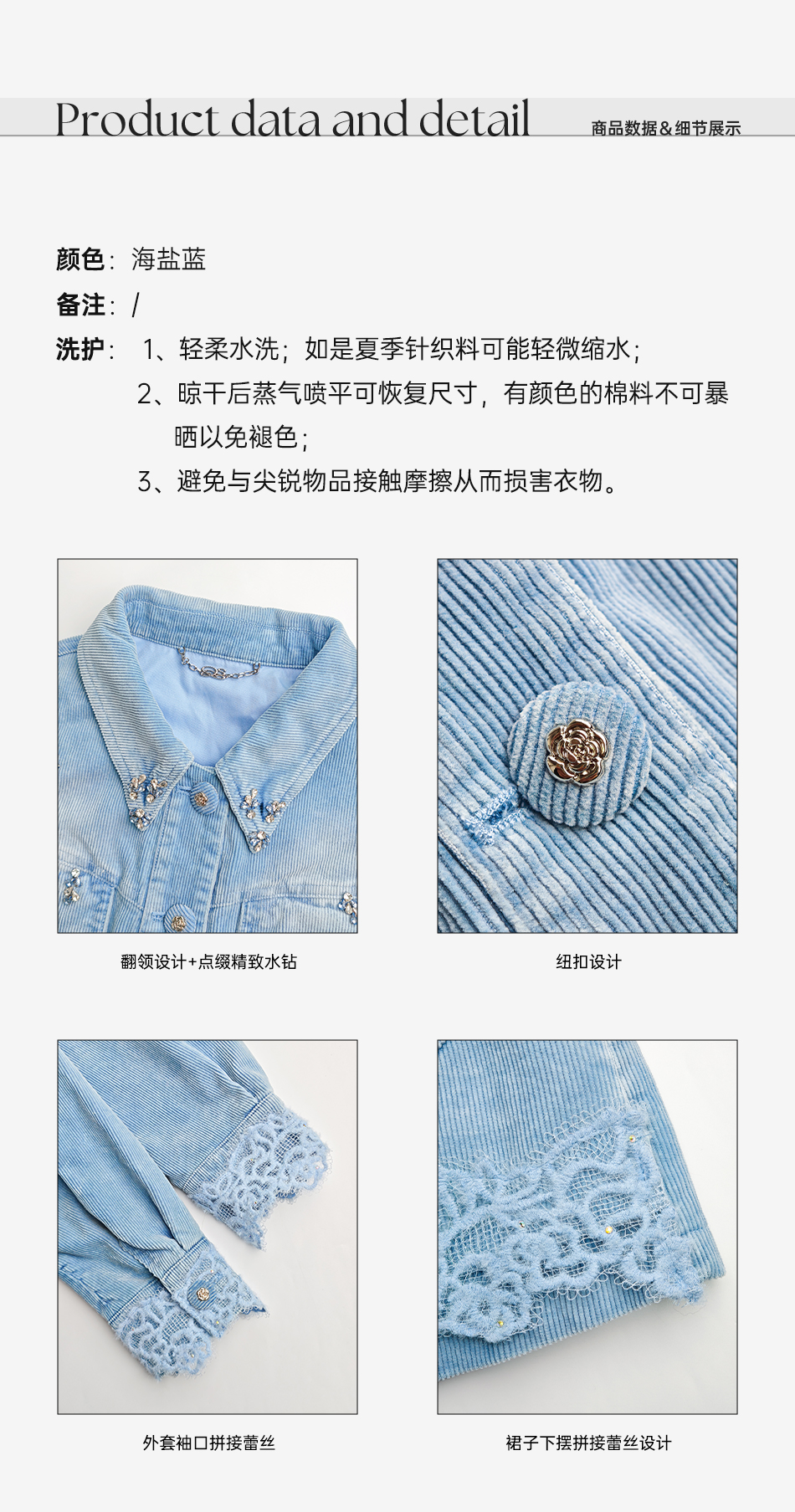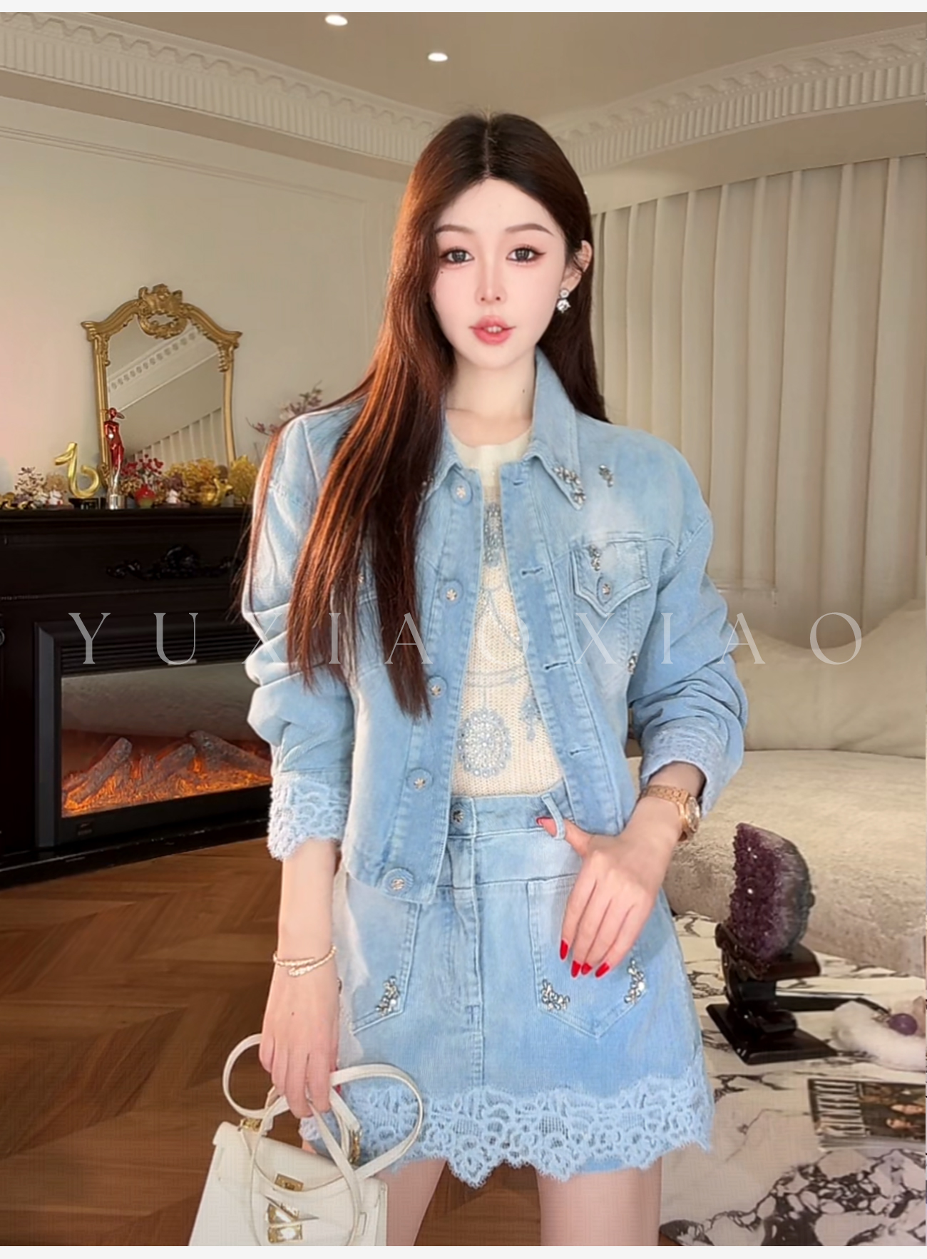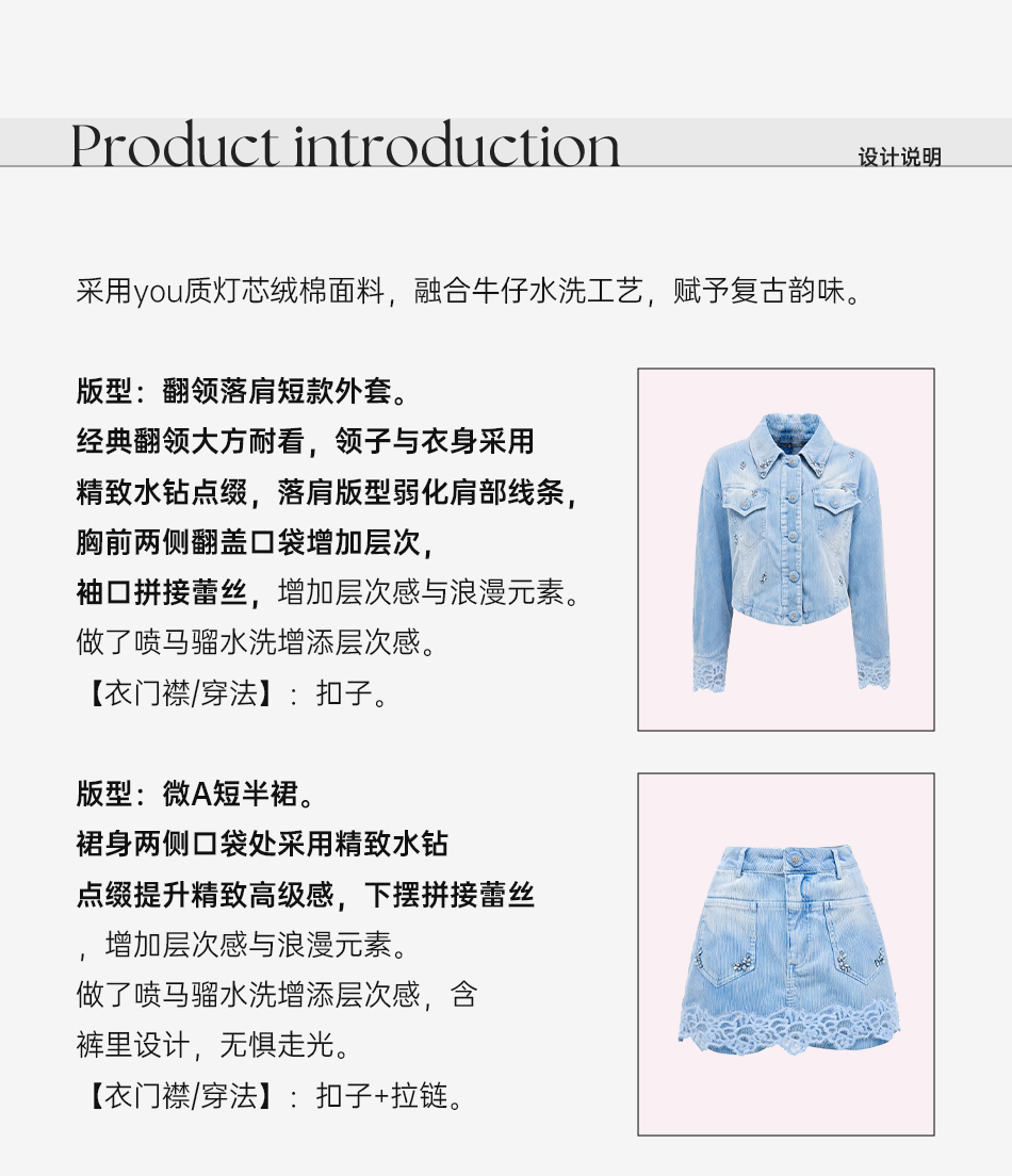 余潇潇【时代梦想家】100棉拼蕾丝精致水钻翻领落肩短款外套&短半裙