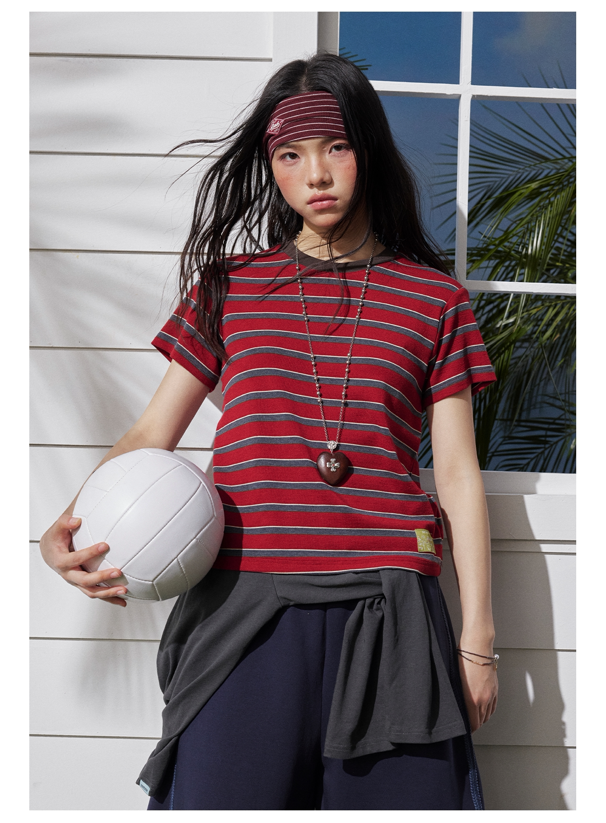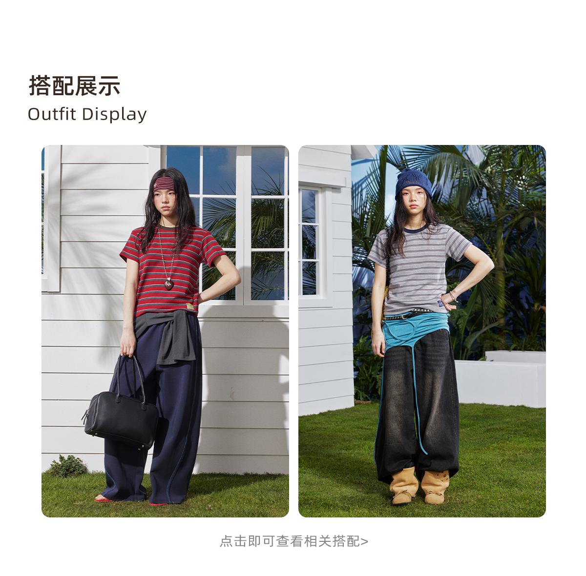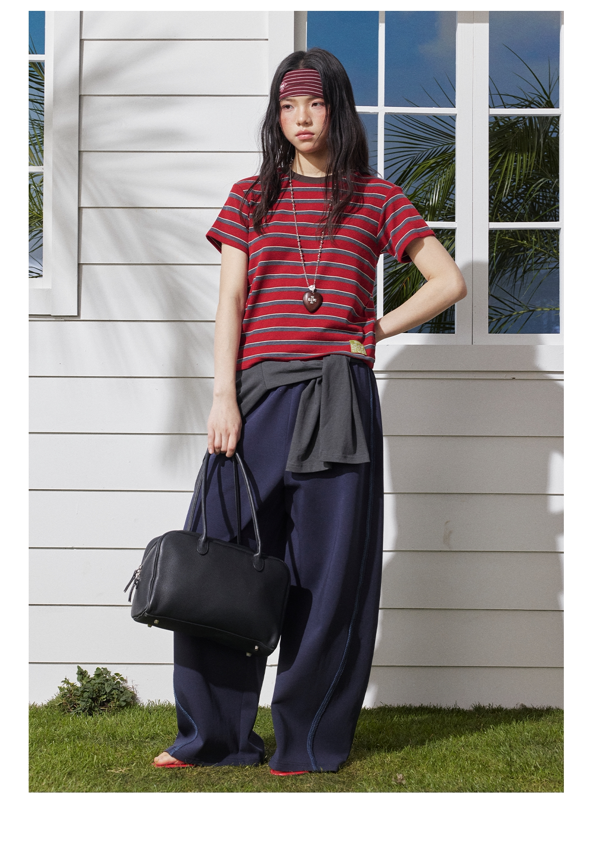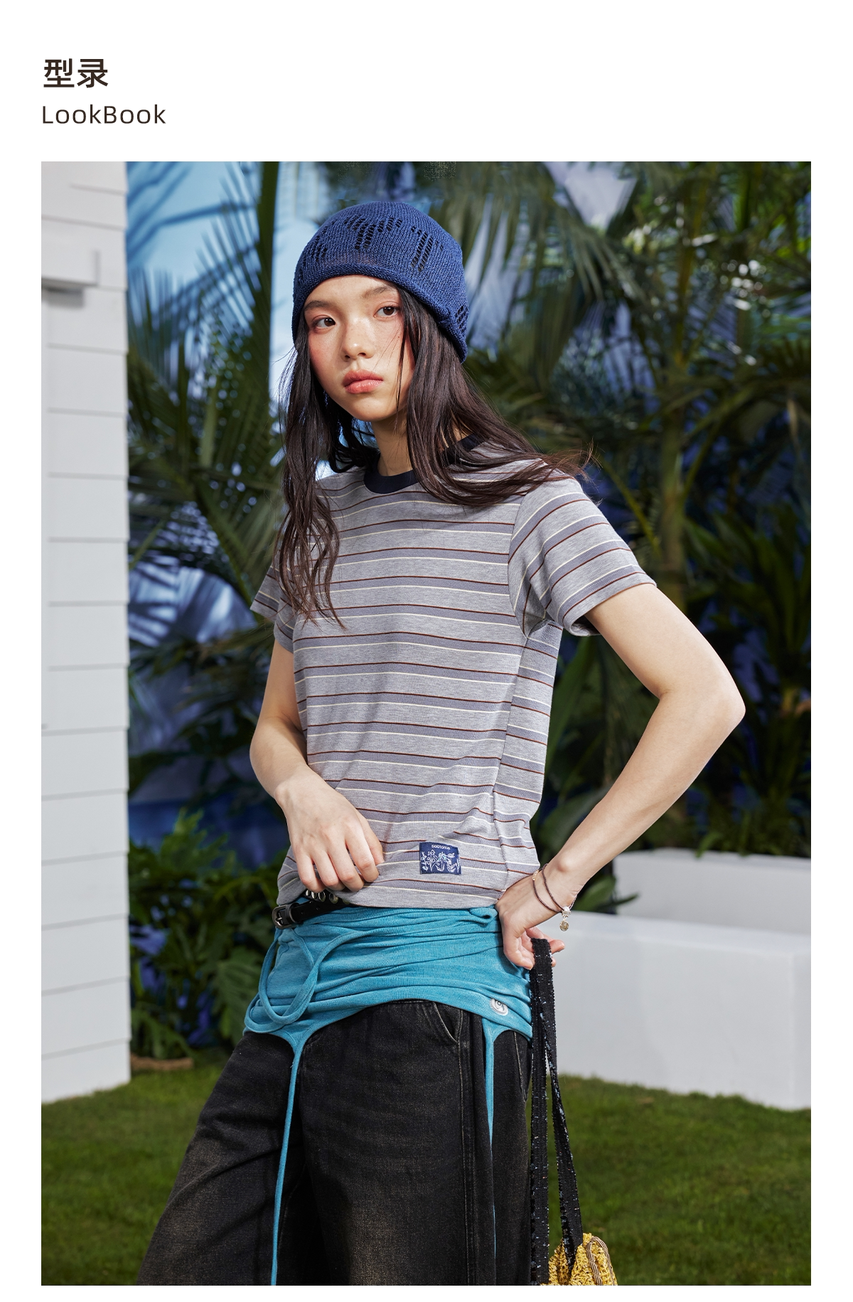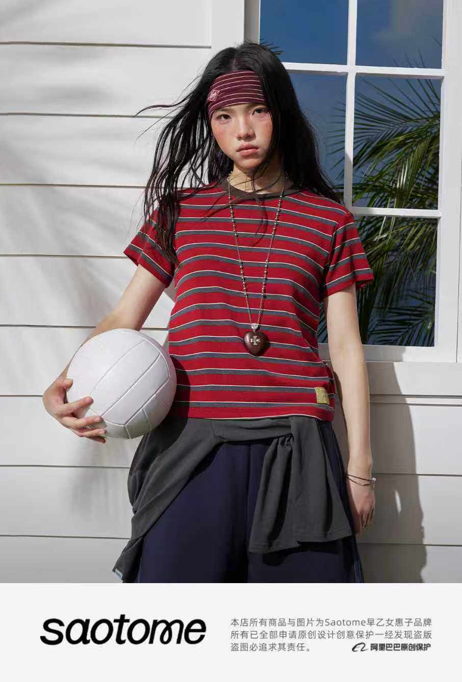 早乙女惠子saotome/STMTX222202/撞色条纹正肩短袖T恤