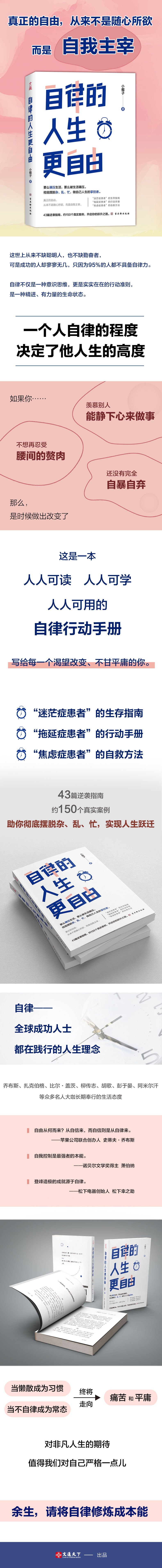 ◎ 真正的自由,从来不是随心所欲,而是自我主宰。对每一个不甘平庸的人而言,自律都是一门必修课。◎ 43篇逆袭指南,约150个真实案例,带你摆脱杂、乱、忙,实现人生跃迁。◎ “迷茫症患者”的生存指南,“拖延症患者”的行动手册,“焦虑症患者”的自救方法。 ◎ 乔布斯、扎克伯格、比尔·盖茨、柳传志、胡歌、彭于晏、阿米尔汗等众多名人大咖长期奉行的生活理念。