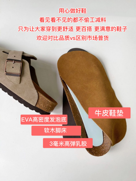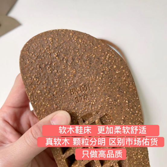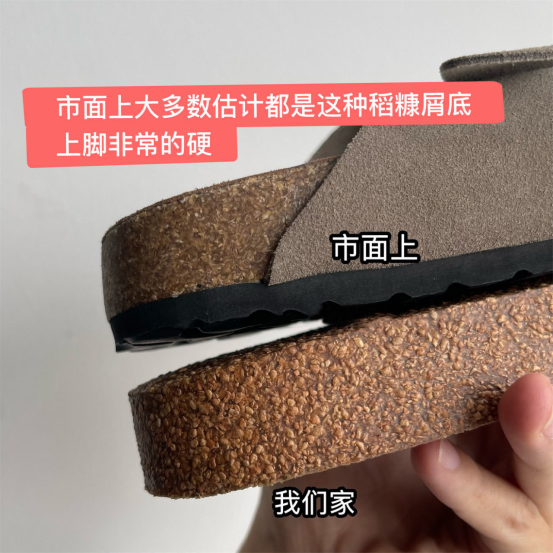 市面上大多数是都是PVC合成的中底或者稻糠屑 那种上脚是非常的硬,而且还是空心的 还穿久了还会脚疼 而脚床中底材料是橡胶软木颗粒,里面是实心的 上脚非常的舒适 这种进口材质市面上没有的 这个你们都是可以去对比 穿10年都不带坏的,质感贼好