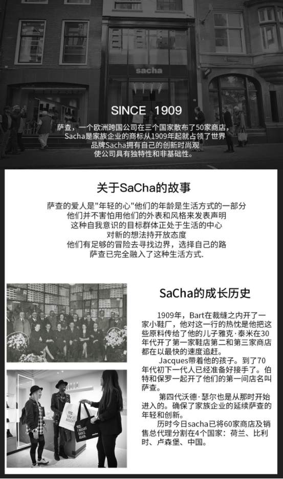 SACHA源自1909年的欧洲品牌 创始人Bart在裁缝之内开了一家小鞋厂 后来他把这些原料传给了他的儿子雅克·泰米 他在30年代接连开了3家鞋店 都在以最快的速度发展 70年代初,下一代人已经准备好接手了 伯特和保罗一起开了他们的第一间店名叫萨查 第四代沃德·瑟尔也是从那时开始进入的 确保了家族企业的延续萨查的年轻和创新 历时今日sacha已将60家商店及销售总代理分割在4个 国家:荷兰、比利时、卢森堡、中国