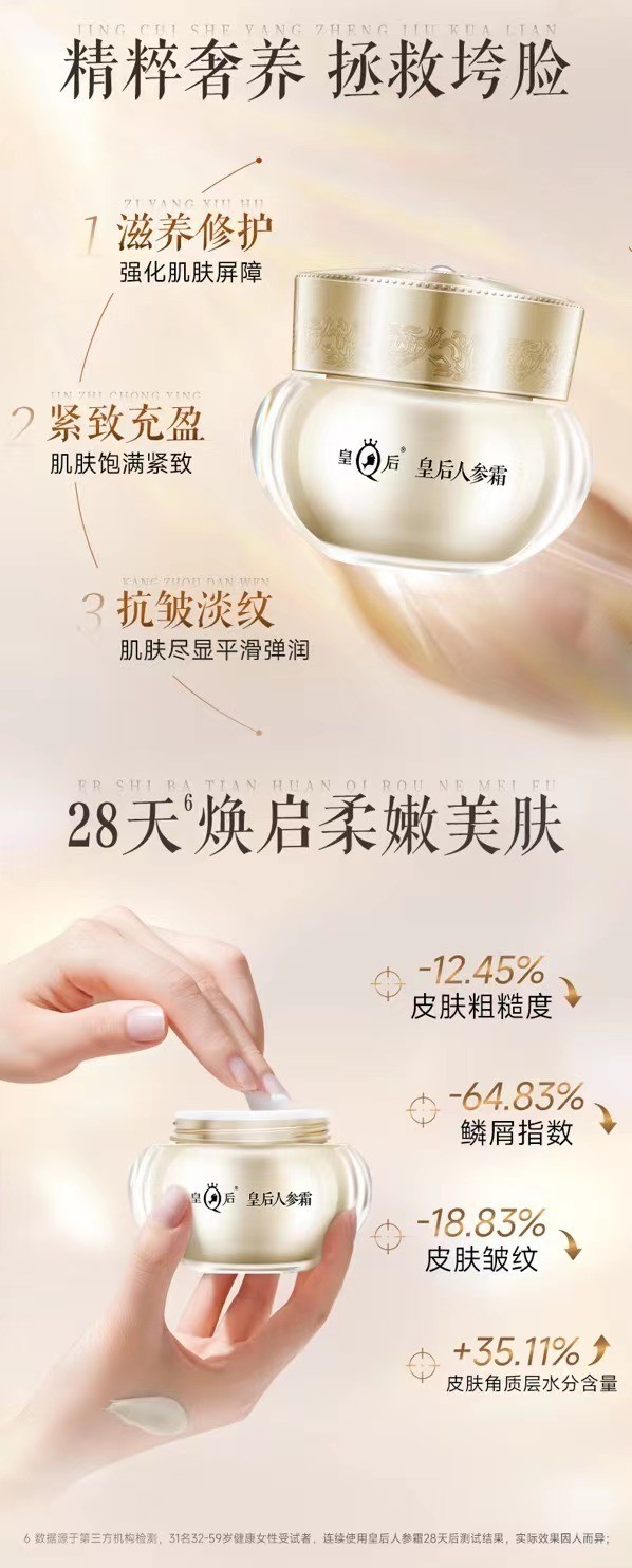 人参霜有三大功效❗ 第①大 滋养修护❤️ 过度清洁、滥用产品、高油高糖、熬夜等不良生活习惯等造成的屏障受损,建立“厚脸皮”帮肌肤回归“无坚不摧”的状态。 第②大 紧致充盈❤️ 拯救皮肤胶原蛋白免遭毒手。“失足”的胶原蛋白少了,皮肤的嘭弹和紧致就有了新希望,消失的下领线、干瘪的苹果肌,都会慢慢找寻回来 第③大 抗皱弹嫩❤️ 缓解动态表情纹,预防新生纹,淡化已经产生的纹路,抚平脸上的沟壑。提高皮肤弹性,让抗皱事半功倍 !