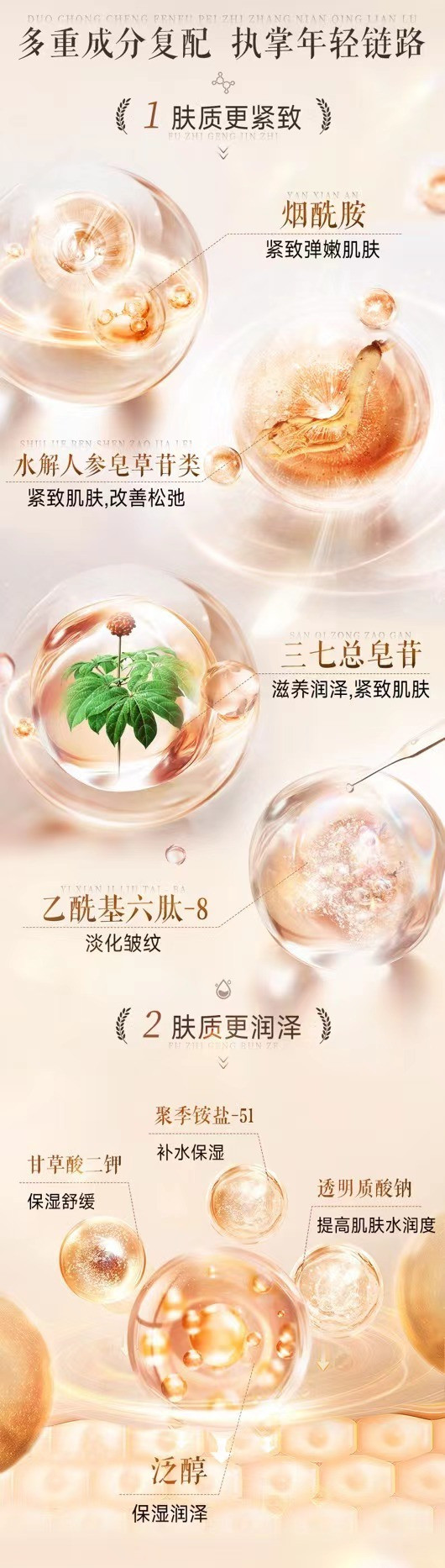 除此之外,联合“金不换”三七,精炼提纯三七总皂昔75%以上,紧致力直接拉满。 搭配明星成分:乙酷基六-8高能抚平动态纹、烟酷胺淡化静态纹!双管齐下!多种精协同复配,加速修护,平滑纹理,让我们不再为年龄所困,不再为肌龄所闲。