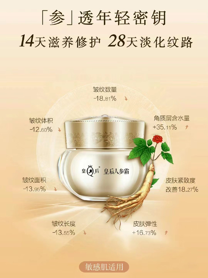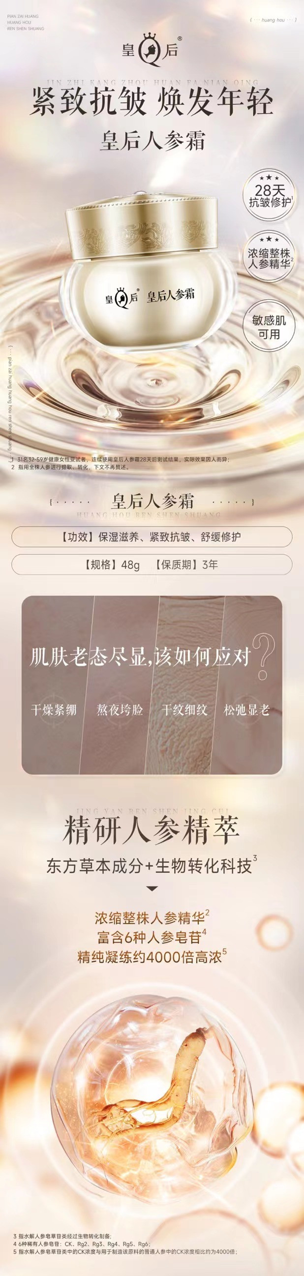 抗老力作「皇后人参霜」❗ 熟悉片仔癀的朋友都知道,片仔癀家的面霜是头部产品,口碑和销都是实力的证明。 这款人参霜更是重磅之作,作为国货国企,片仔癀有中草药研究实验室,这也支撑着本草+科技的研发理念。很适合有们国人的肤质。 以参养颜,调养气色。直击国人显老源头,非常适合25+准备抗老的你 💖