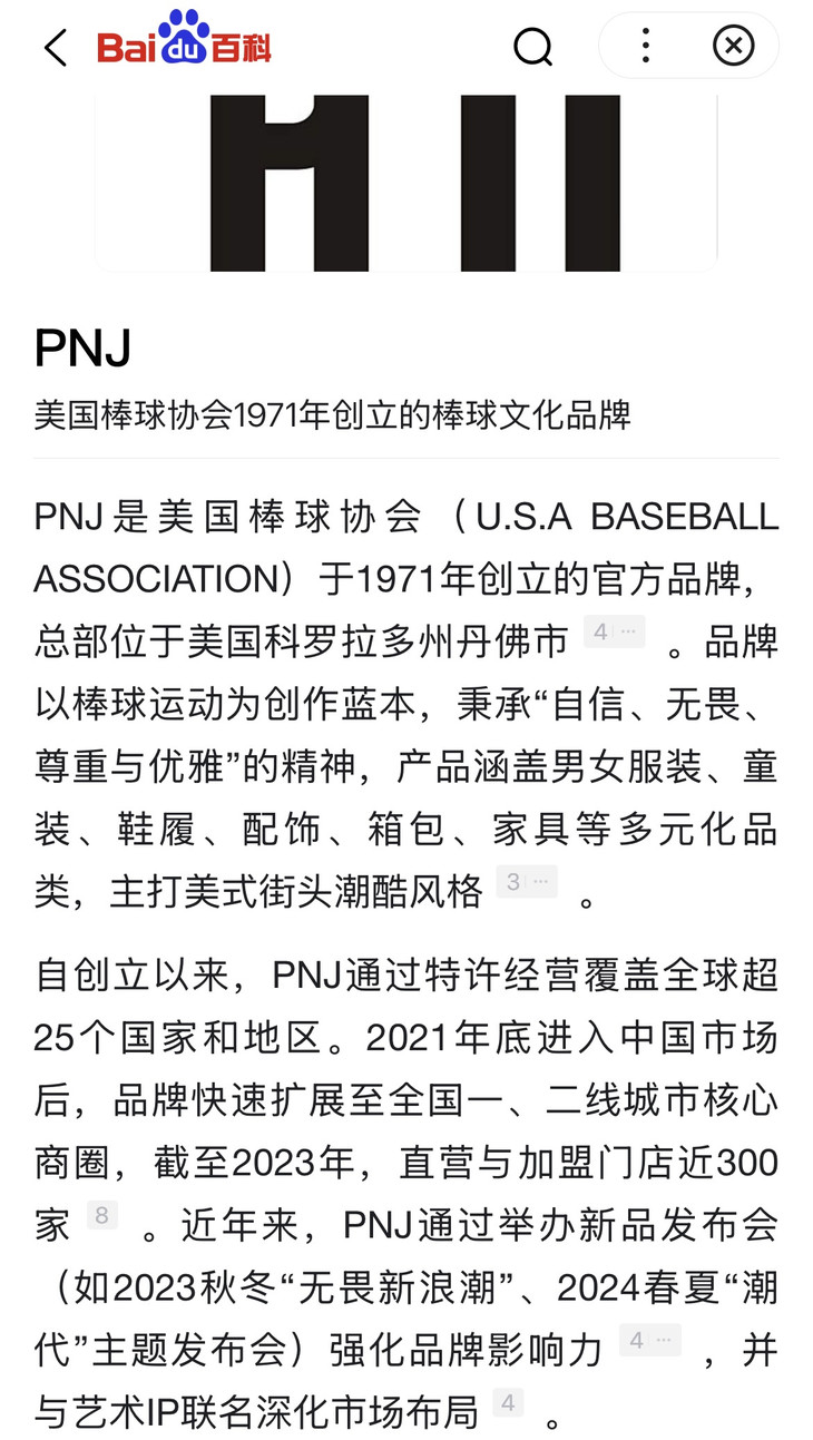 PNJ于1971年在美国创立 美国棒球协会官方品牌 在美国及香港地区拥有多家门店 在国内一线城市万达商圈 高档百货商圈拥有众多专卖店 超多明星街拍同款 一整个火到不能行❗ ⚠️周董都不能拒绝的品牌❗ 贝克汉姆夫妇都心爱的潮牌PNJ!
