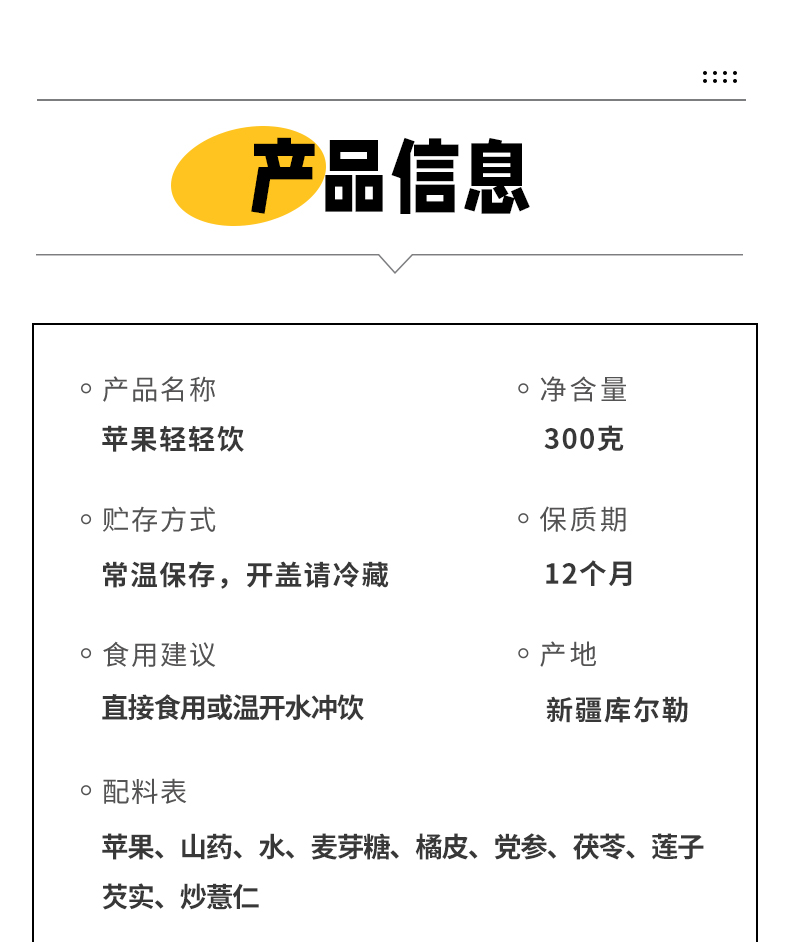 【配料】苹果、山药、睡、麦芽糖饴、橘皮、党参、茯苓、莲子、芡实、炒薏仁
