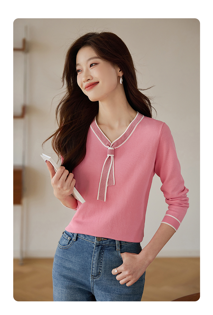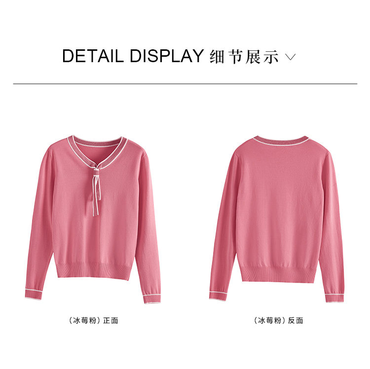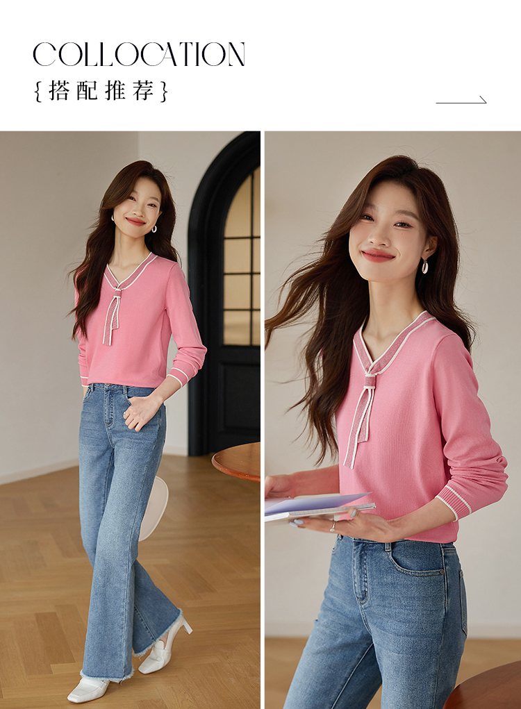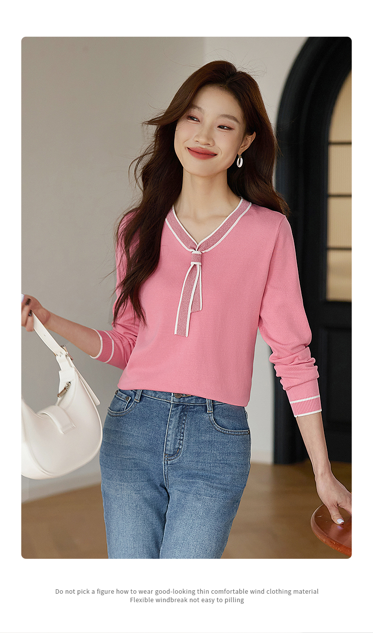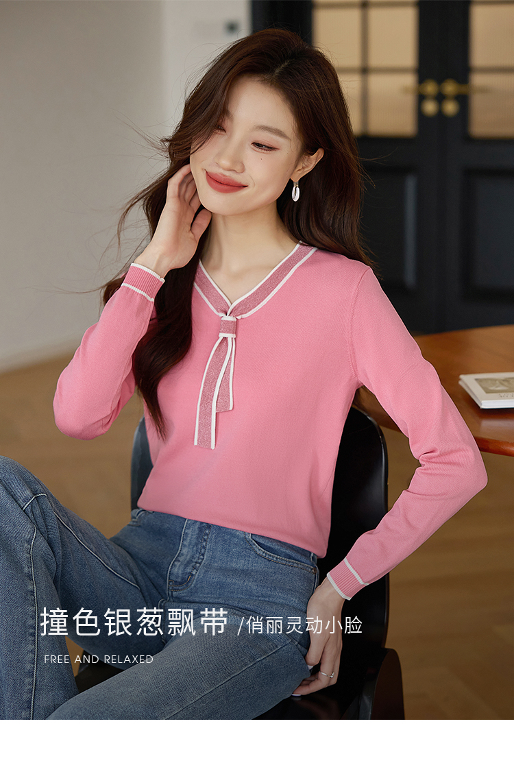 【专属特价】熙世界气质飘带针织衫女秋装新款名媛风撞色V领长袖套头上衣