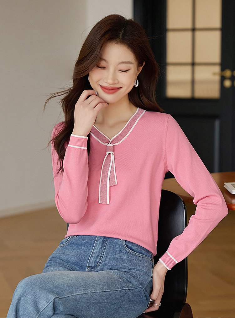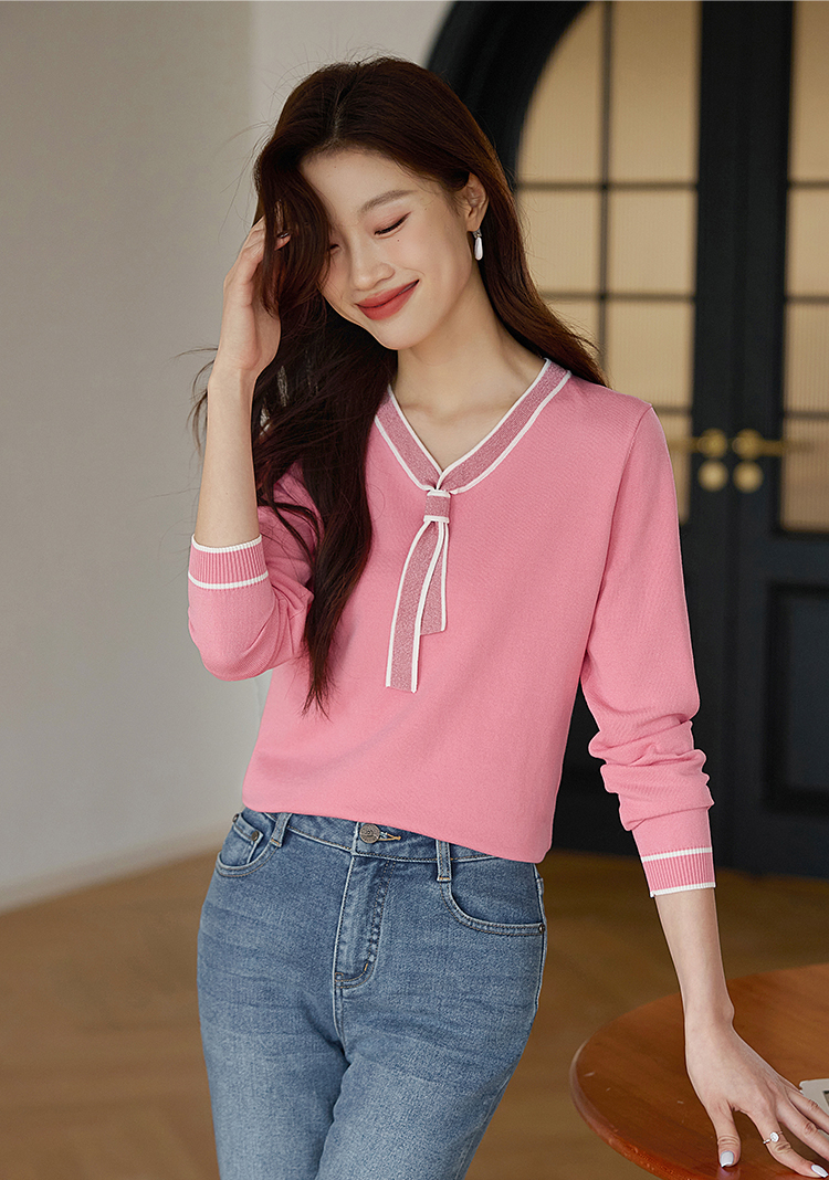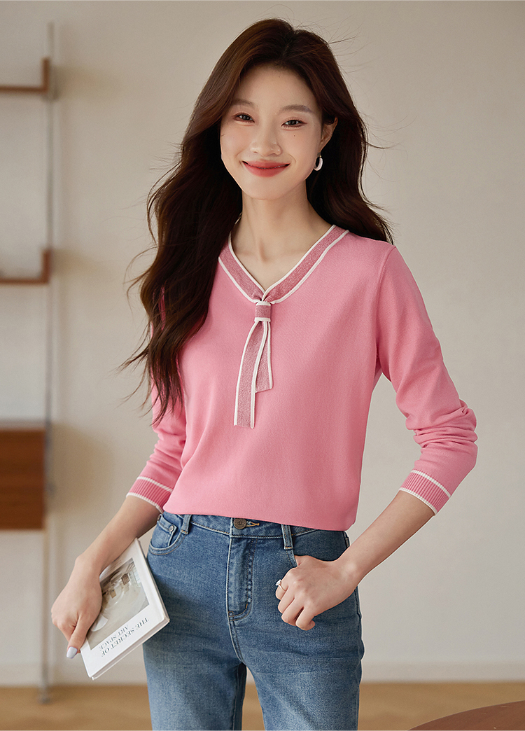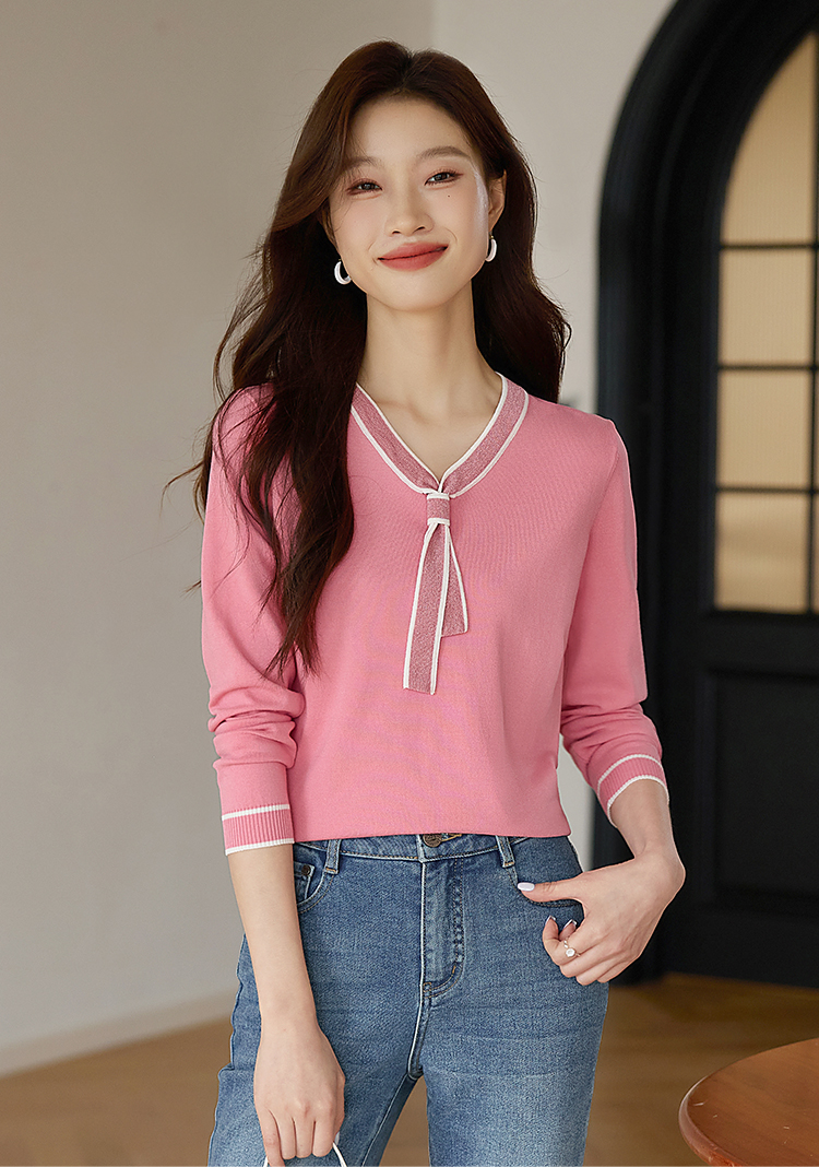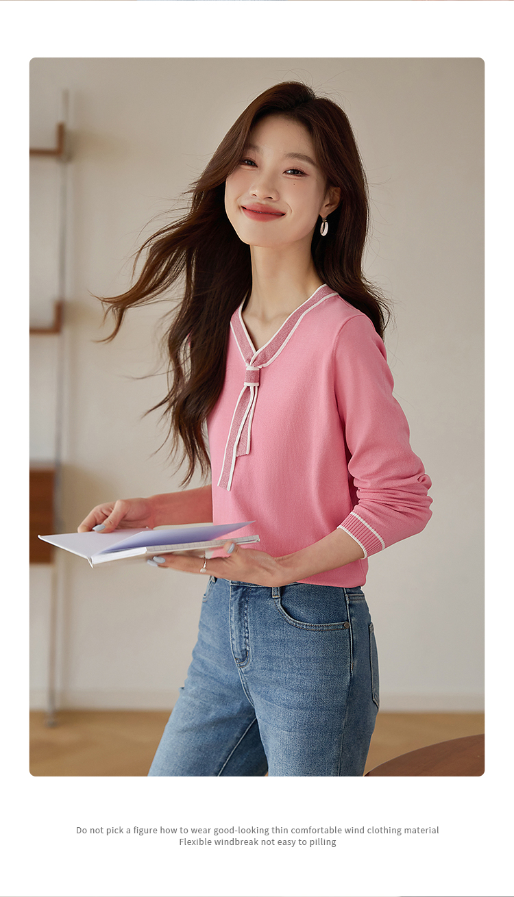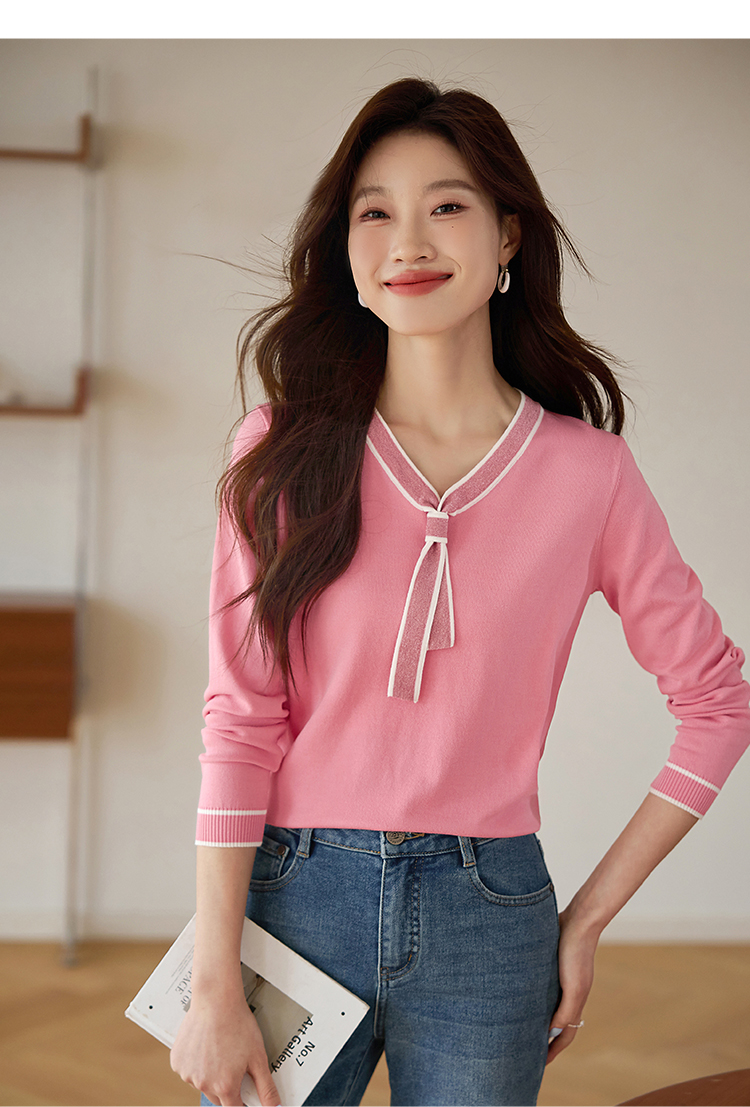 【专属特价】熙世界气质飘带针织衫女秋装新款名媛风撞色V领长袖套头上衣