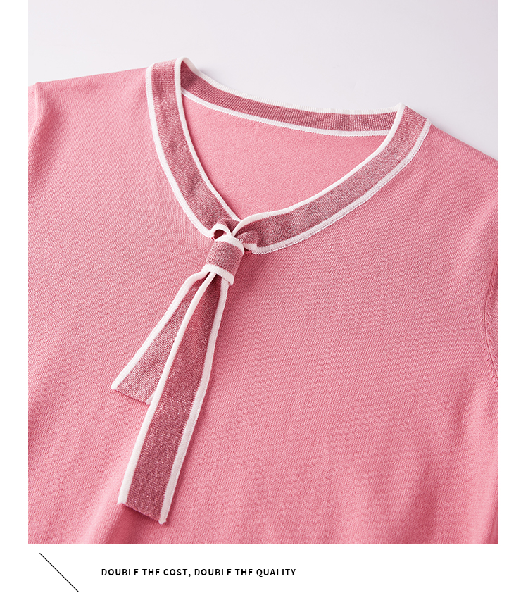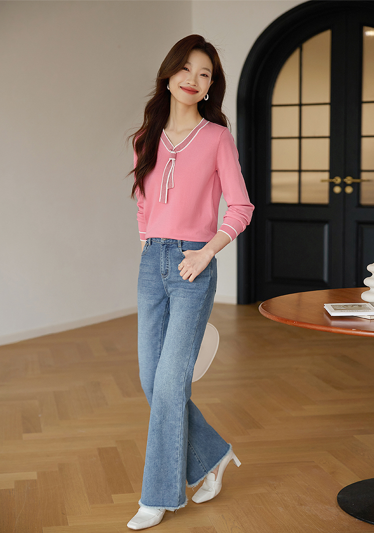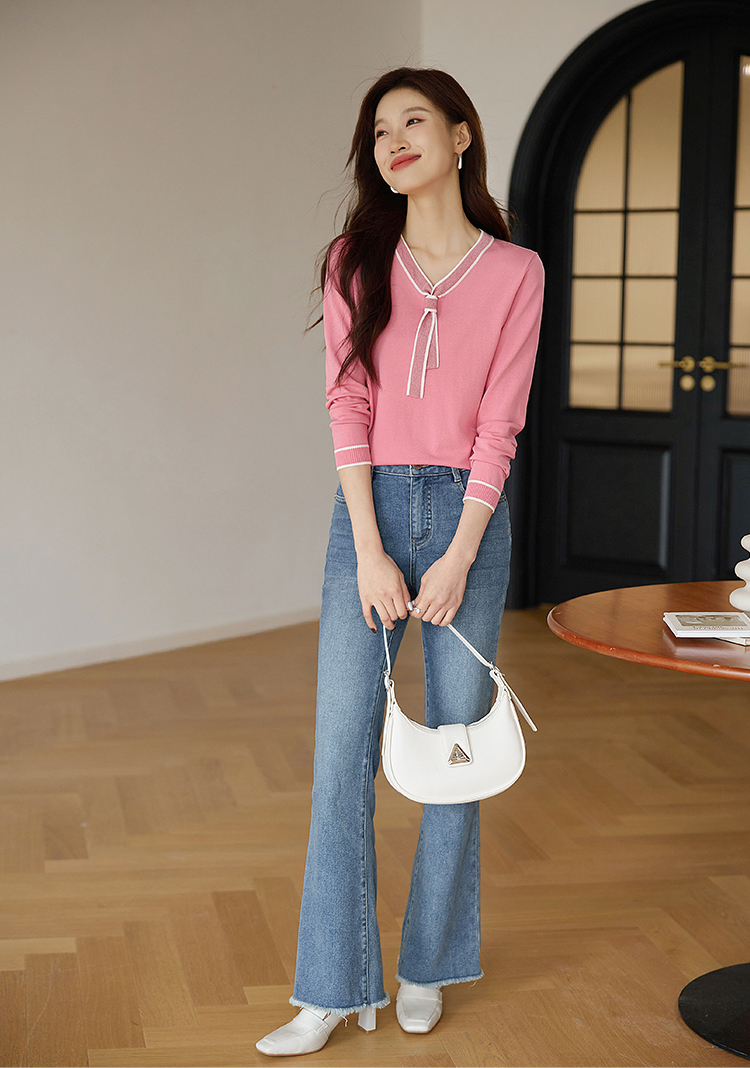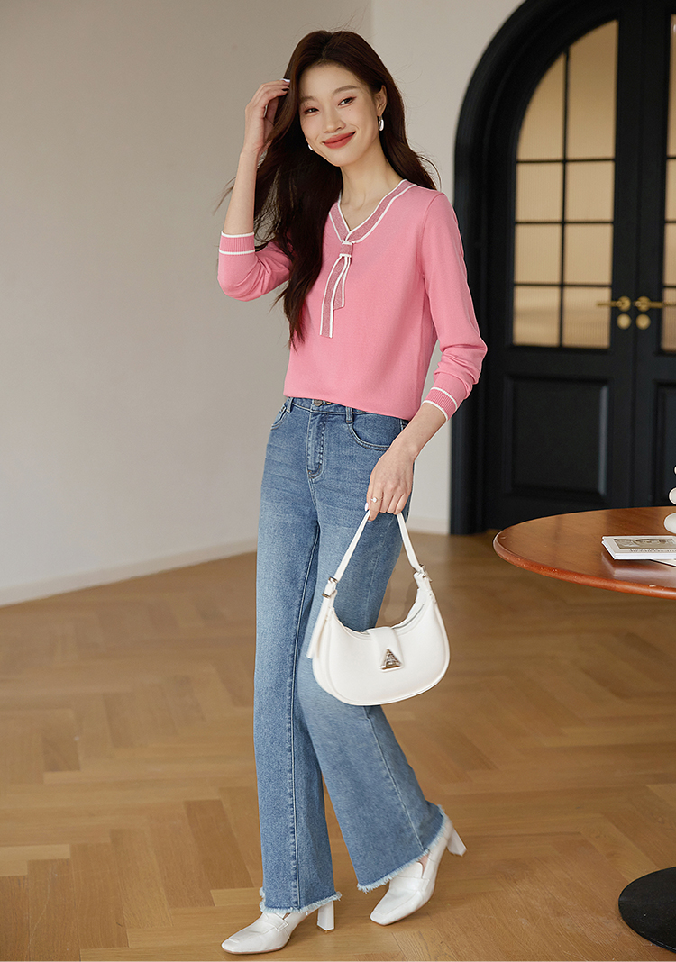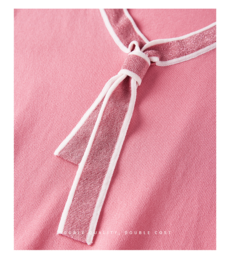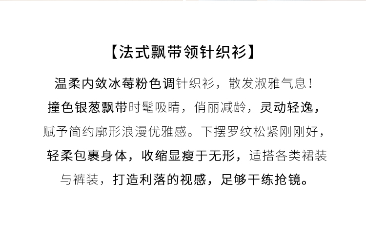 【专属特价】熙世界气质飘带针织衫女秋装新款名媛风撞色V领长袖套头上衣